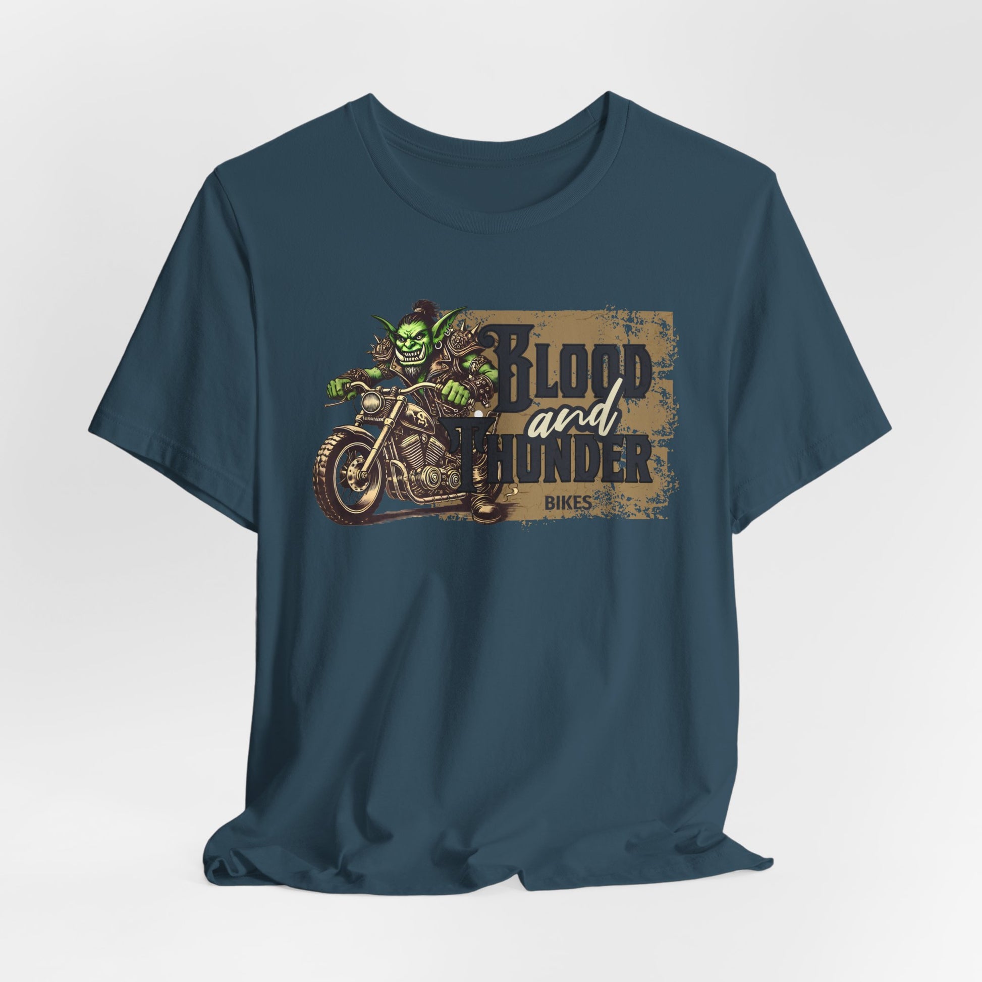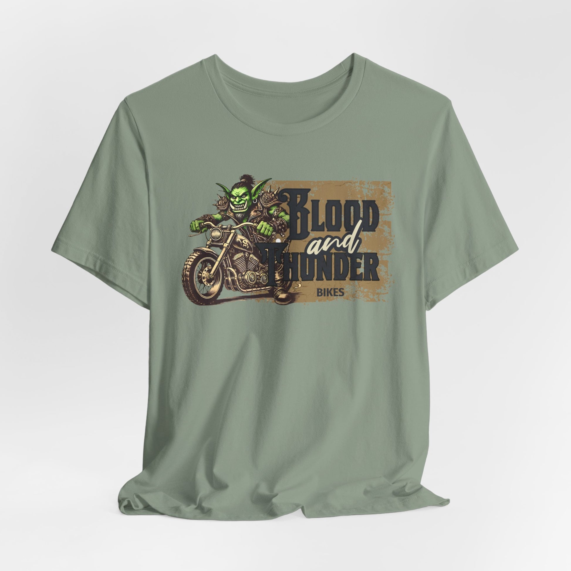 A unique T-Shirt featuring an orc riding a motorcycle with the phrase Blood and Thunder. This design gives off a cool and edgy vibe, perfect for fans of fantasy or motorcycle culture. Ideal for birthdays, comic conventions, or everyday wear.