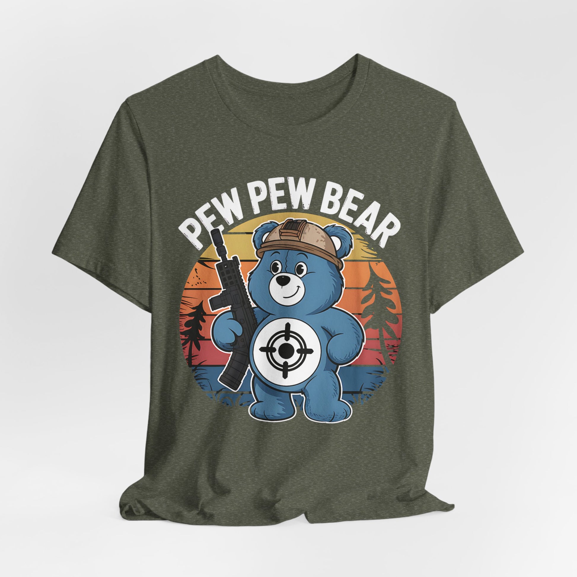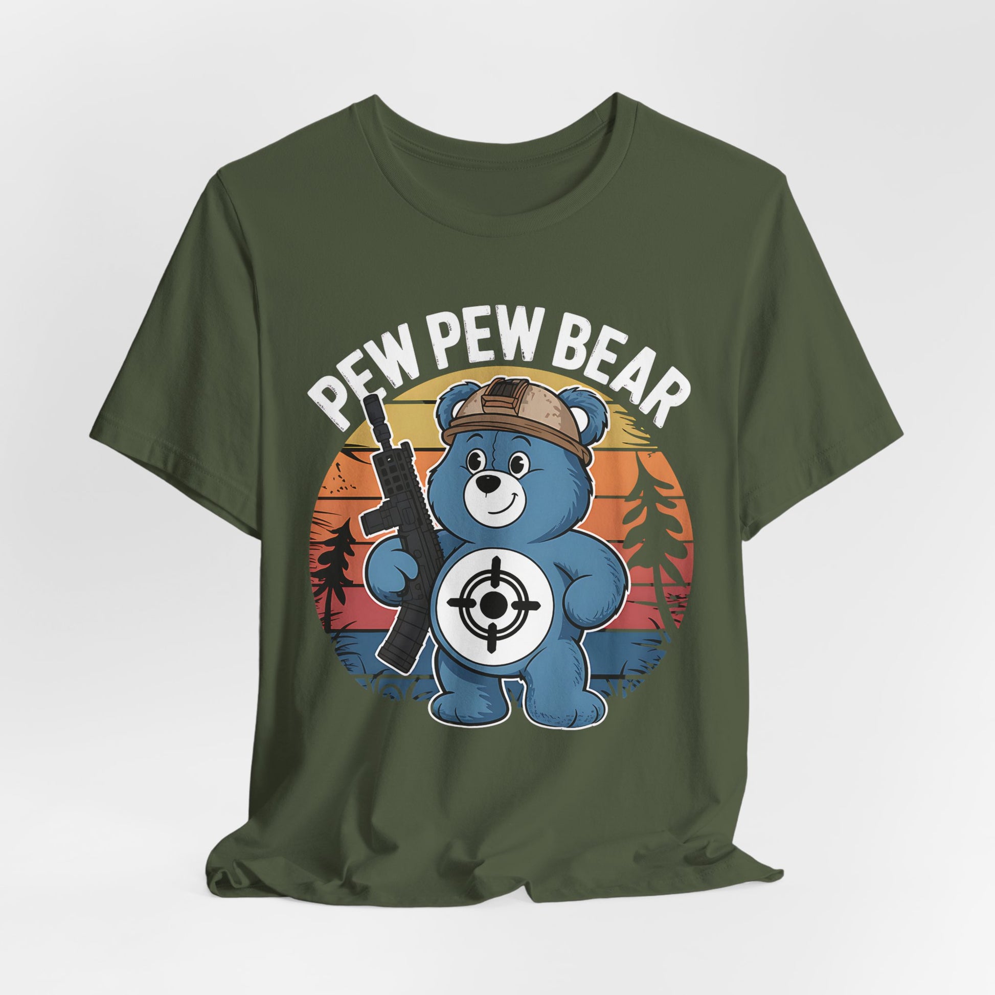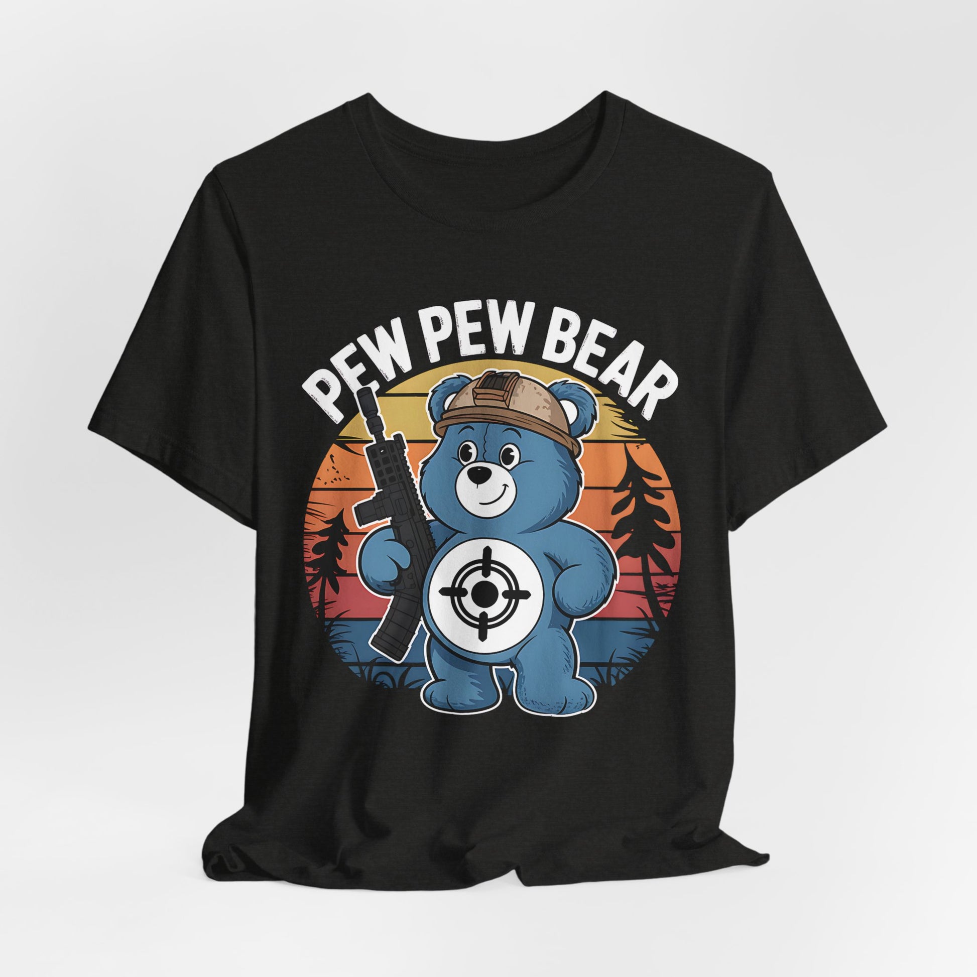 A fun T-shirt featuring a classic care bear design with the words 'pew pew bear'.