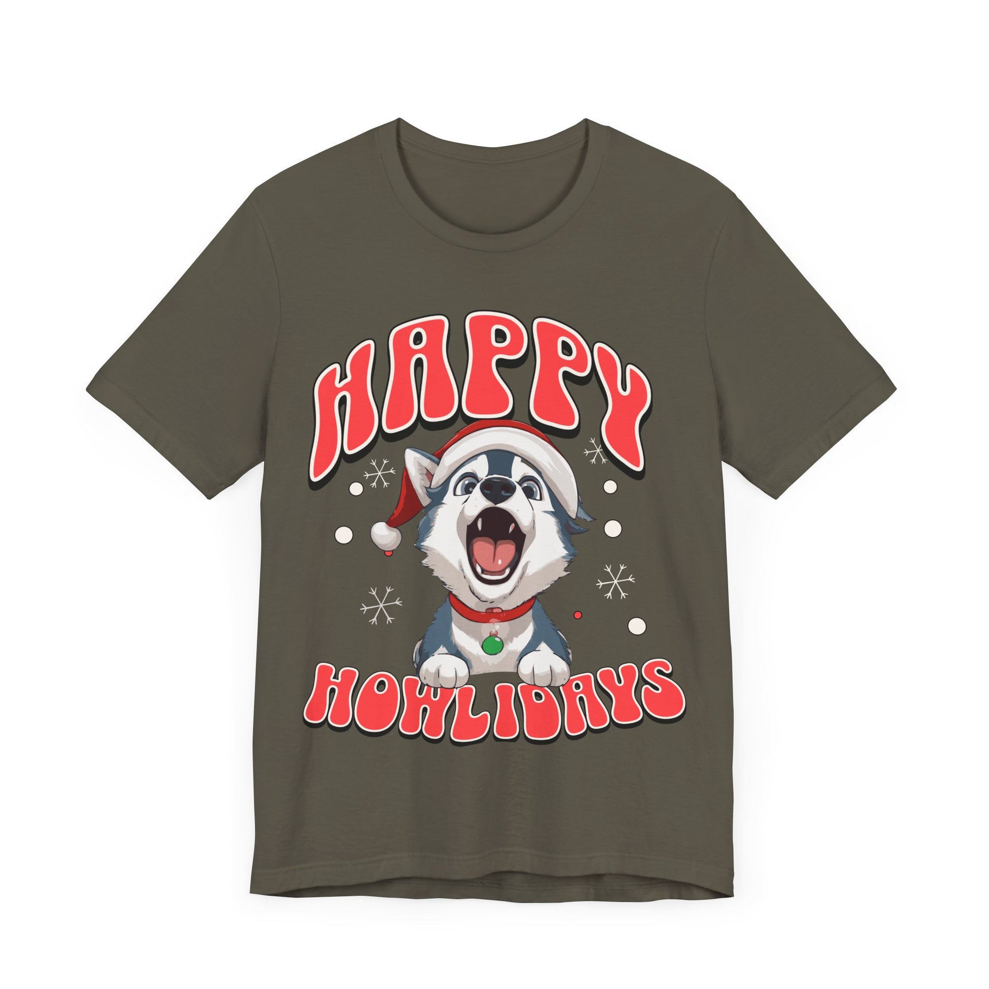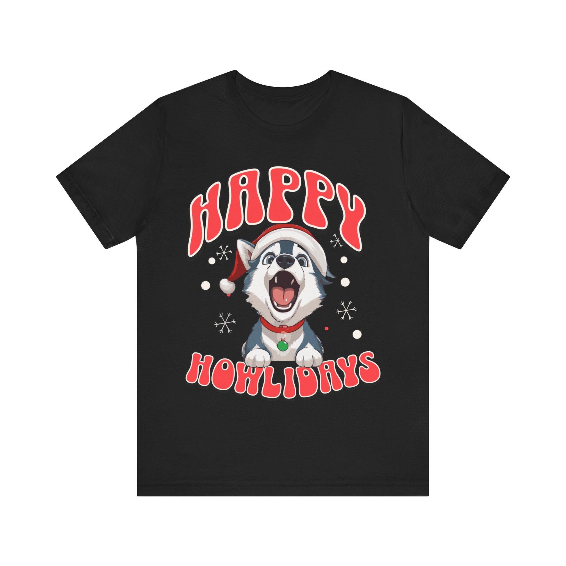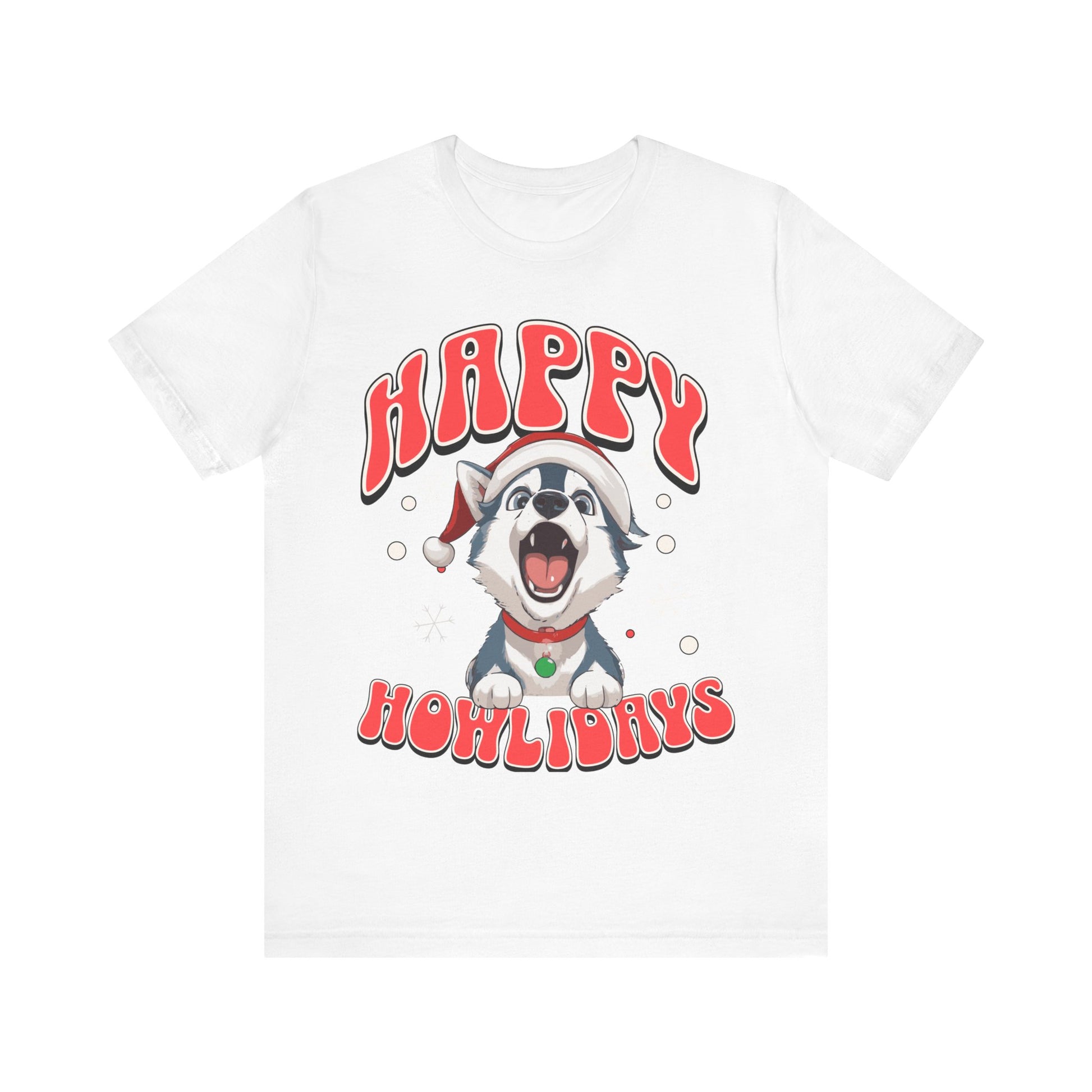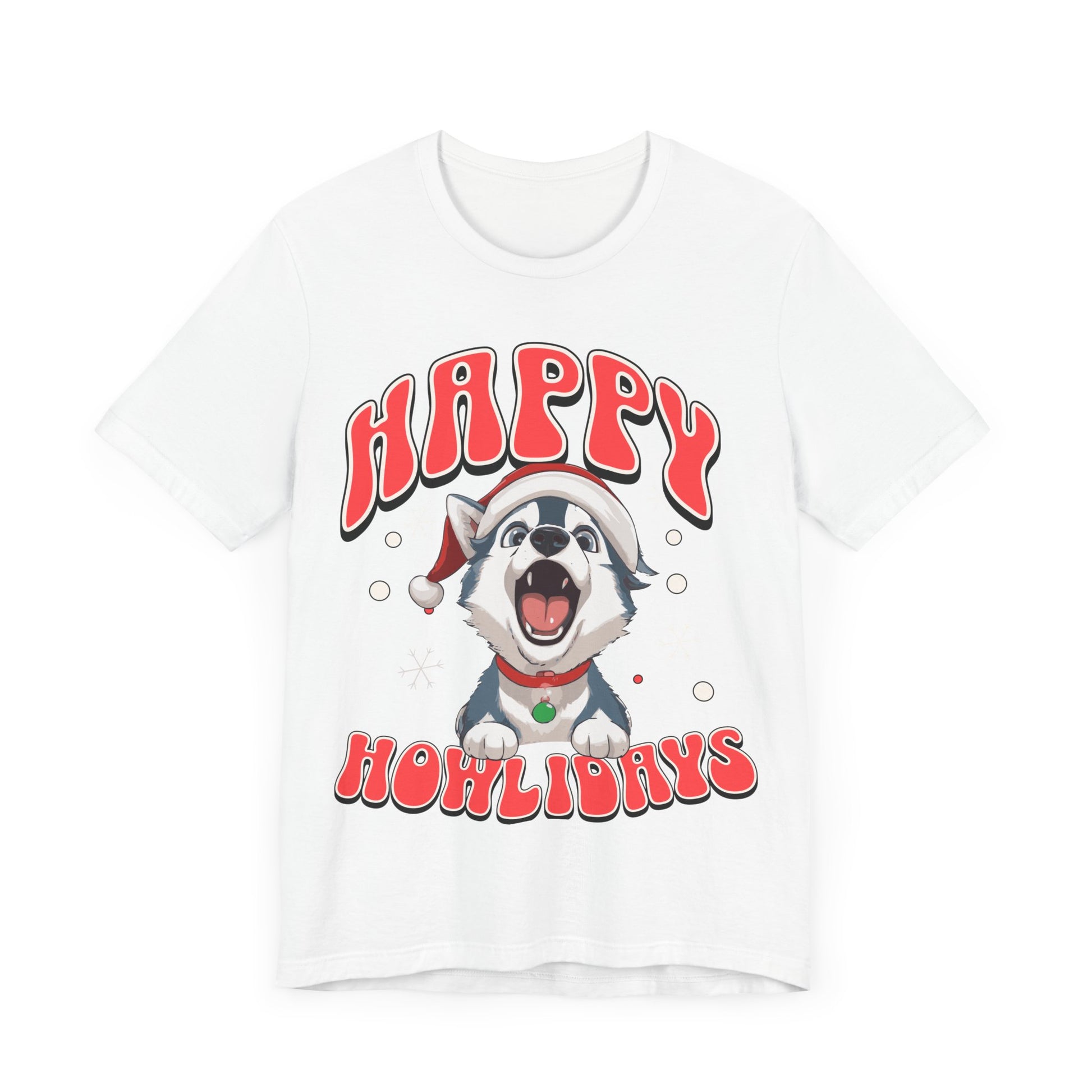 Embrace the holiday spirit with our 'Happy Howlidays' Christmas t-shirt, designed to make you howl with joy all season long. Wear it proudly and let the festivities begin!