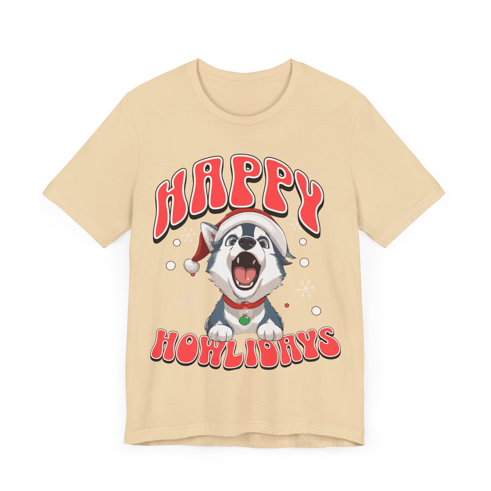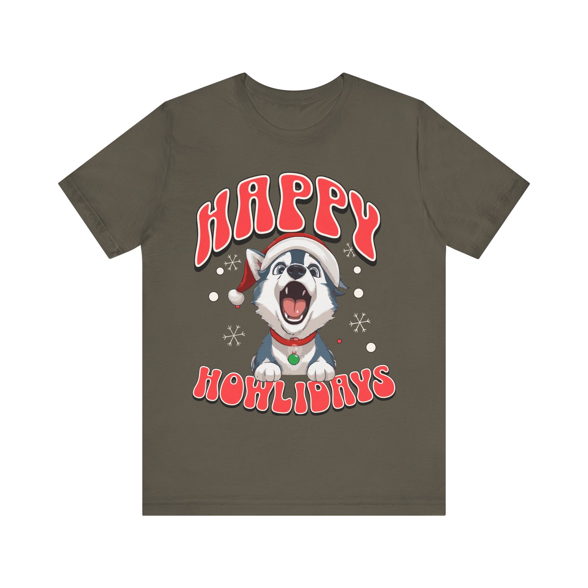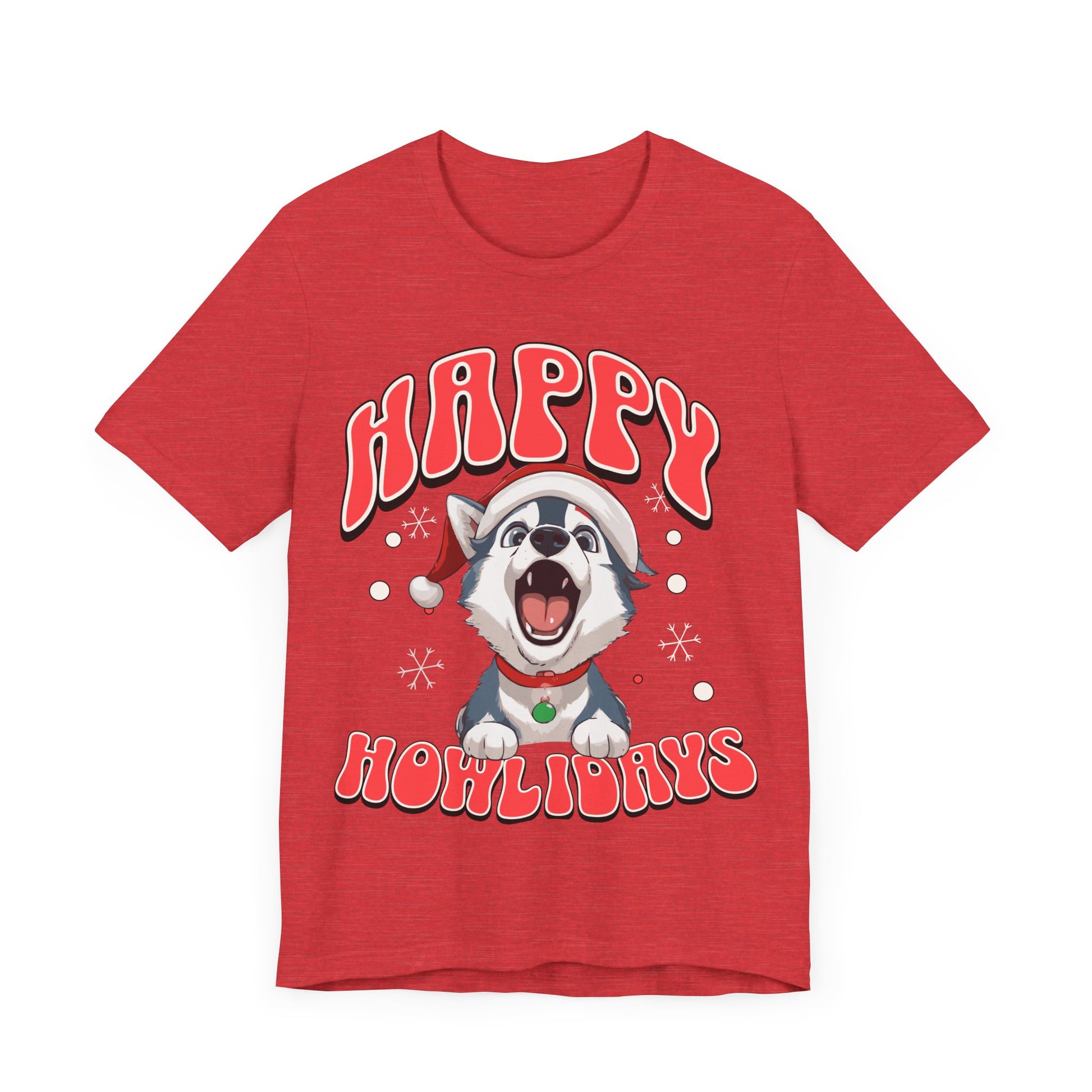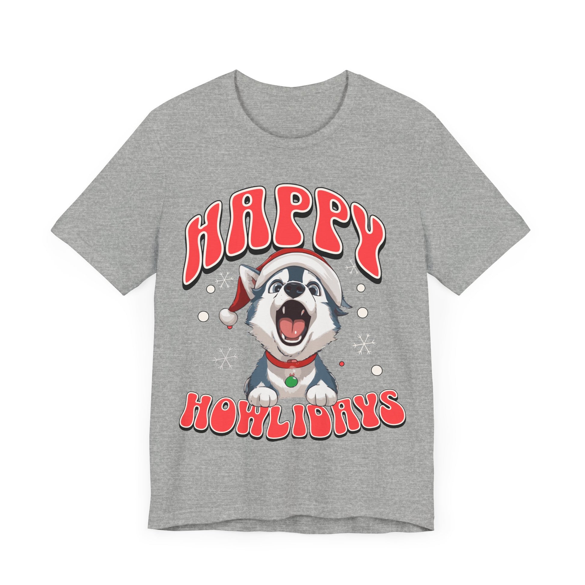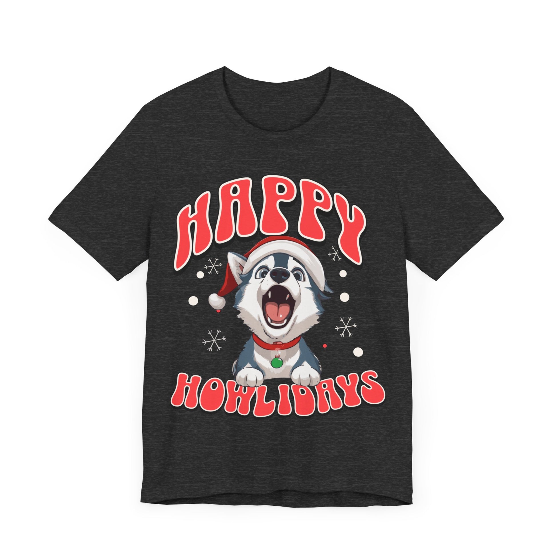 Embrace the holiday spirit with our 'Happy Howlidays' Christmas t-shirt, designed to make you howl with joy all season long. Wear it proudly and let the festivities begin!