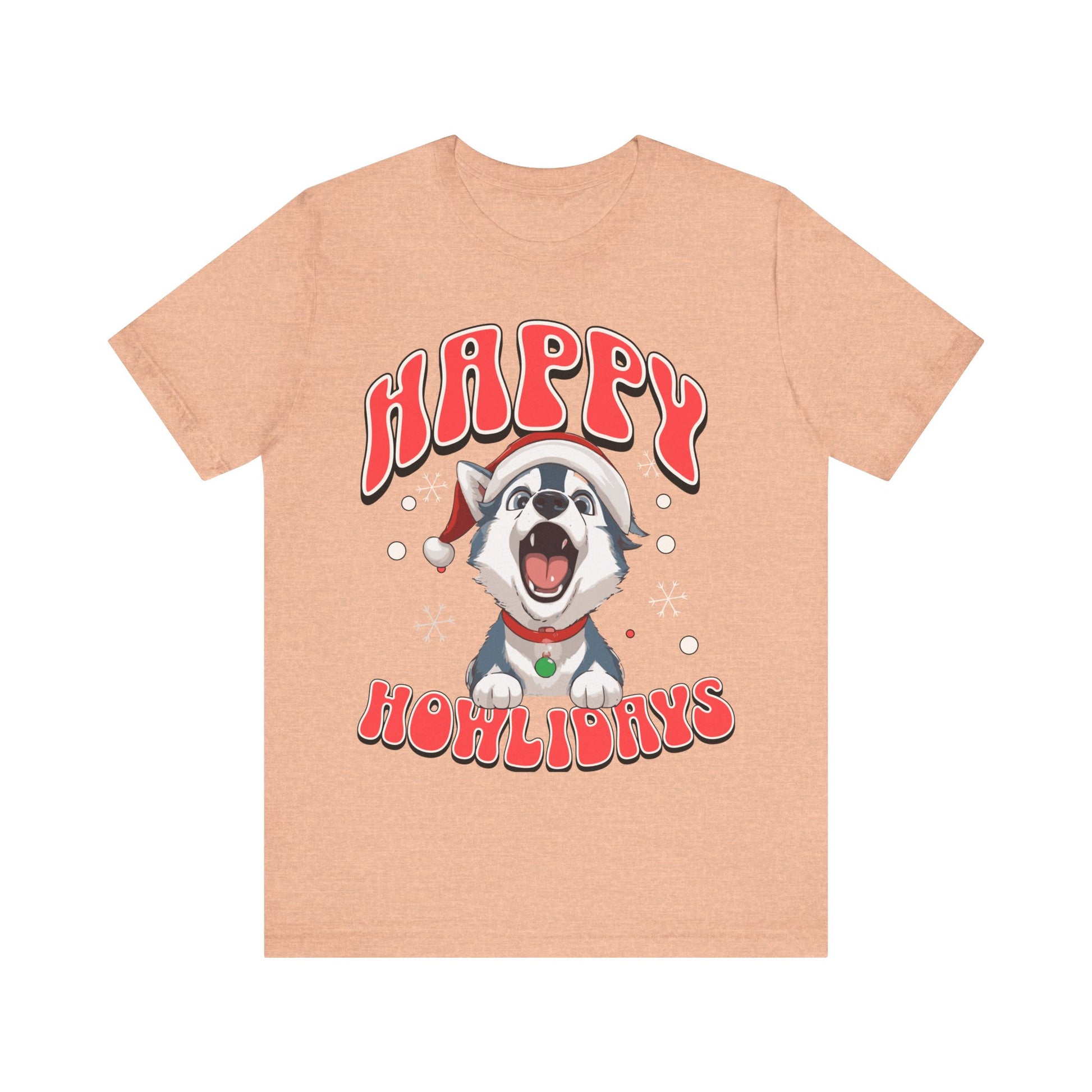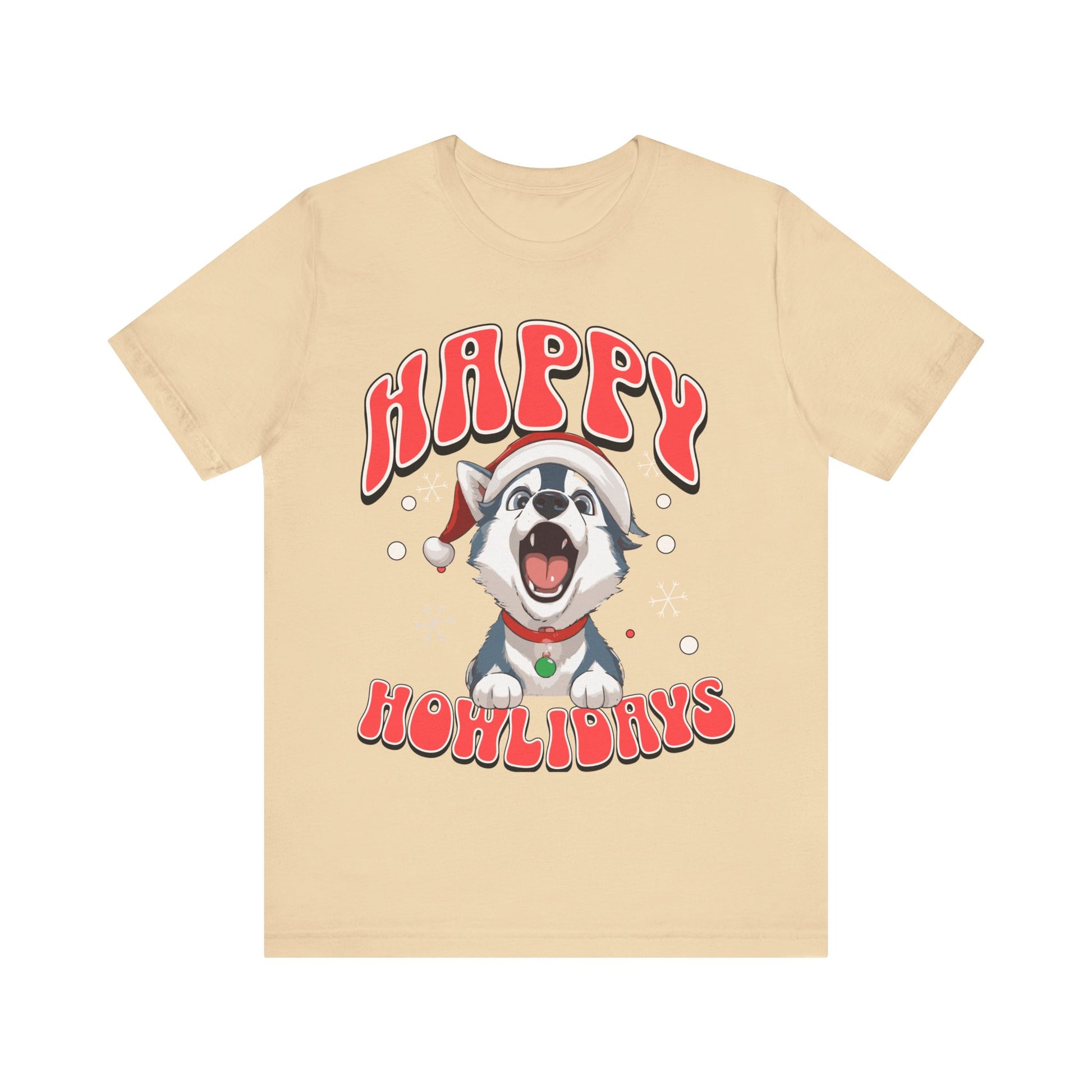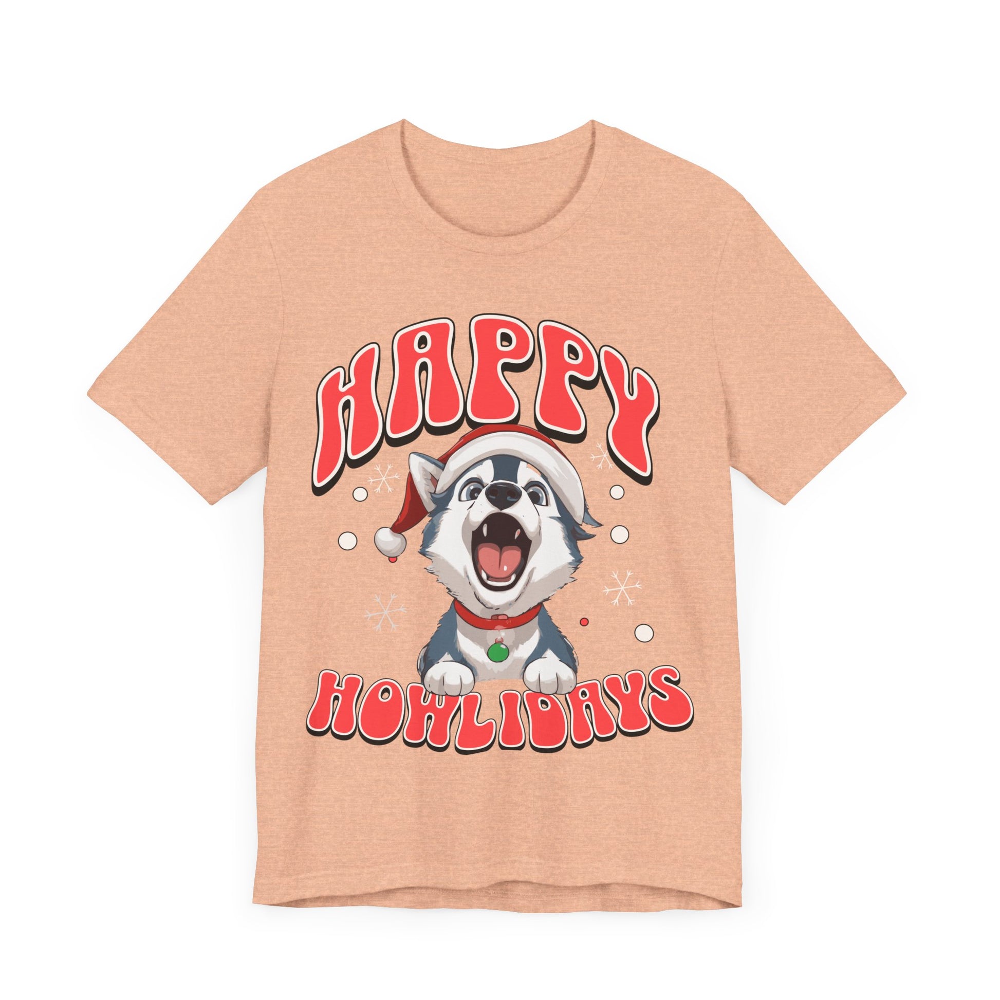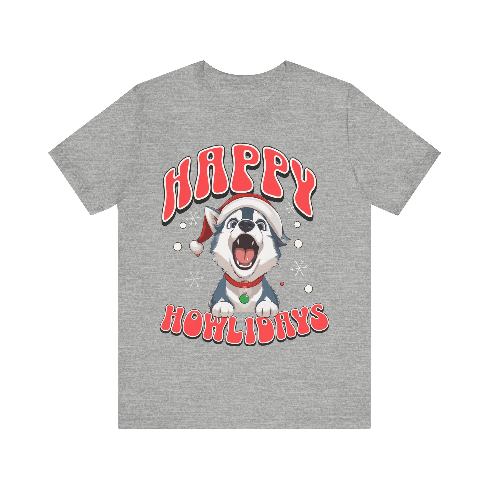 Embrace the holiday spirit with our 'Happy Howlidays' Christmas t-shirt, designed to make you howl with joy all season long. Wear it proudly and let the festivities begin!