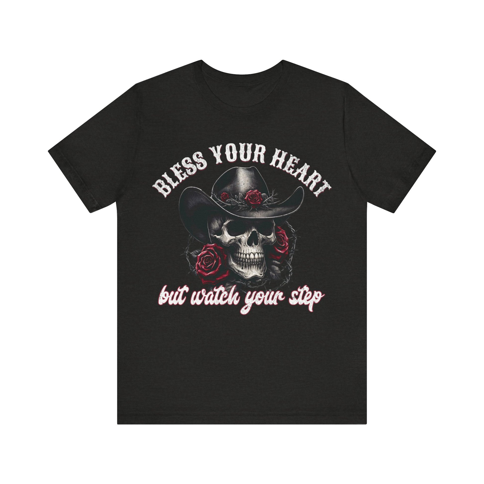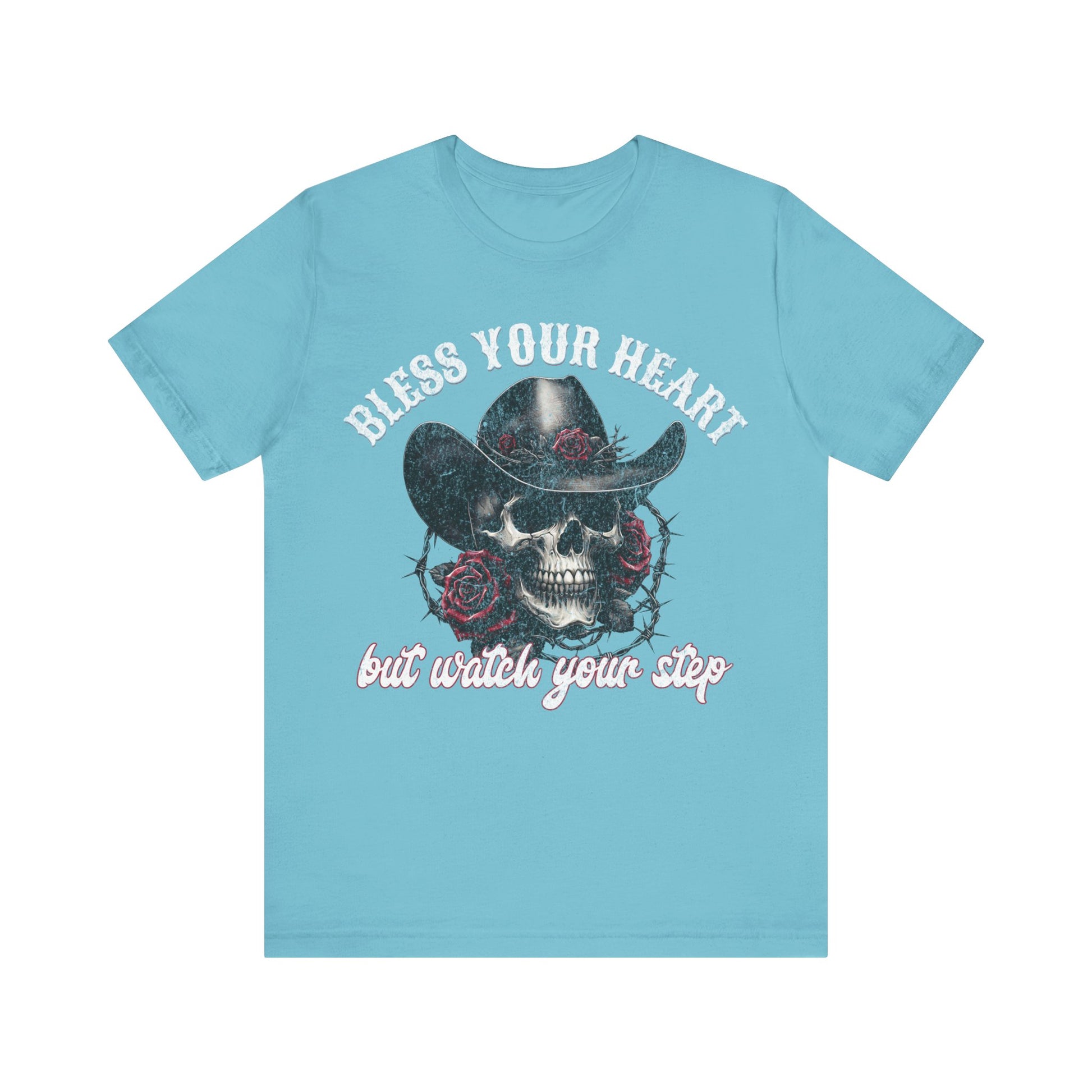 This T-Shirt featuring a skull wearing a cowboy hat with the phrase 'bless your heart but watch your step' gives off a cool, edgy vibe. It is perfect for casual outings and can be layered for different looks. Ideal for those who enjoy unique and bold designs, this shirt is relevant for Halloween, country-western events, and casual everyday wear.