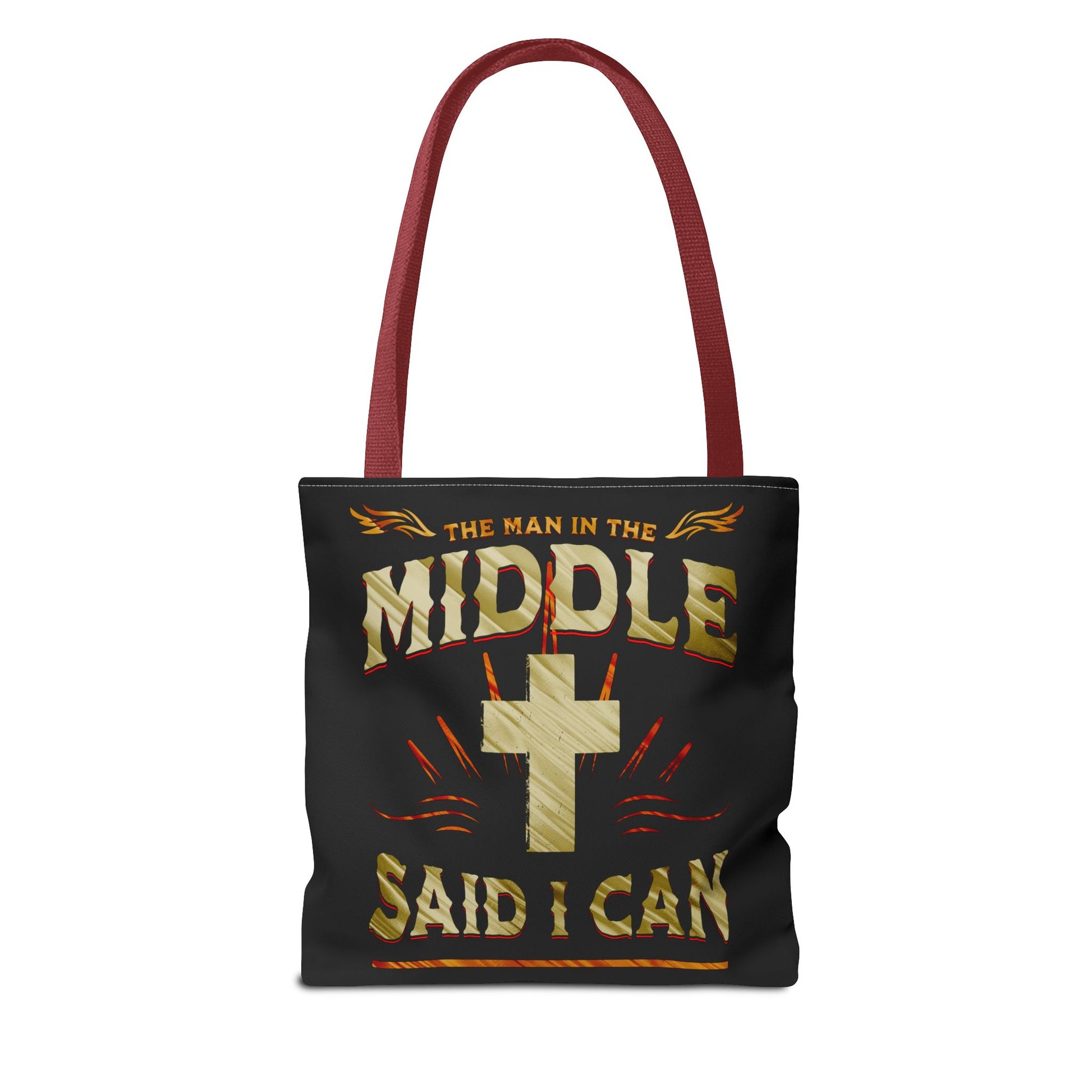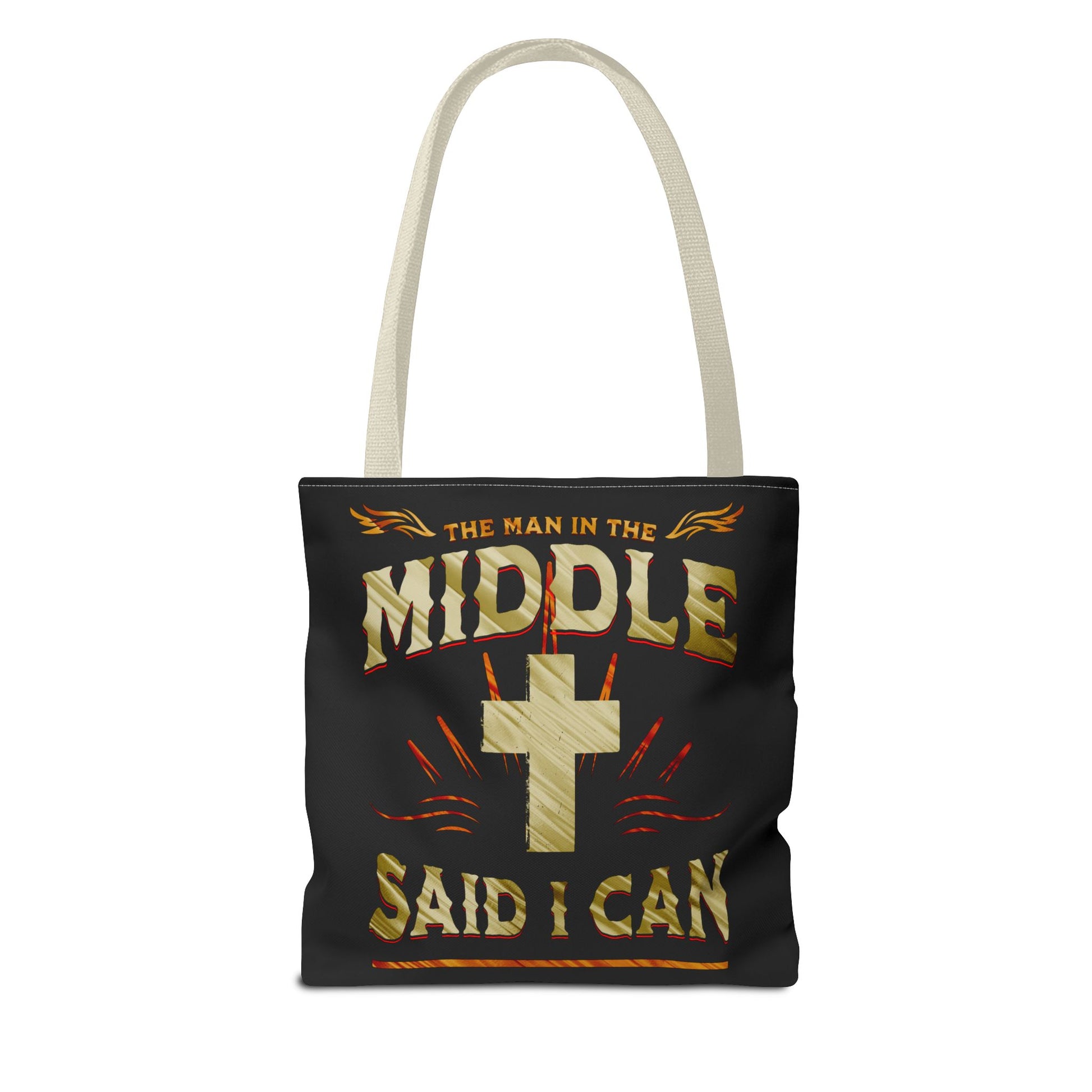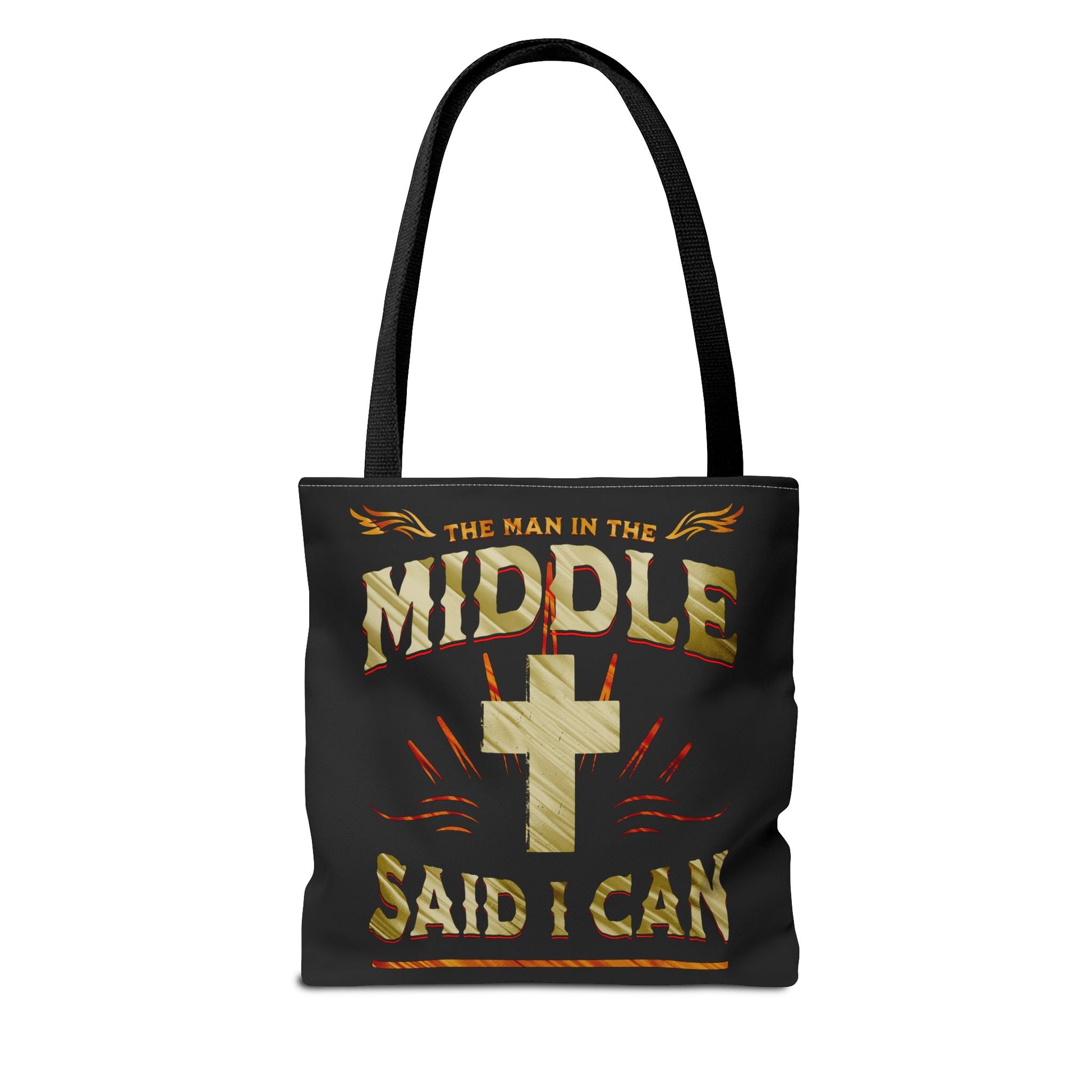Step out with confidence and faith with this bold and empowering tote bag! Featuring the striking phrase "The Man in the Middle Said I Can", this design serves as a daily reminder of strength, grace, and divine encouragement.