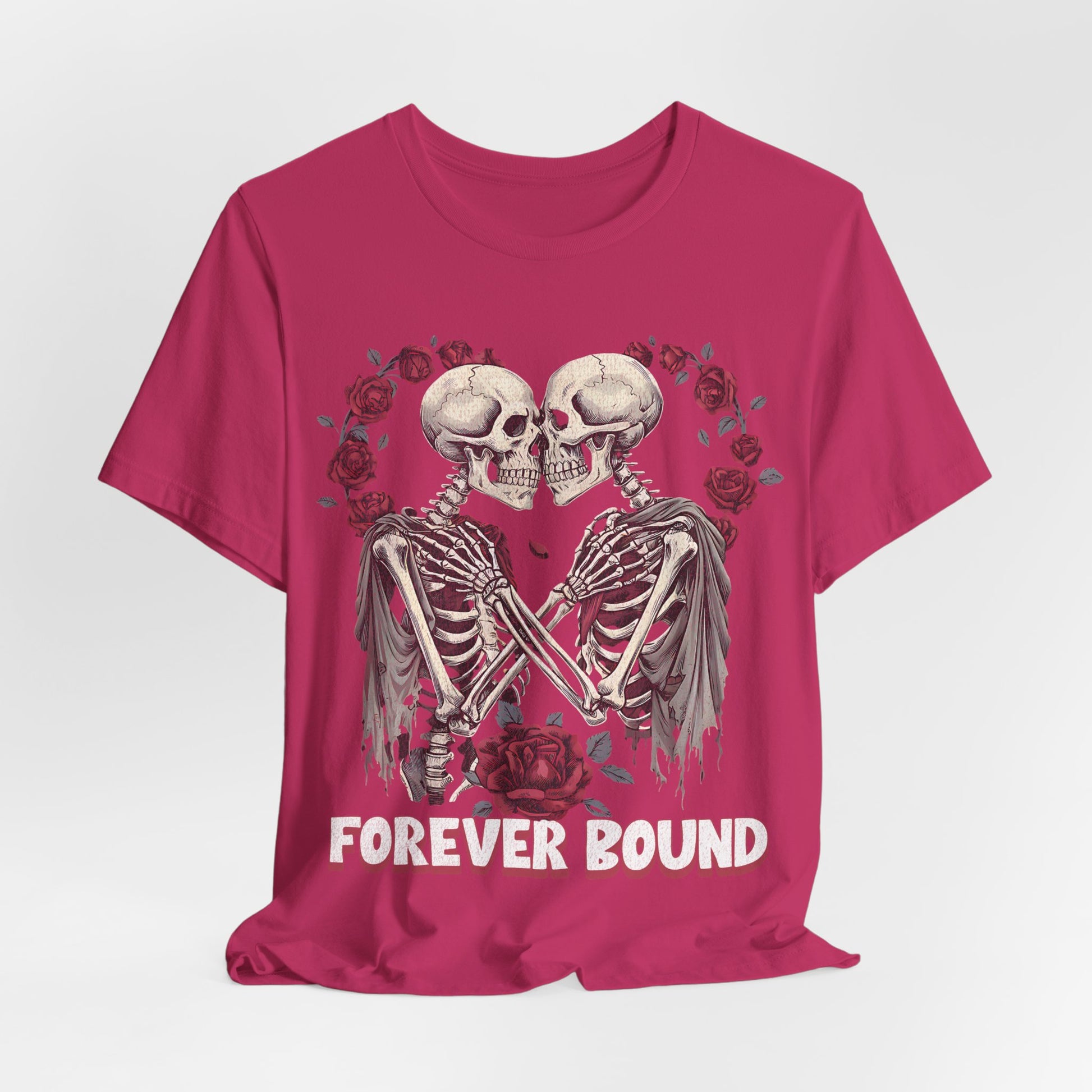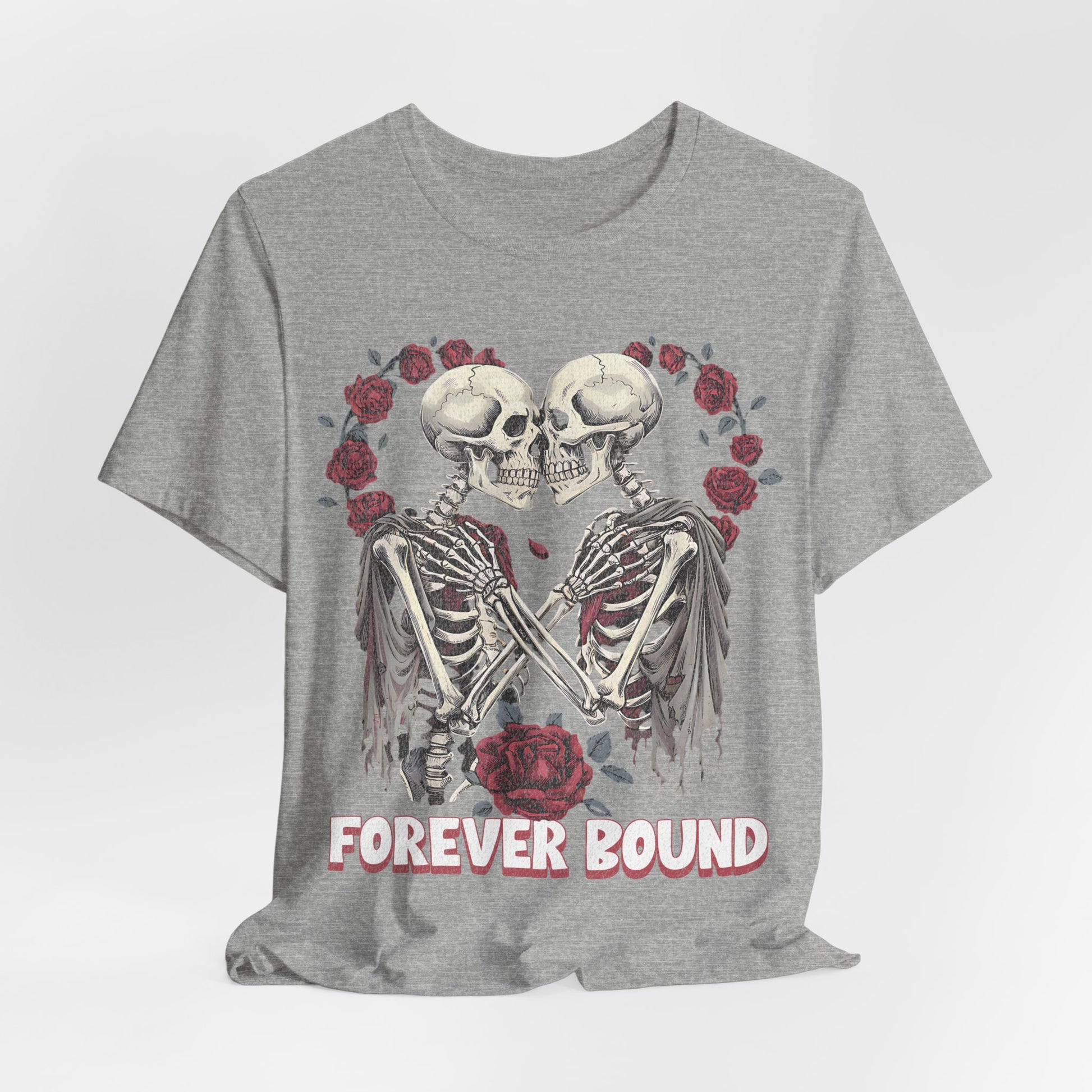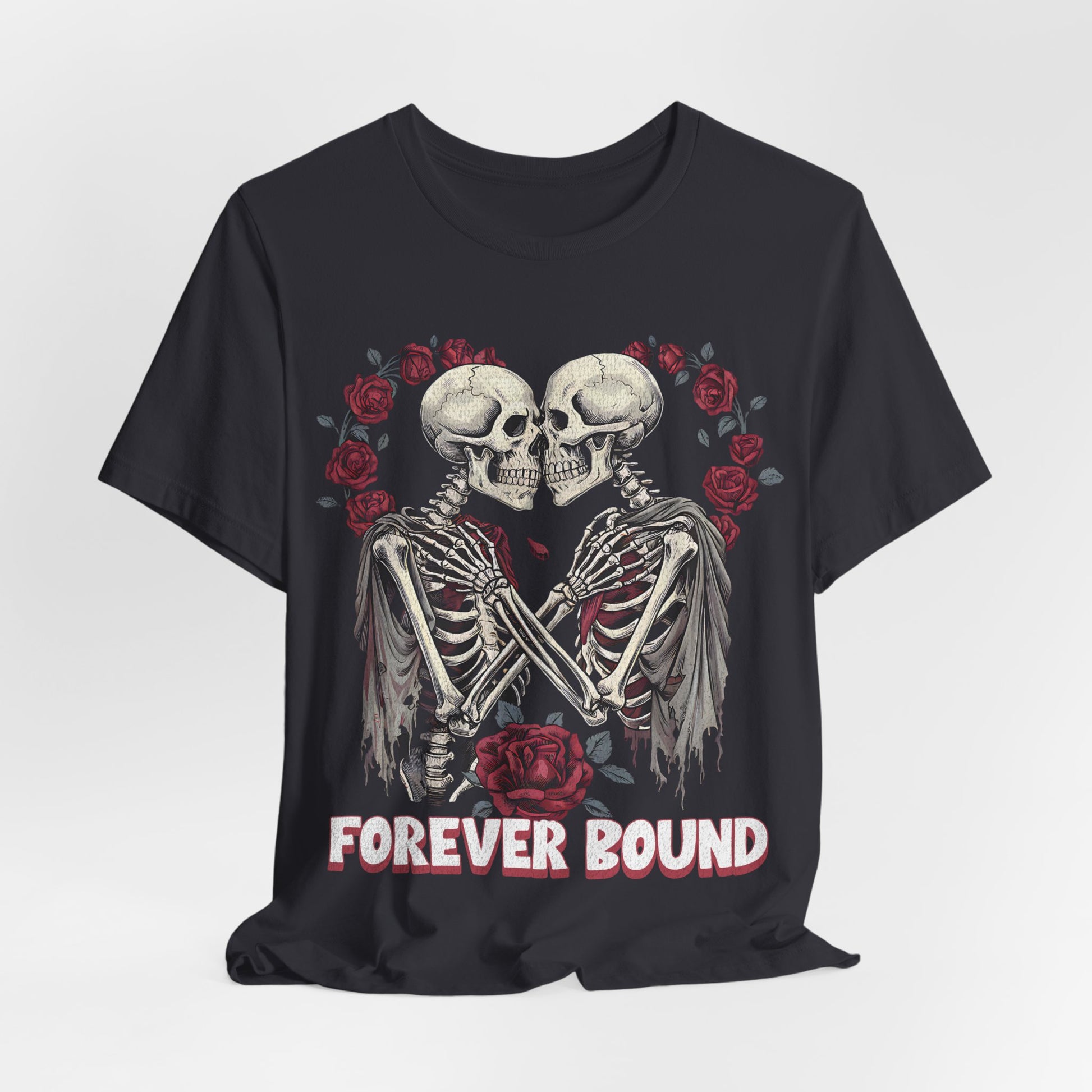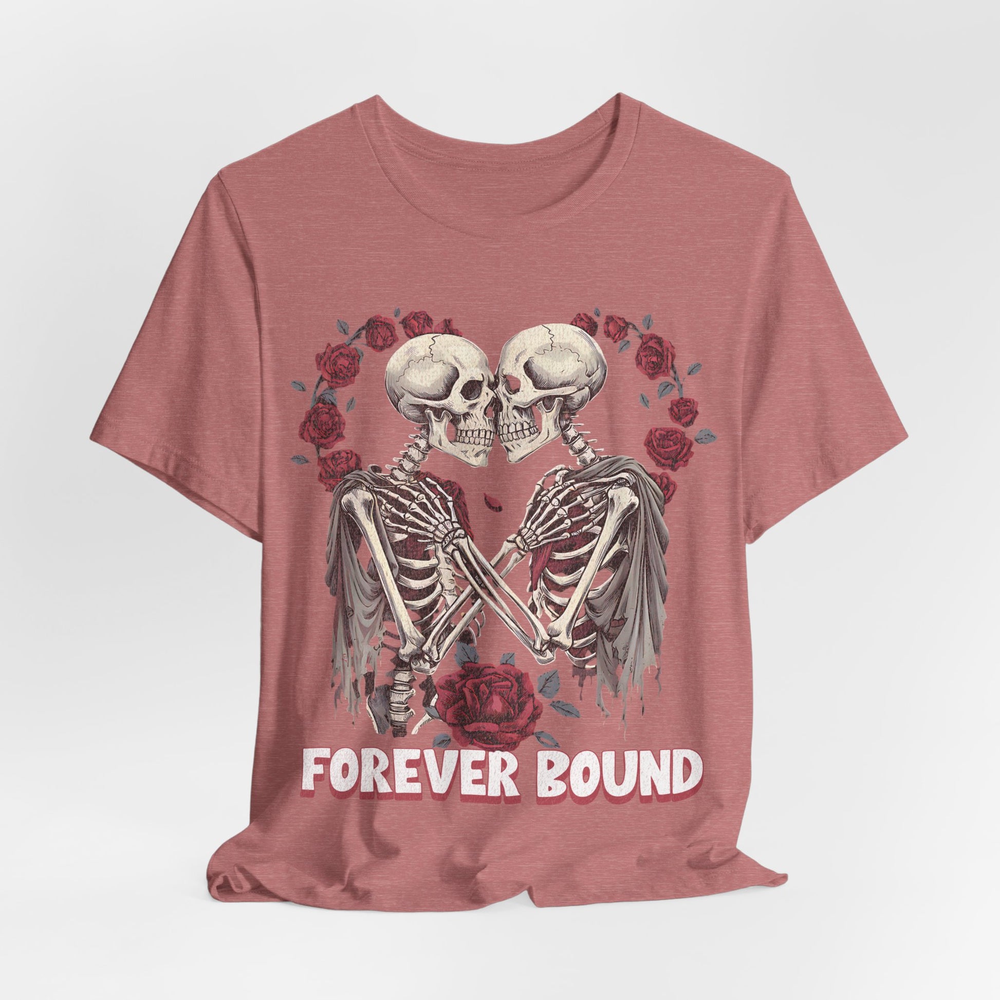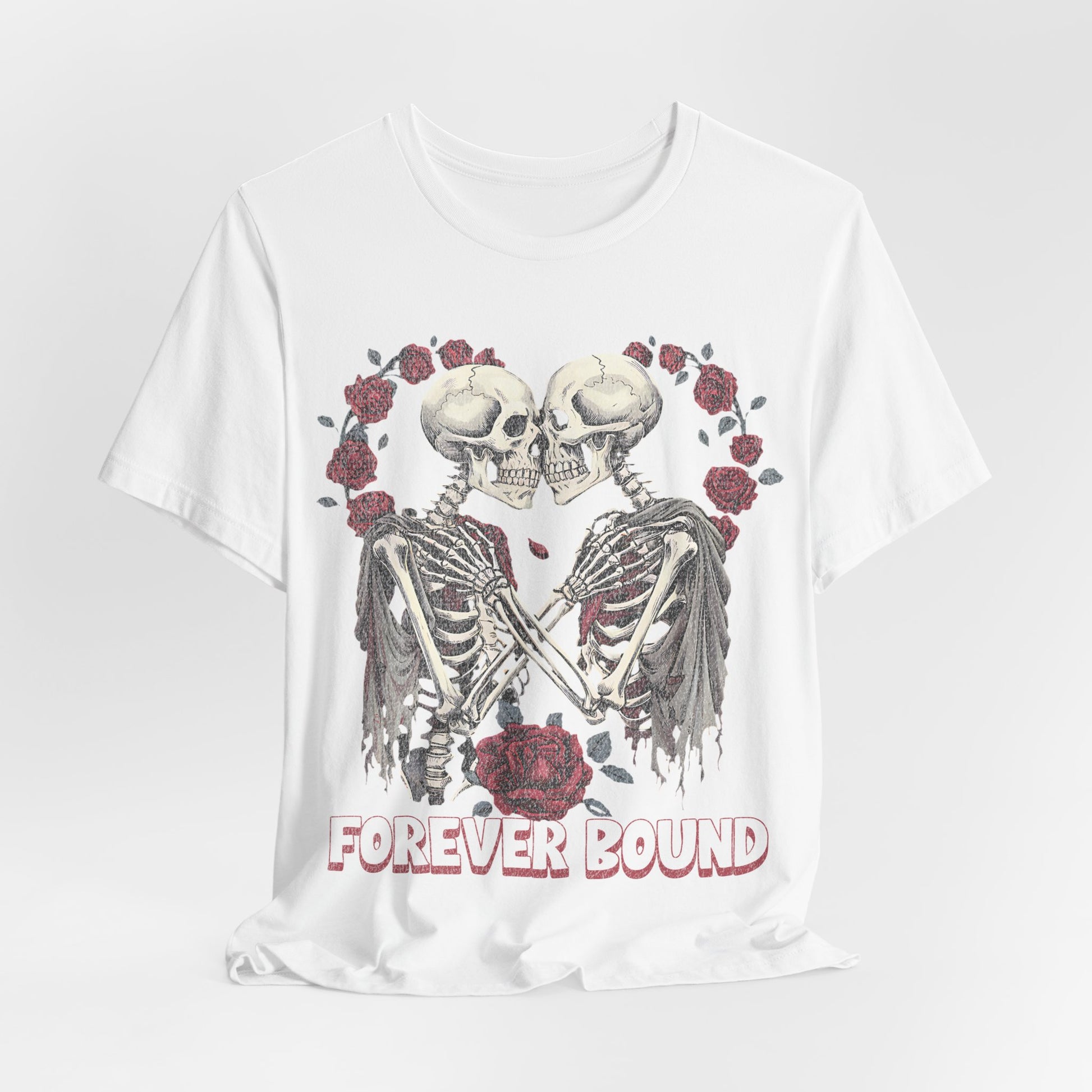 A comfortable T-shirt with a design that says forever bound, perfect for Valentine's Day. This shirt is perfect for casual wear, making a statement of love and connection. It is relevant to those celebrating Valentine's Day or expressing love to their partners.