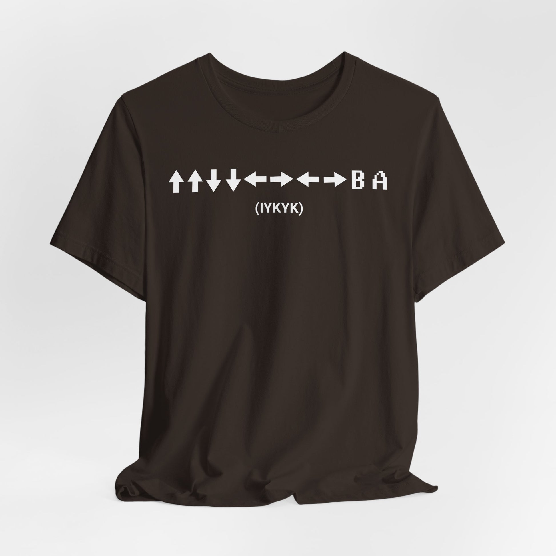 A gaming t-shirt featuring the old gaming cheat code design. Perfect for gamers looking to showcase their love for retro gaming. Ideal for casual wear and gaming events.
