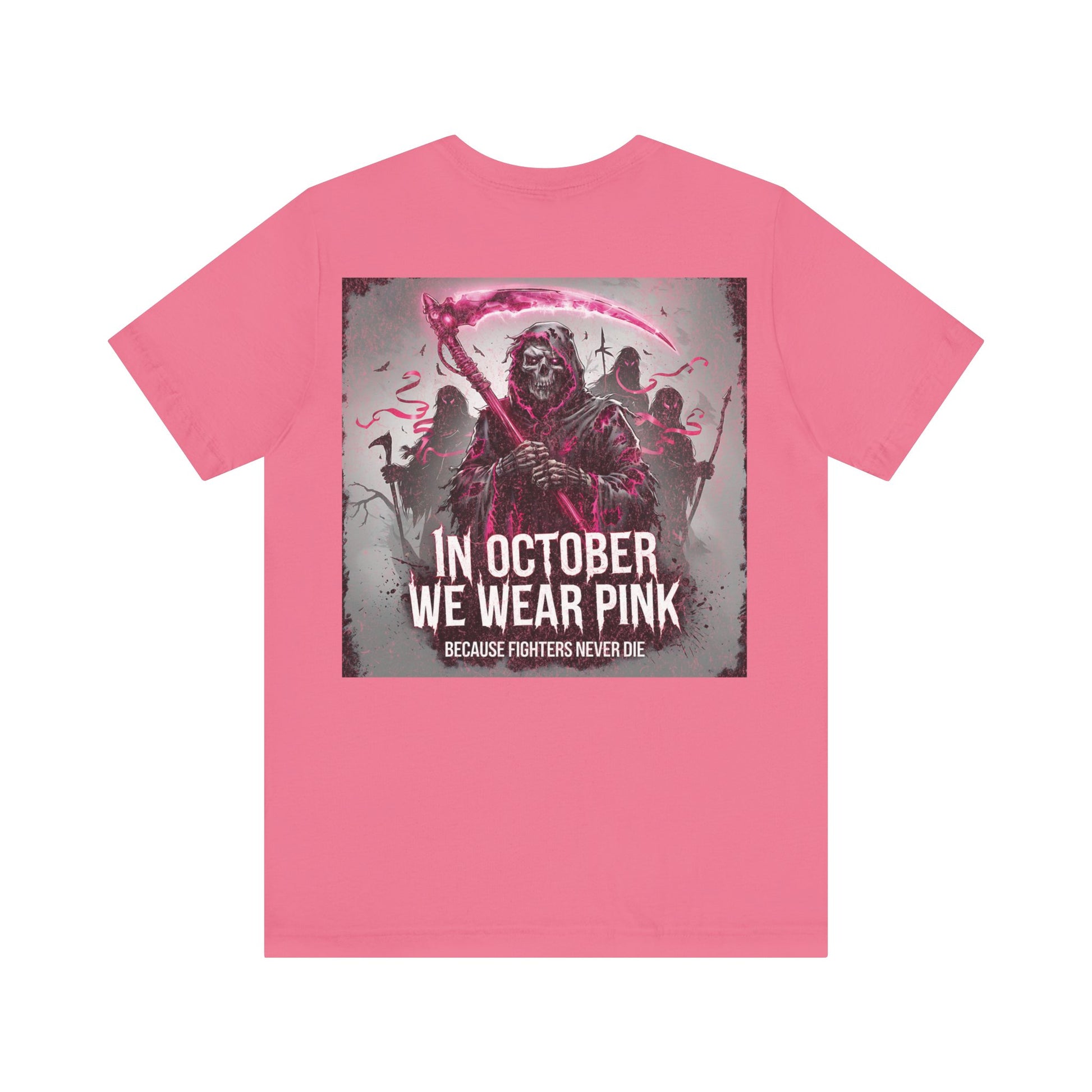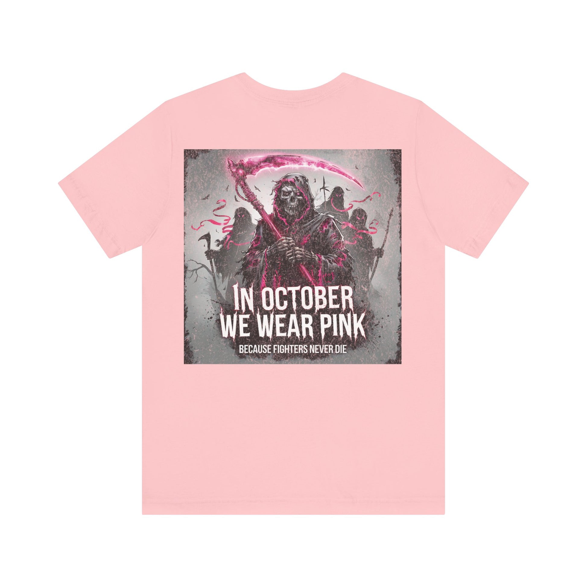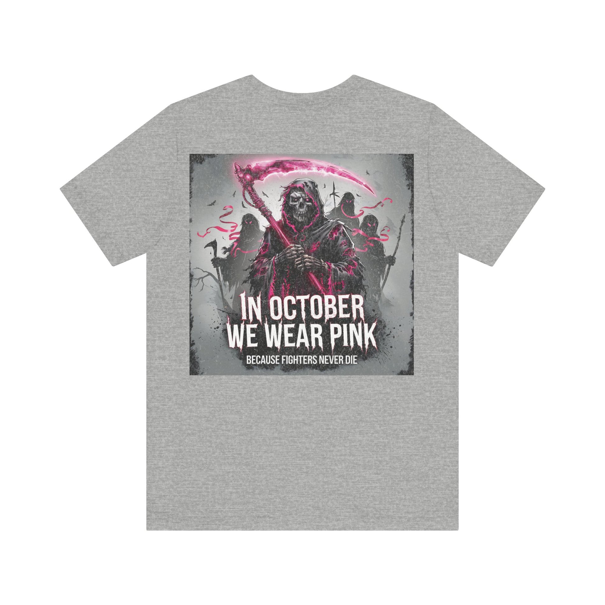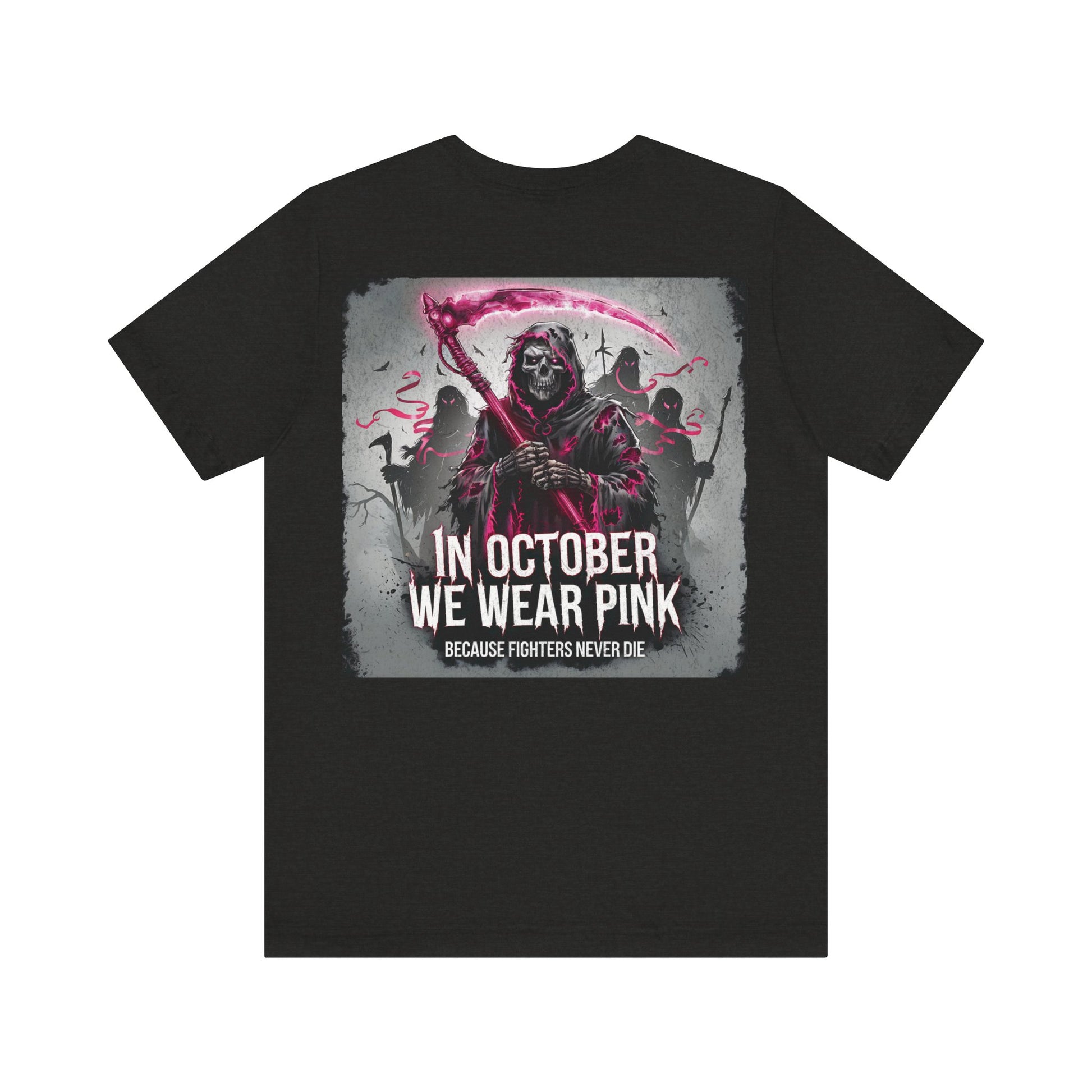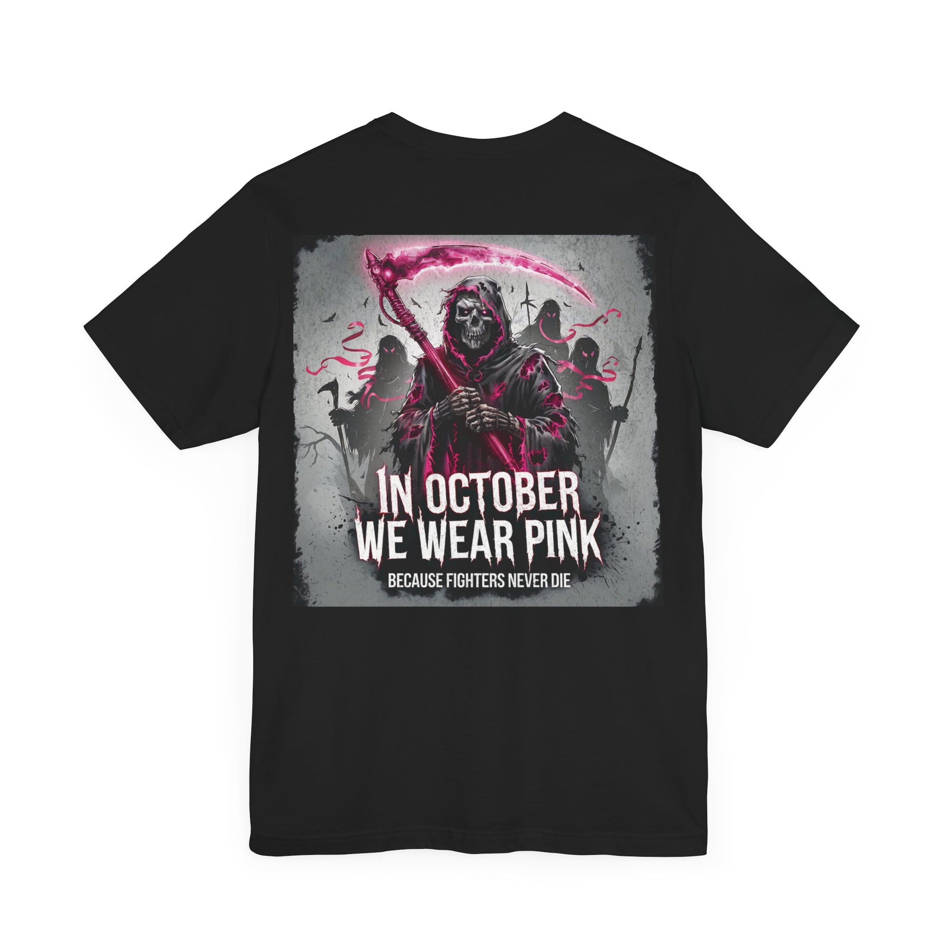 A comfortable and breathable T-shirt featuring a design of a grim reaper with the phrase 'In October We Wear Pink'. Perfect for those who enjoy a touch of spookiness during Breast Cancer Awareness Month. This shirt is ideal for casual wear, layering, and expressing individual style.