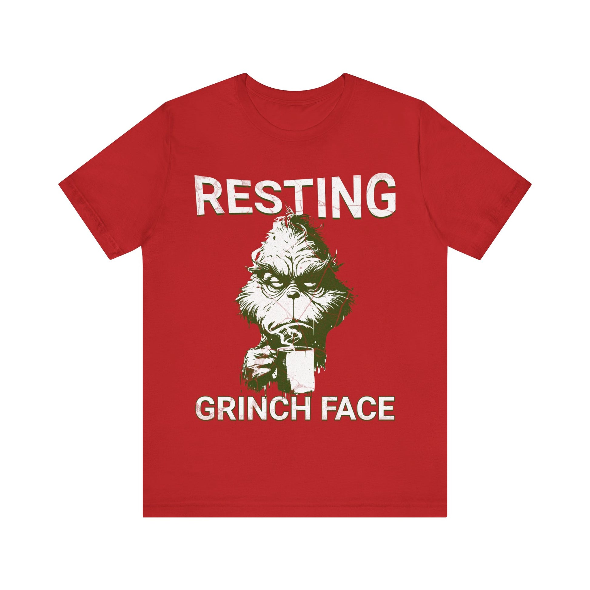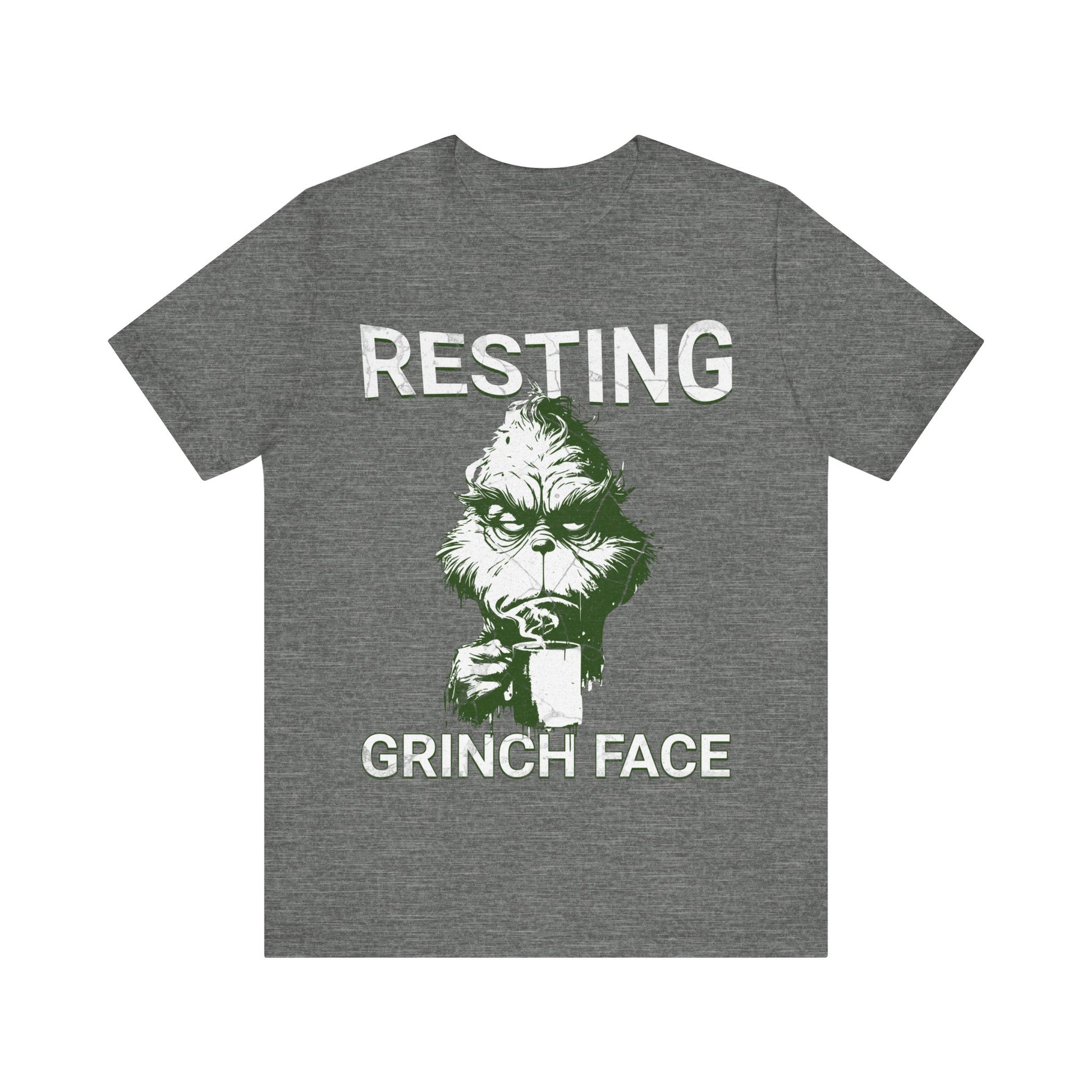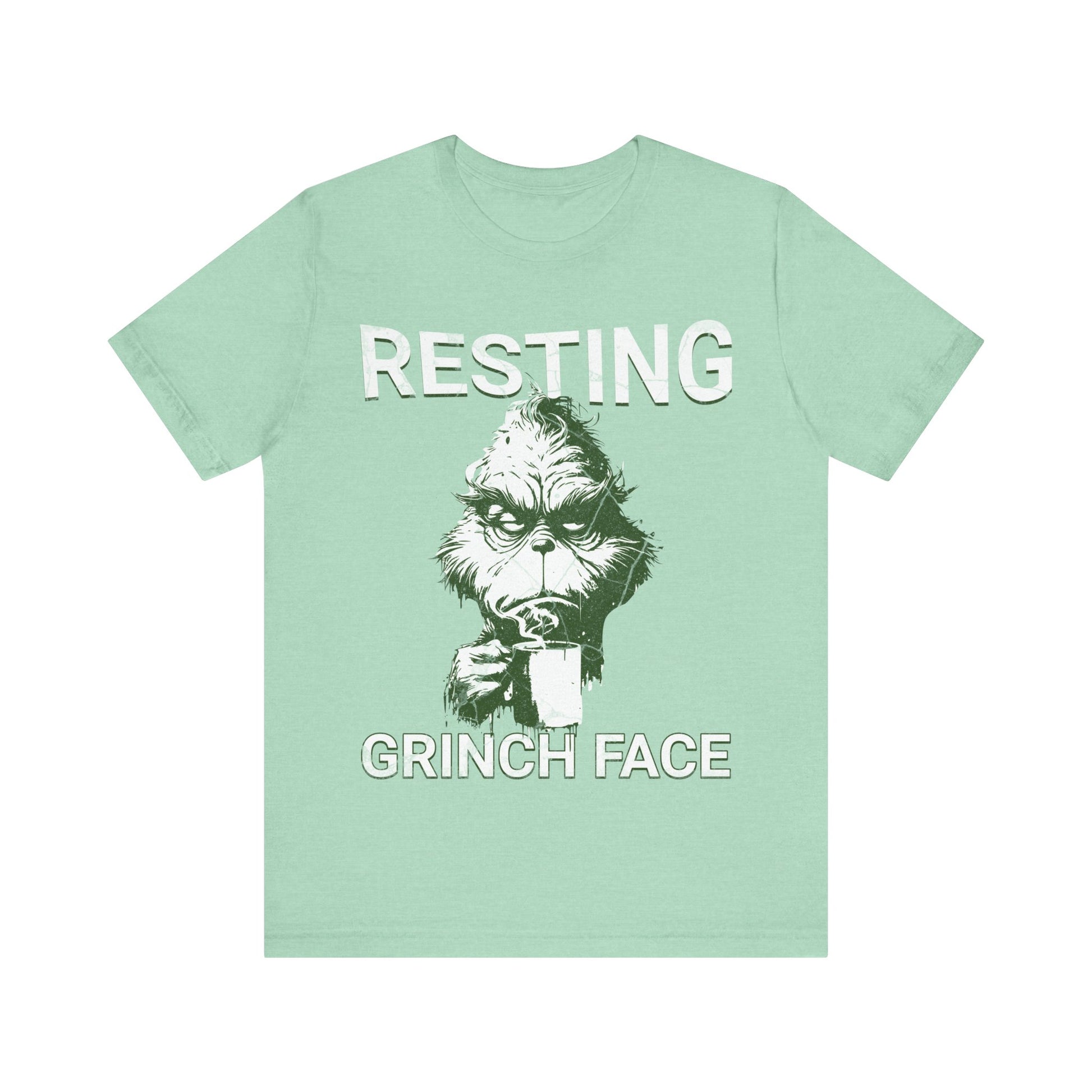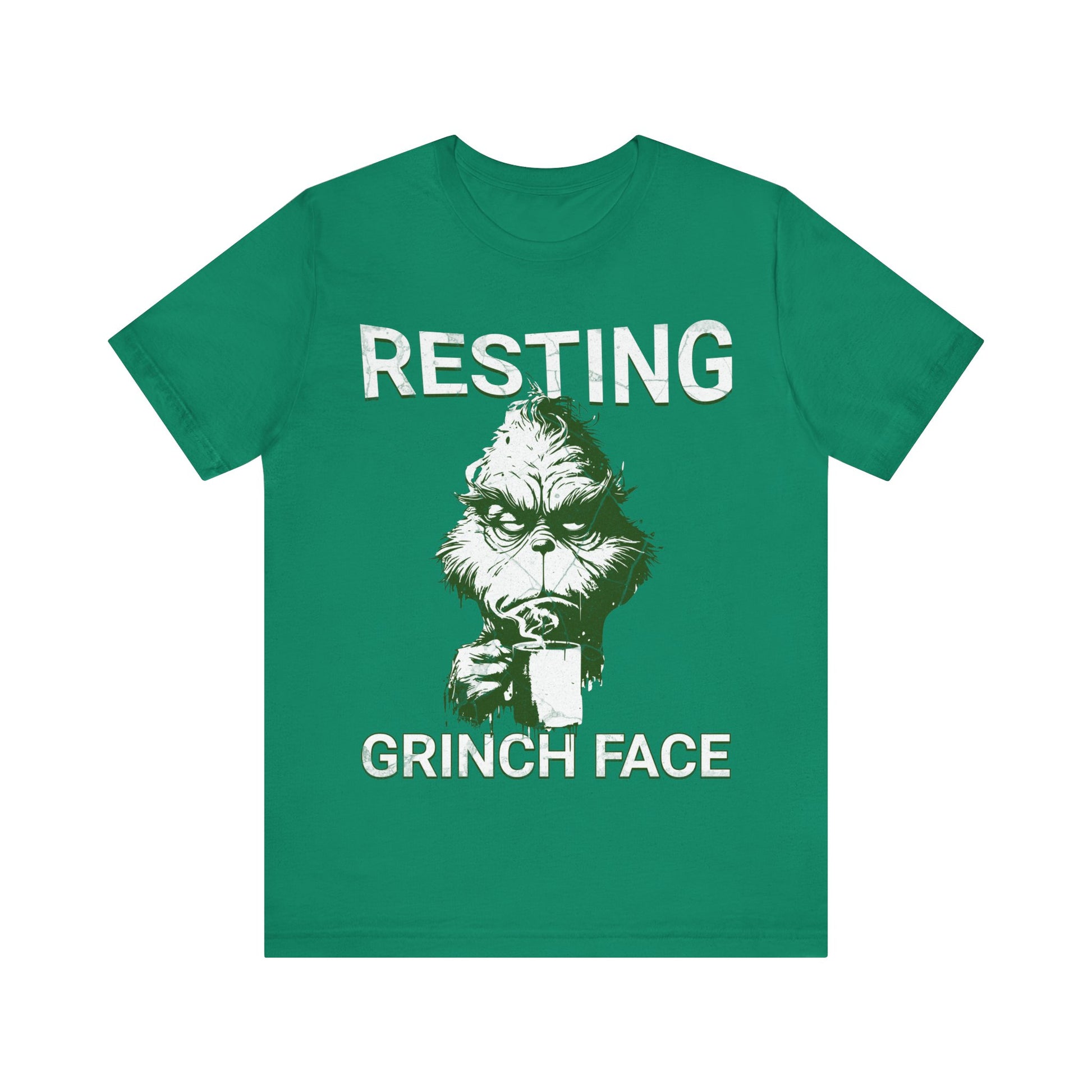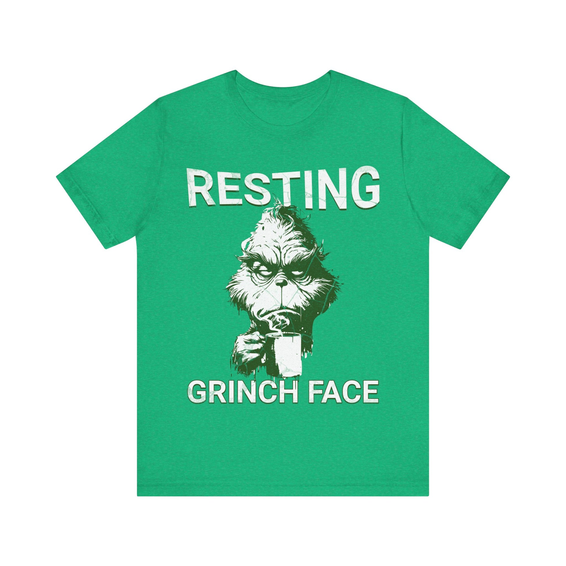 A fun grinch T-shirt with a design that says 'resting grinch face'. Perfect for anyone who loves the grinch or enjoys a touch of humor in their wardrobe. Ideal for holiday parties, Christmas celebrations, and casual everyday wear.