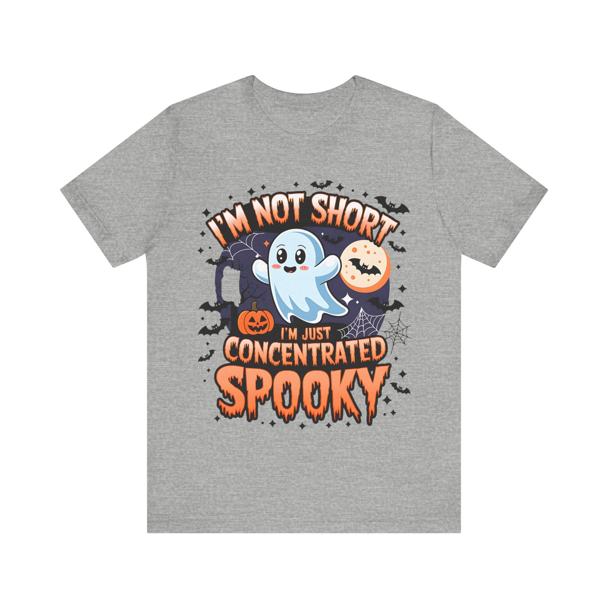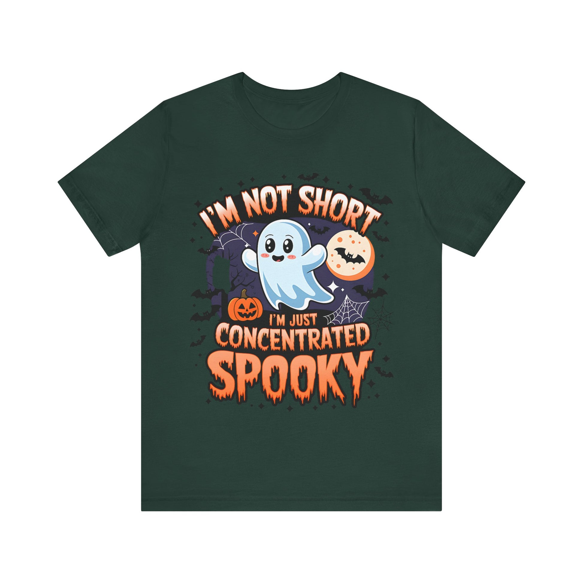 A Halloween-themed t-shirt design featuring a cute ghost with the text 'I'm not short, I'm concentrated spooky'. Perfect for Halloween enthusiasts looking for a playful and spooky addition to their wardrobe. Ideal for casual wear during the Halloween season.