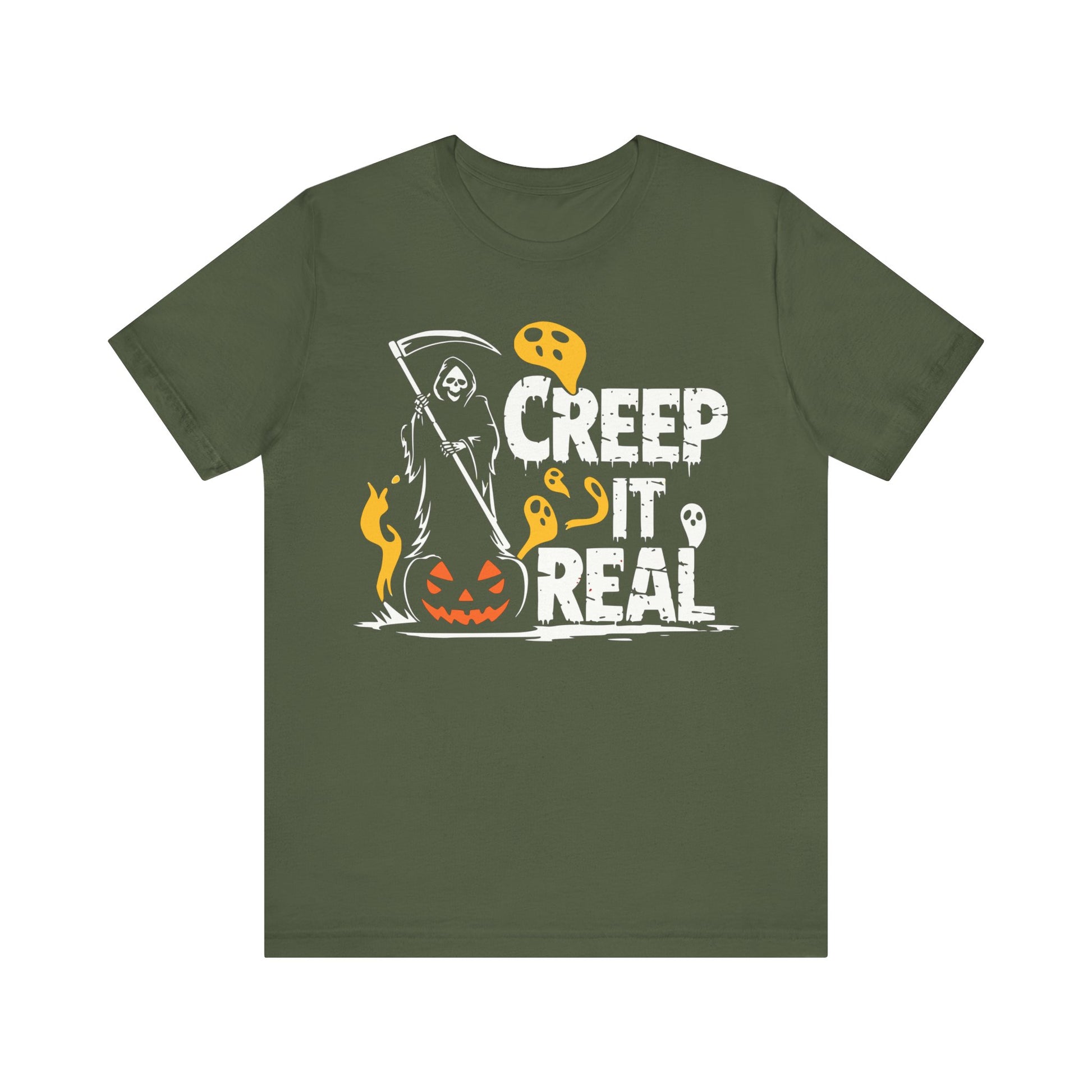 A Halloween Tee featuring the Grim Reaper with the phrase 'Creep it Real'. This shirt gives off a spooky and fun vibe, perfect for Halloween celebrations. It is relevant to individuals looking for a festive and playful addition to their wardrobe.