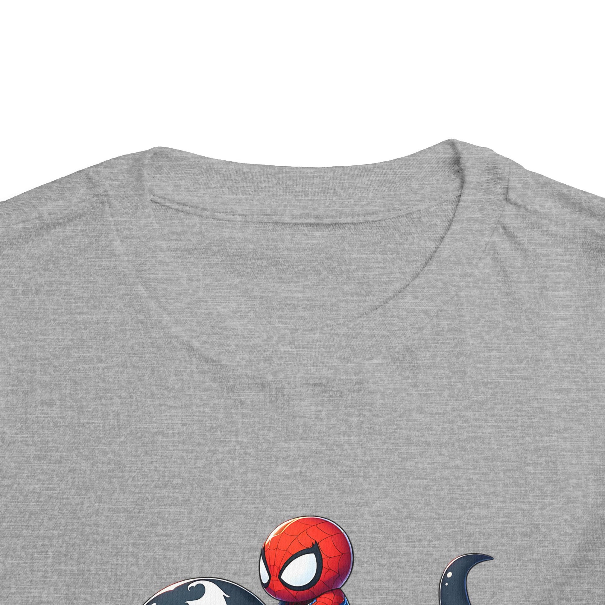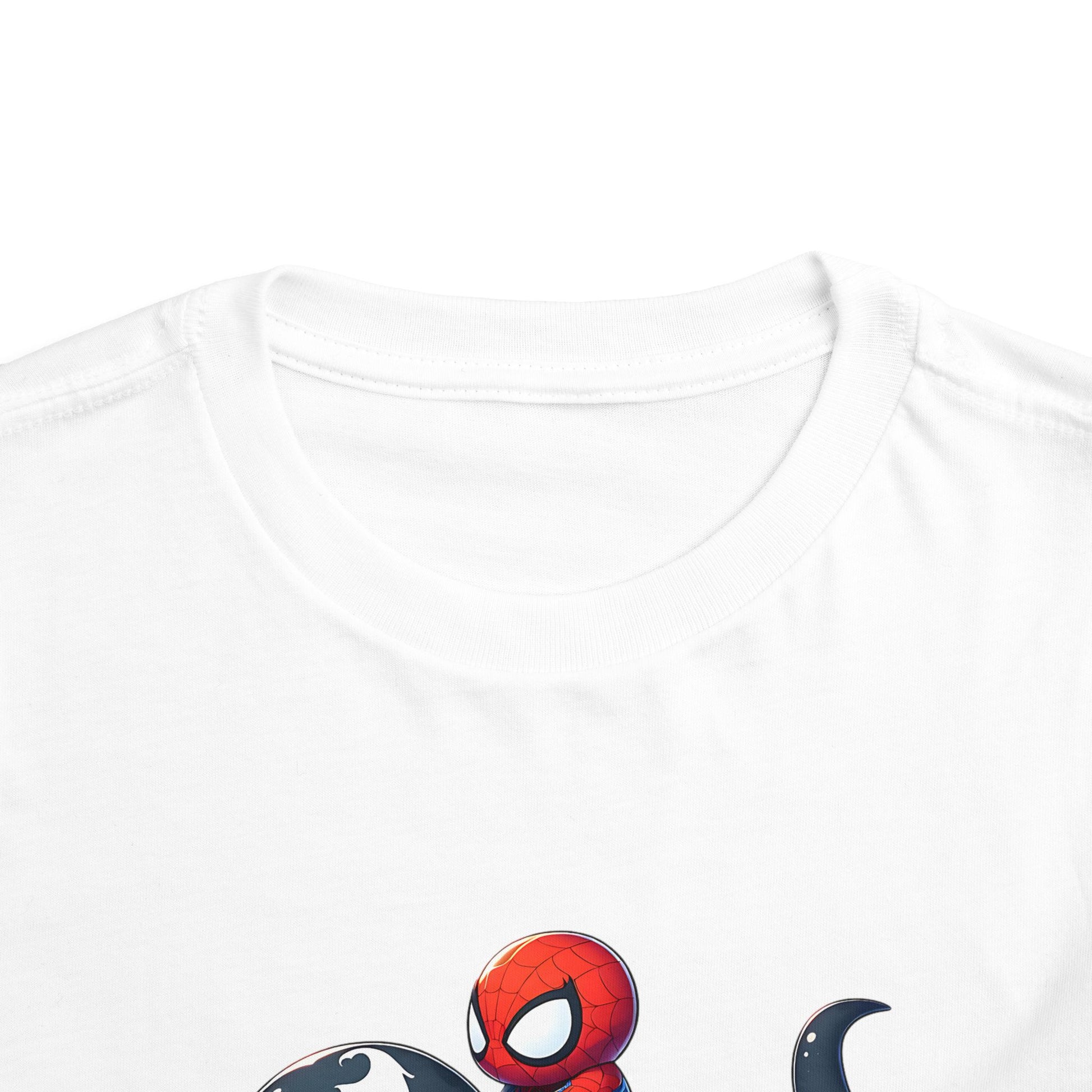 This adorable kids t-shirt features a design of Spiderman riding a Venom dinosaur, perfect for young superhero fans. The light fabric and tear-away label make it comfortable for all-day wear. Ideal for toddlers who love action-packed adventures and superhero characters. Great for birthdays, comic con events, Halloween, and everyday playtime.