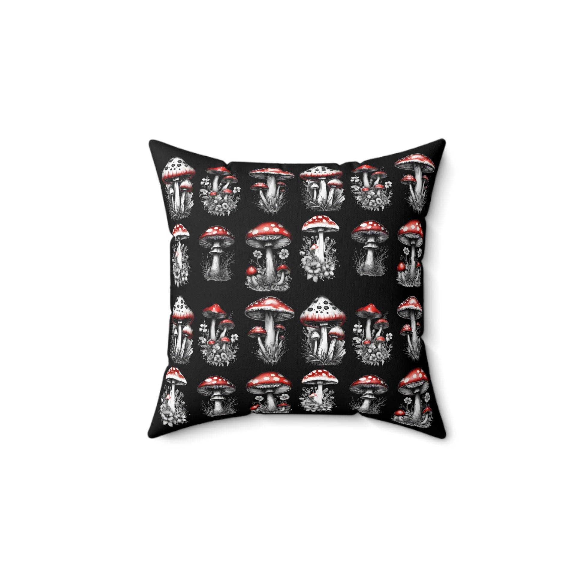 This pillow design showcases a bold, red-capped mushroom similar to a fly agaric with its signature white spots. With details such as plants and leaves surrounding the base of the mushroom, it has a grounded, organic feel. A bee can be seen hovering near the top of the mushroom, giving the design a sense of interaction with nature. The contrast between the vibrant red of the mushroom and the muted tones of the background, along with the black base, creates an artistic and slightly whimsical atmosphere. It’s a mix of natural beauty and fantasy with an earthy aesthetic.