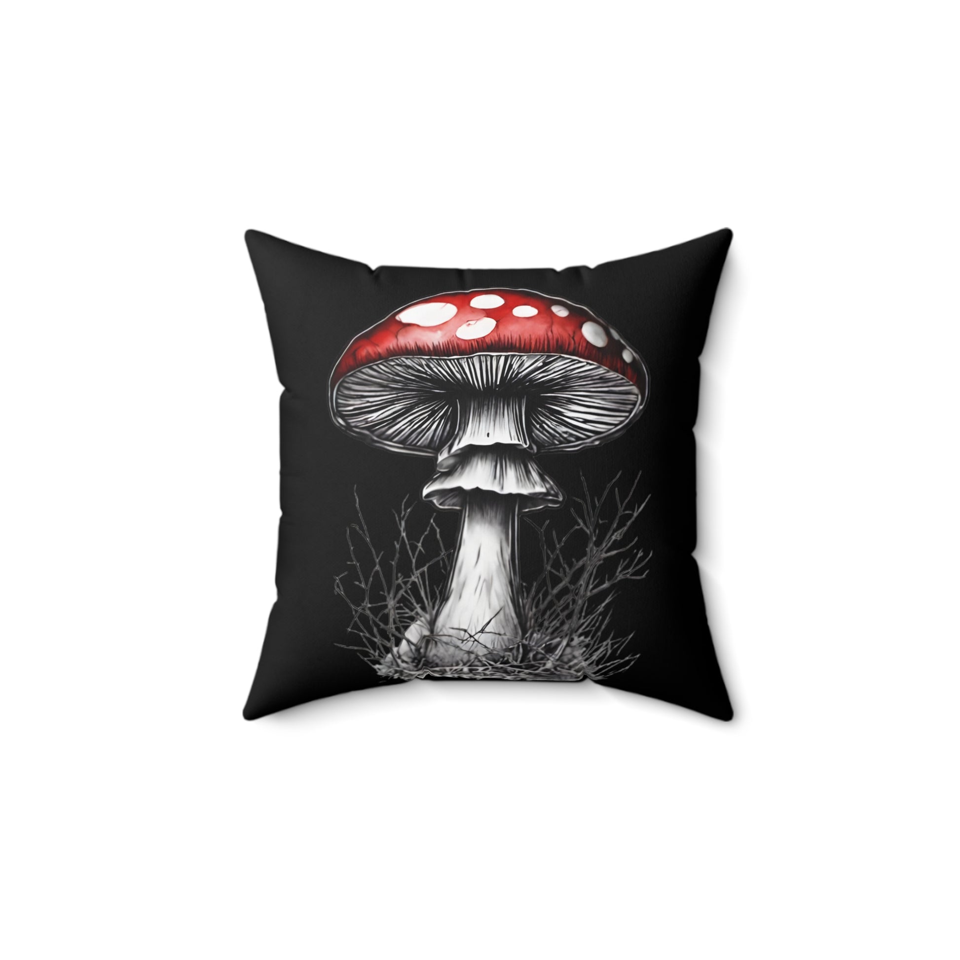 This pillow features an artistic depiction of a large, red-capped mushroom with white spots (likely resembling a fly agaric mushroom), set against a black background. The contrast of the vivid red cap against the dark background creates a striking and almost mystical vibe, making the pillow an eye-catching piece of décor. It has a nature-inspired yet somewhat eerie or whimsical aesthetic.