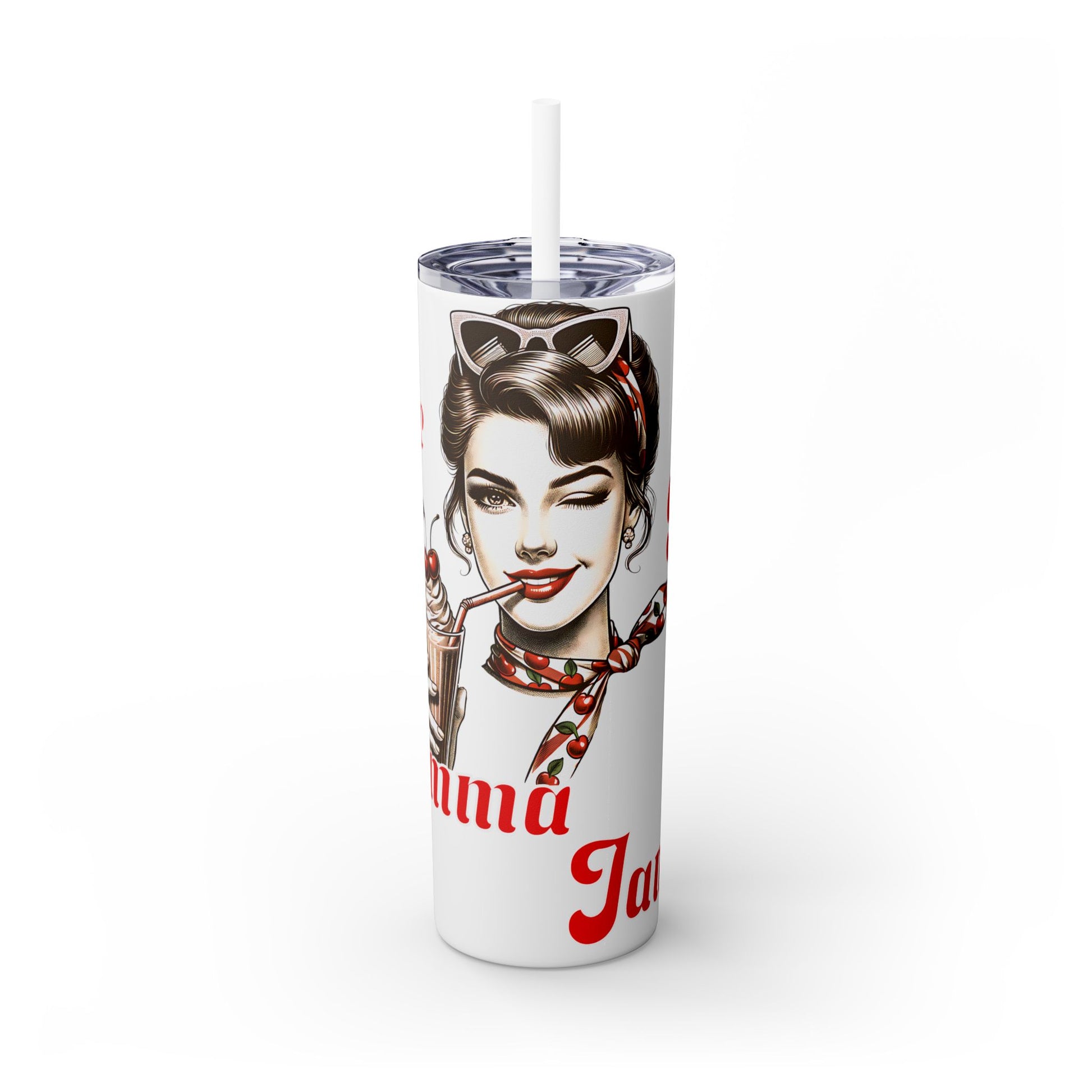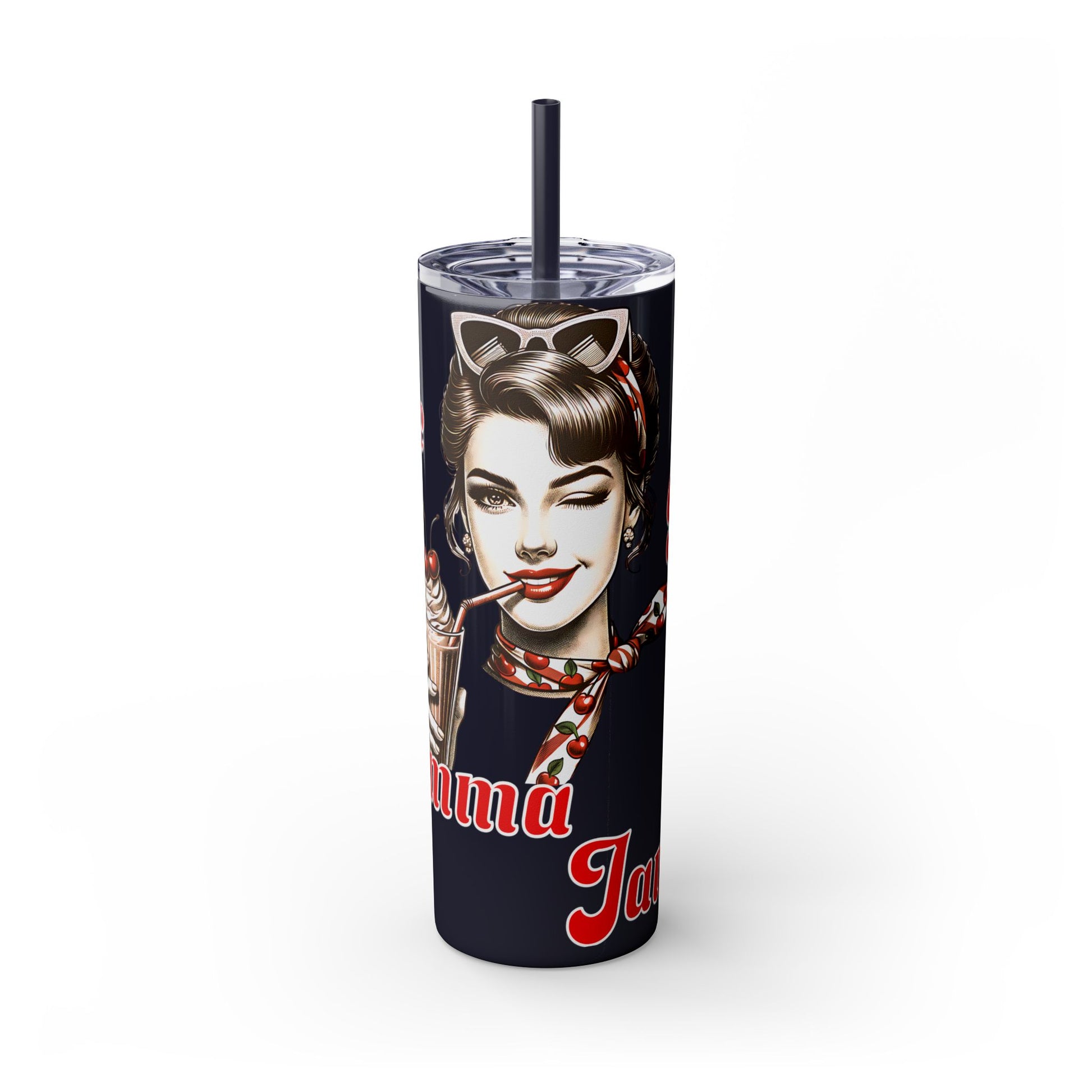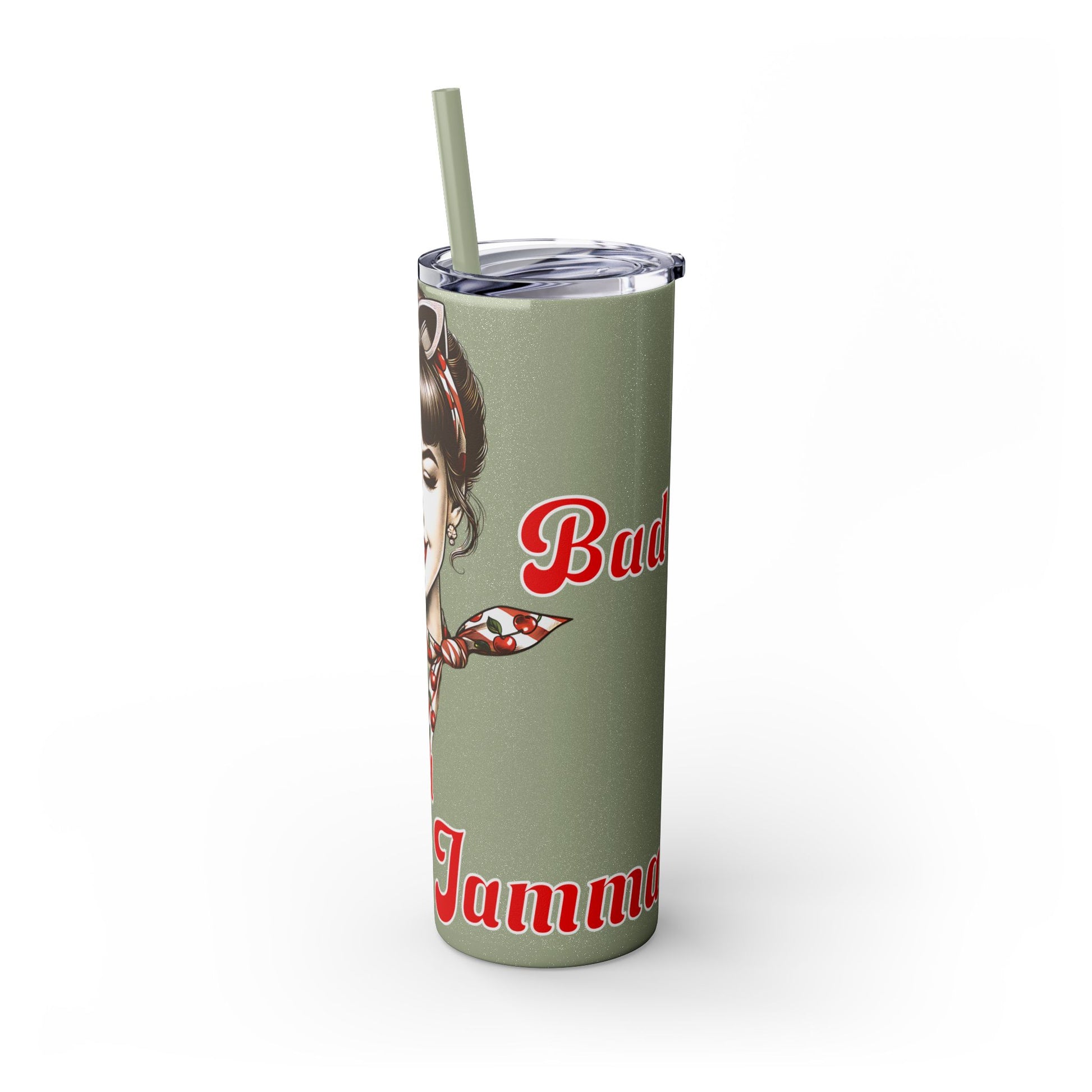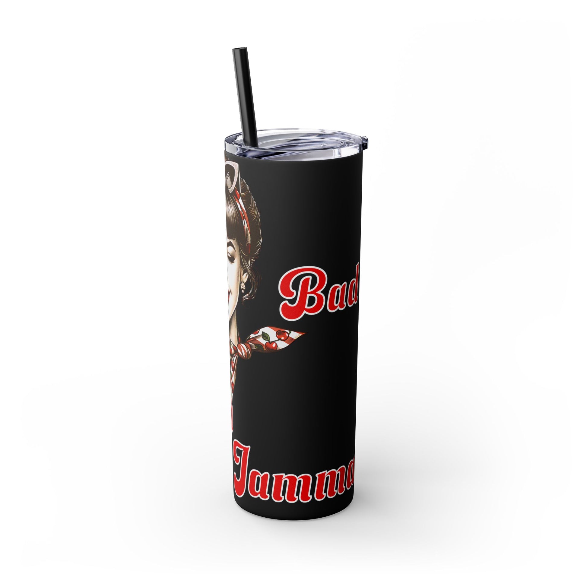 This vintage-inspired tumbler features a design of a woman that says 'one bad mamma jamma'. Perfect for anyone looking to add a touch of retro charm to their daily drinkware. Ideal for those who appreciate unique and eye-catching designs. Great for gifting on birthdays, Mother's Day, or any special occasion.