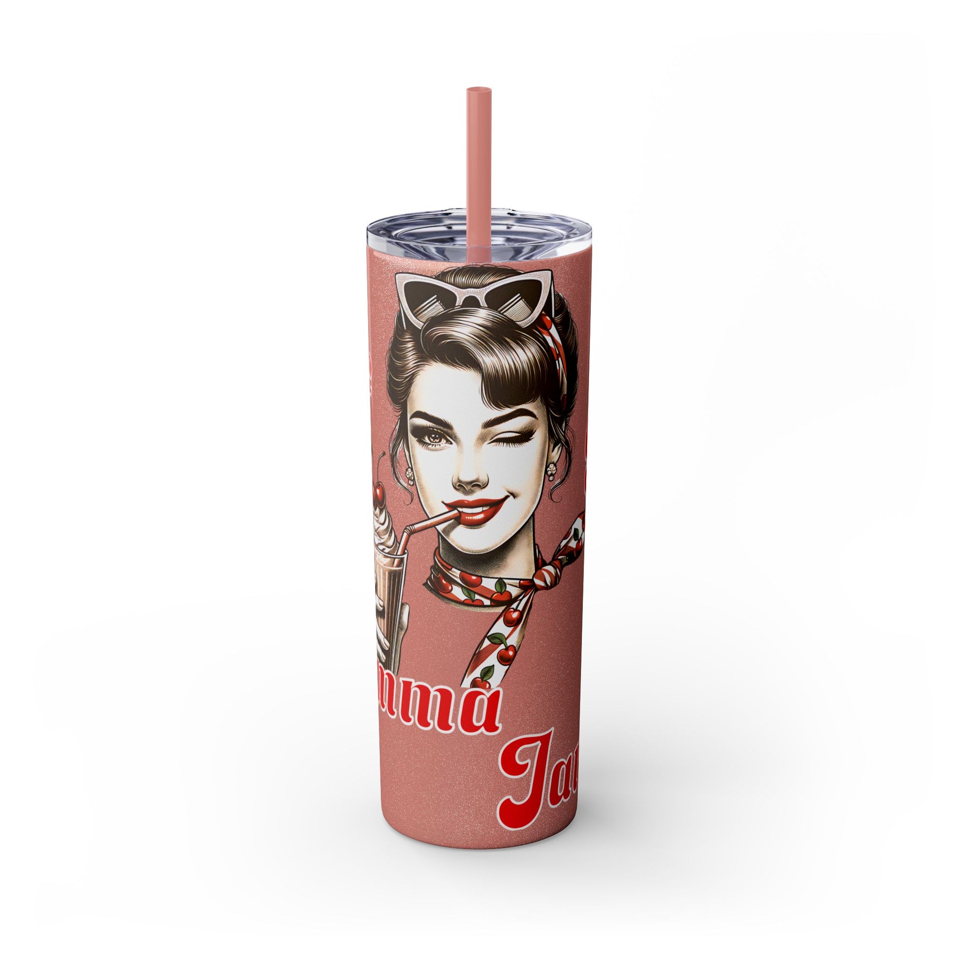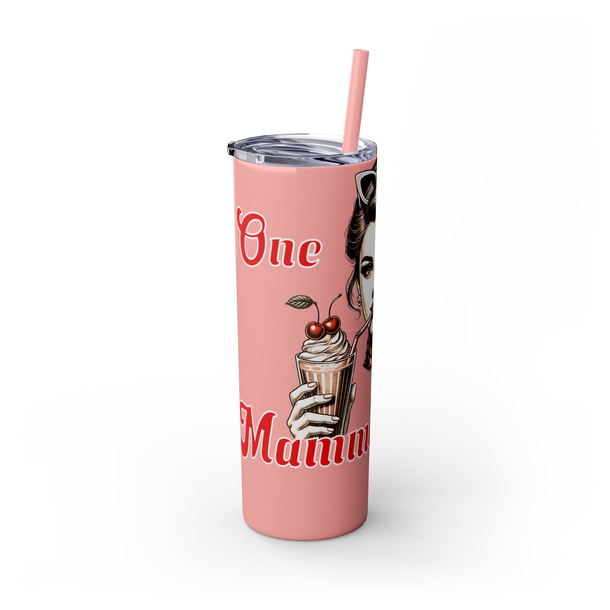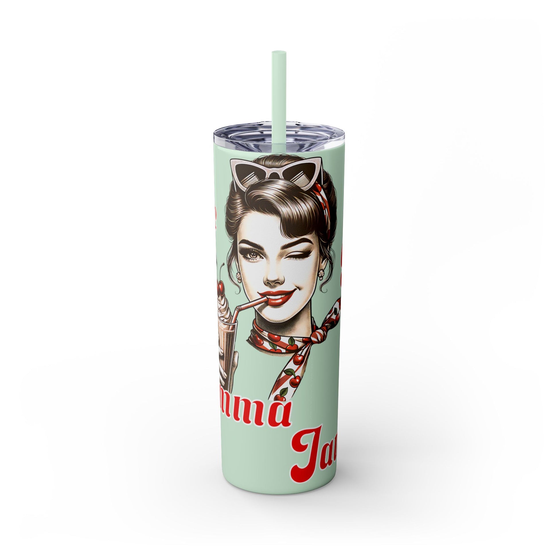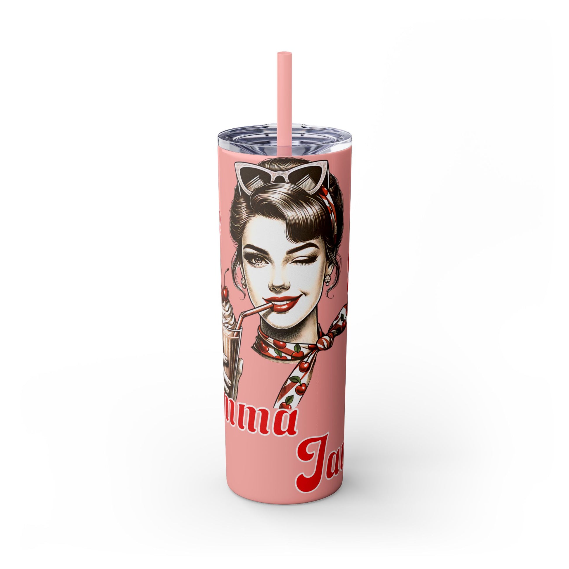 This vintage-inspired tumbler features a design of a woman that says 'one bad mamma jamma'. Perfect for anyone looking to add a touch of retro charm to their daily drinkware. Ideal for those who appreciate unique and eye-catching designs. Great for gifting on birthdays, Mother's Day, or any special occasion.