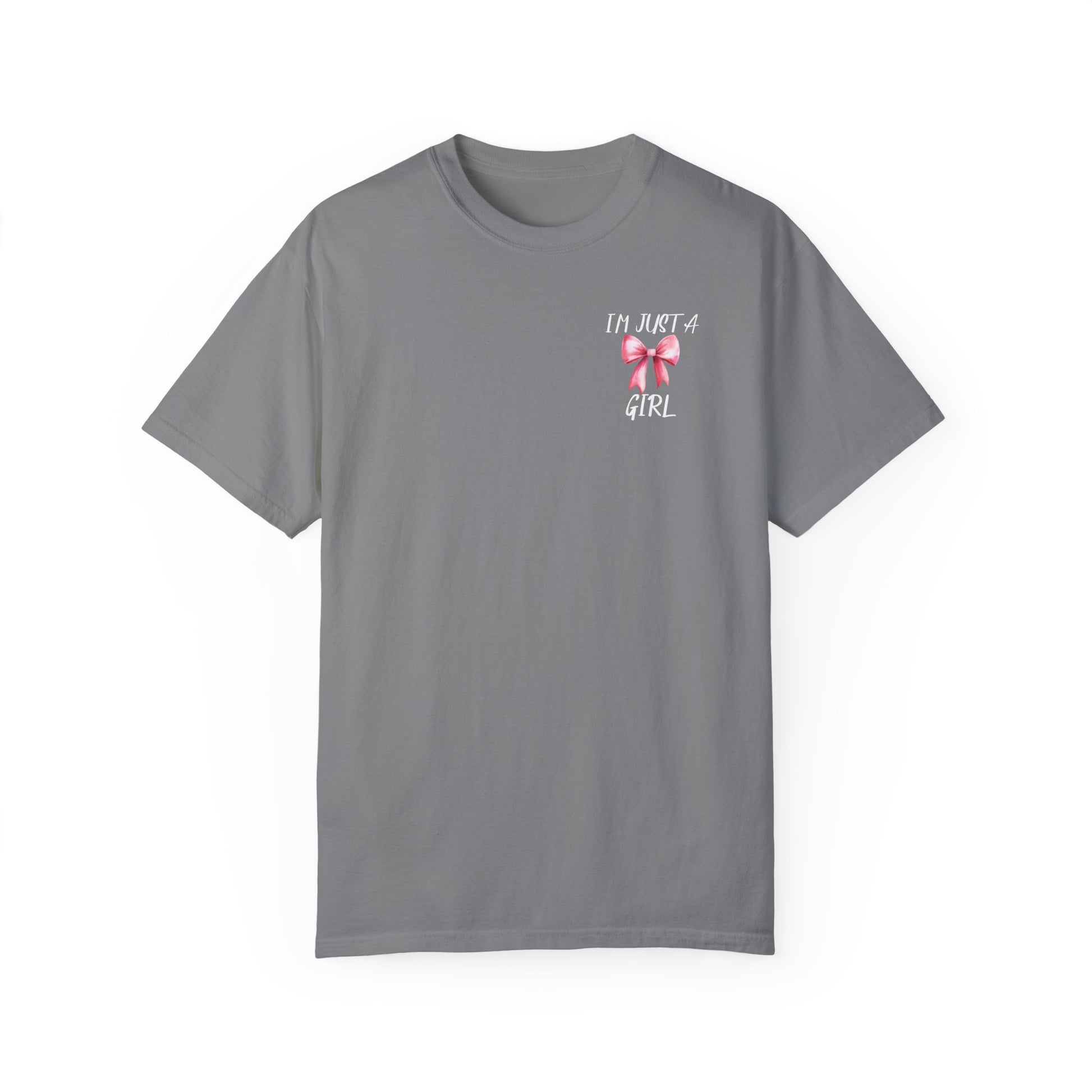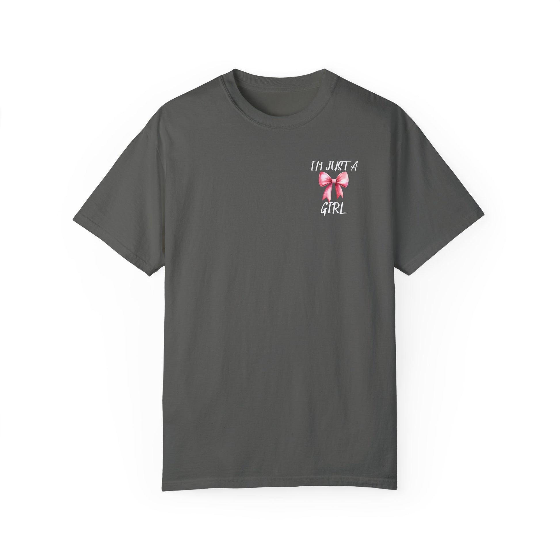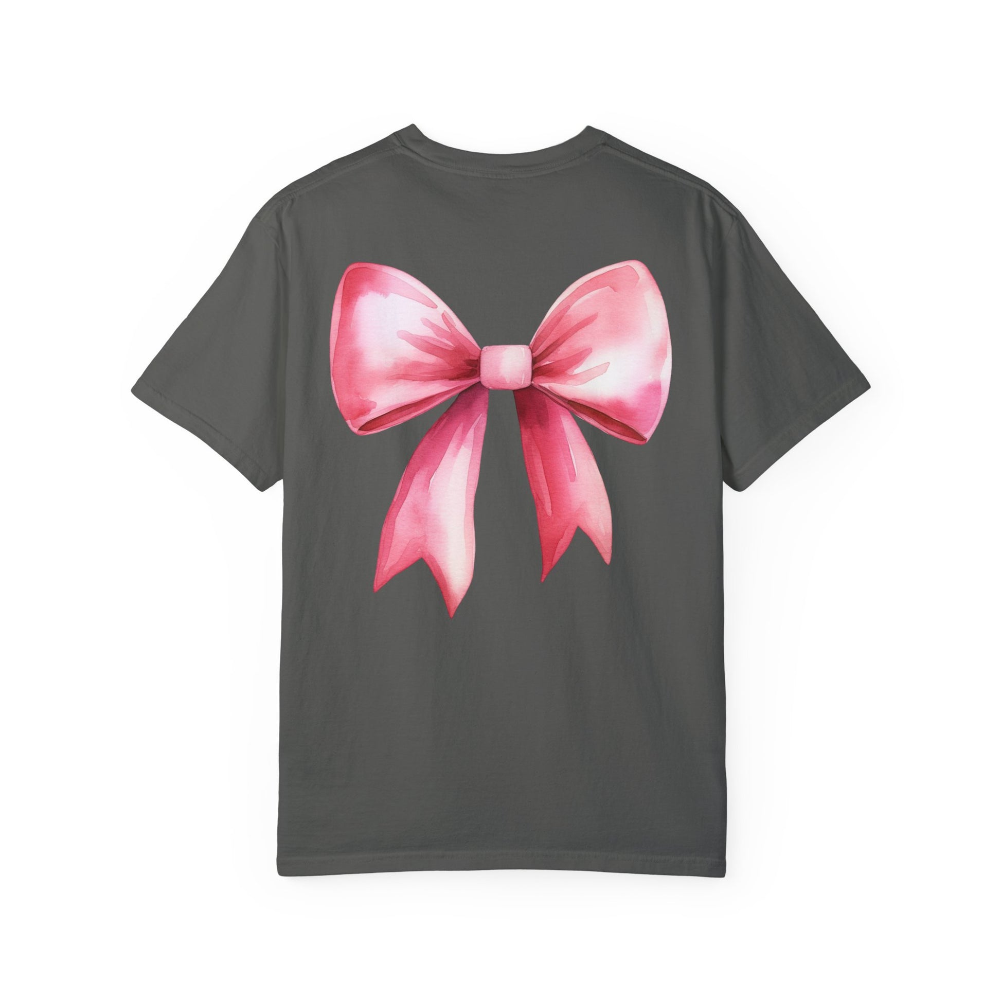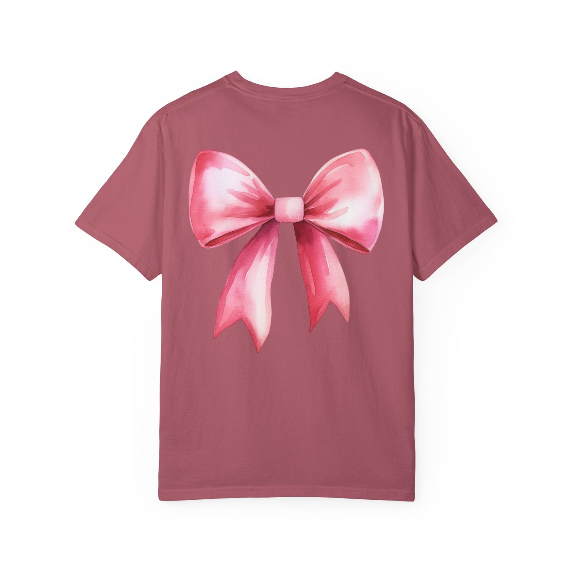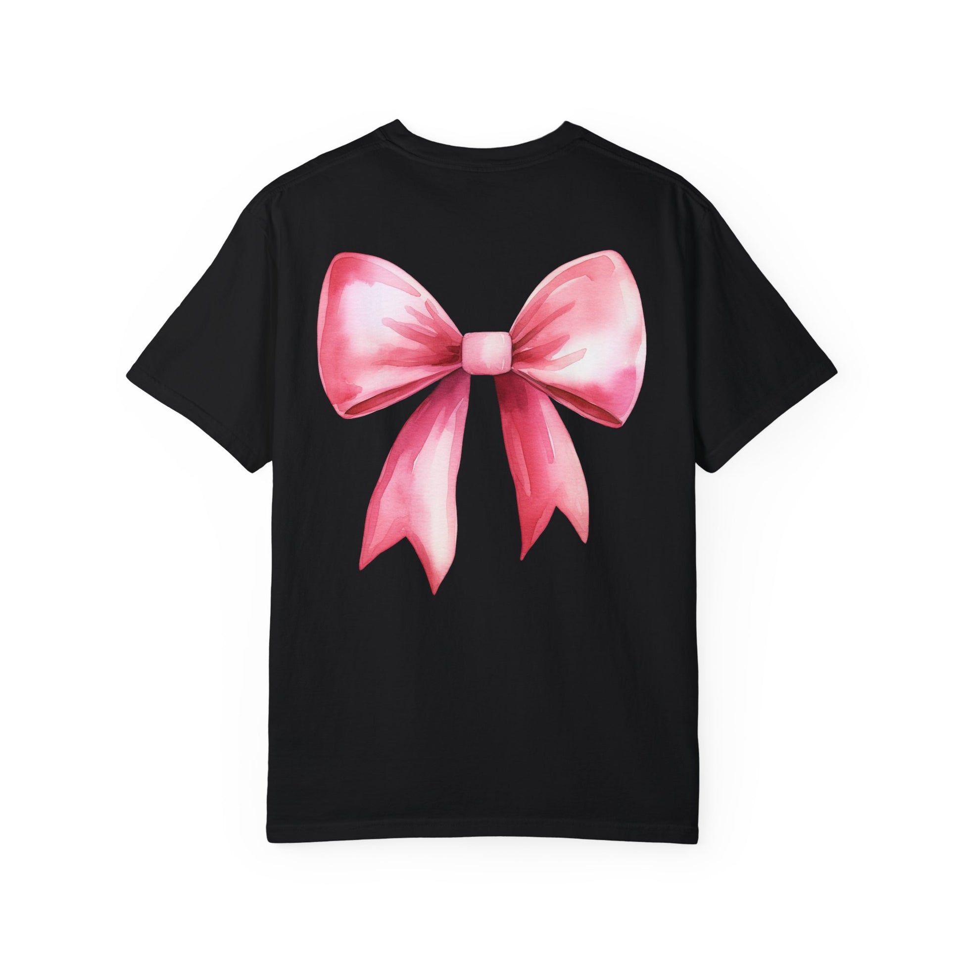 A comfortable and stylish t-shirt with a bow design. This garment-dyed tee is perfect for those who appreciate high-quality cotton and unique, casual style. Ideal for everyday wear or as a thoughtful gift for fashion-conscious individuals.