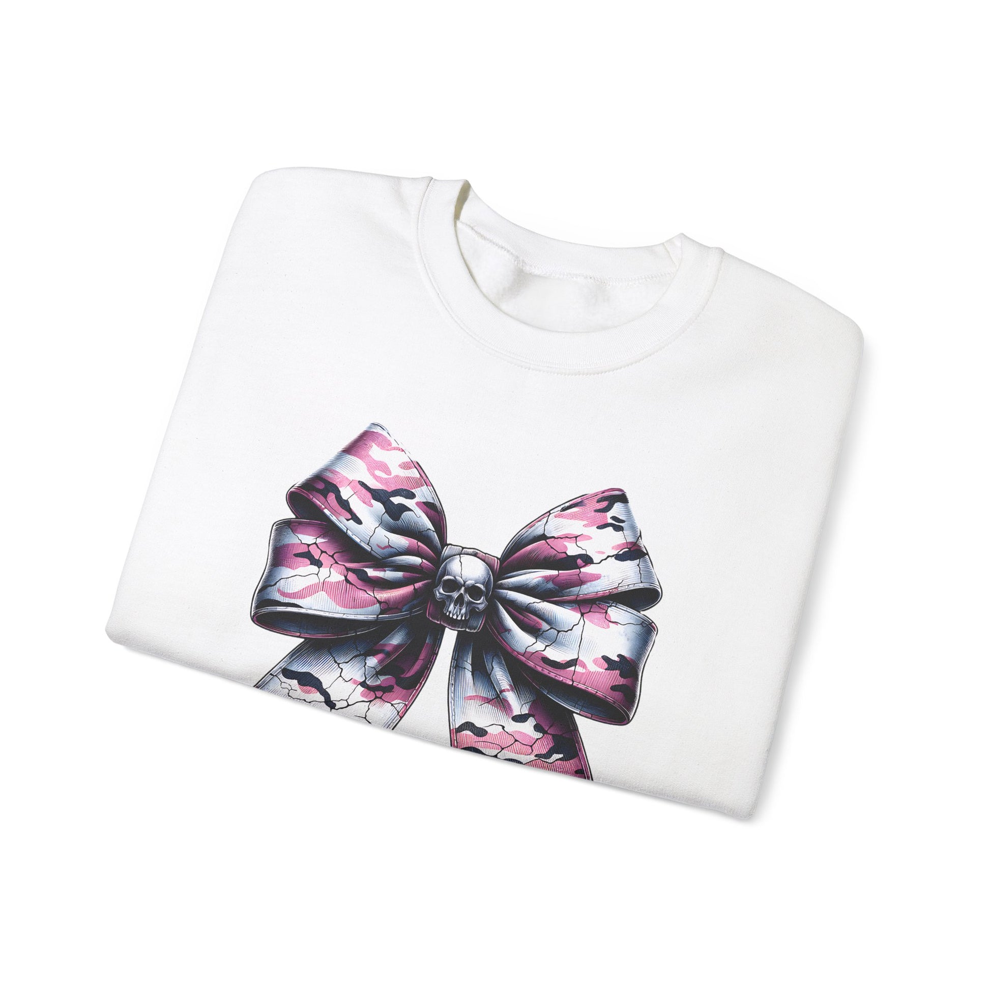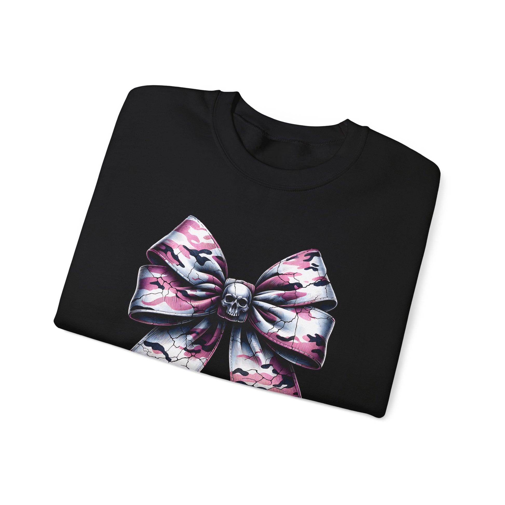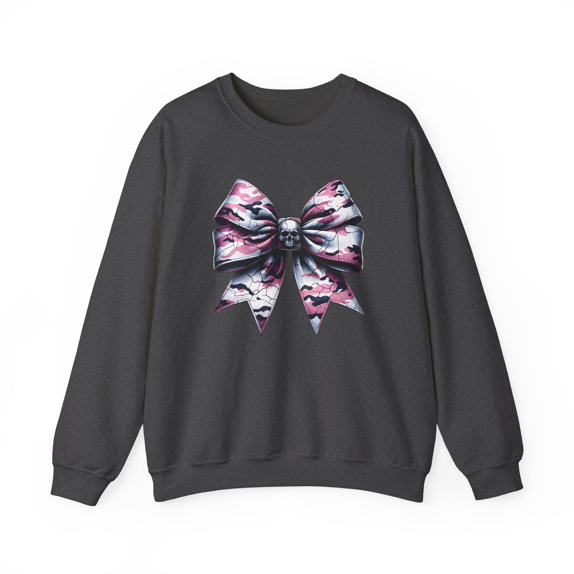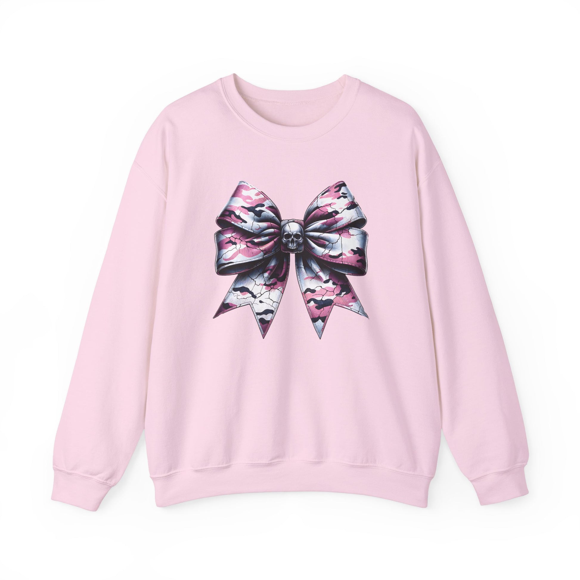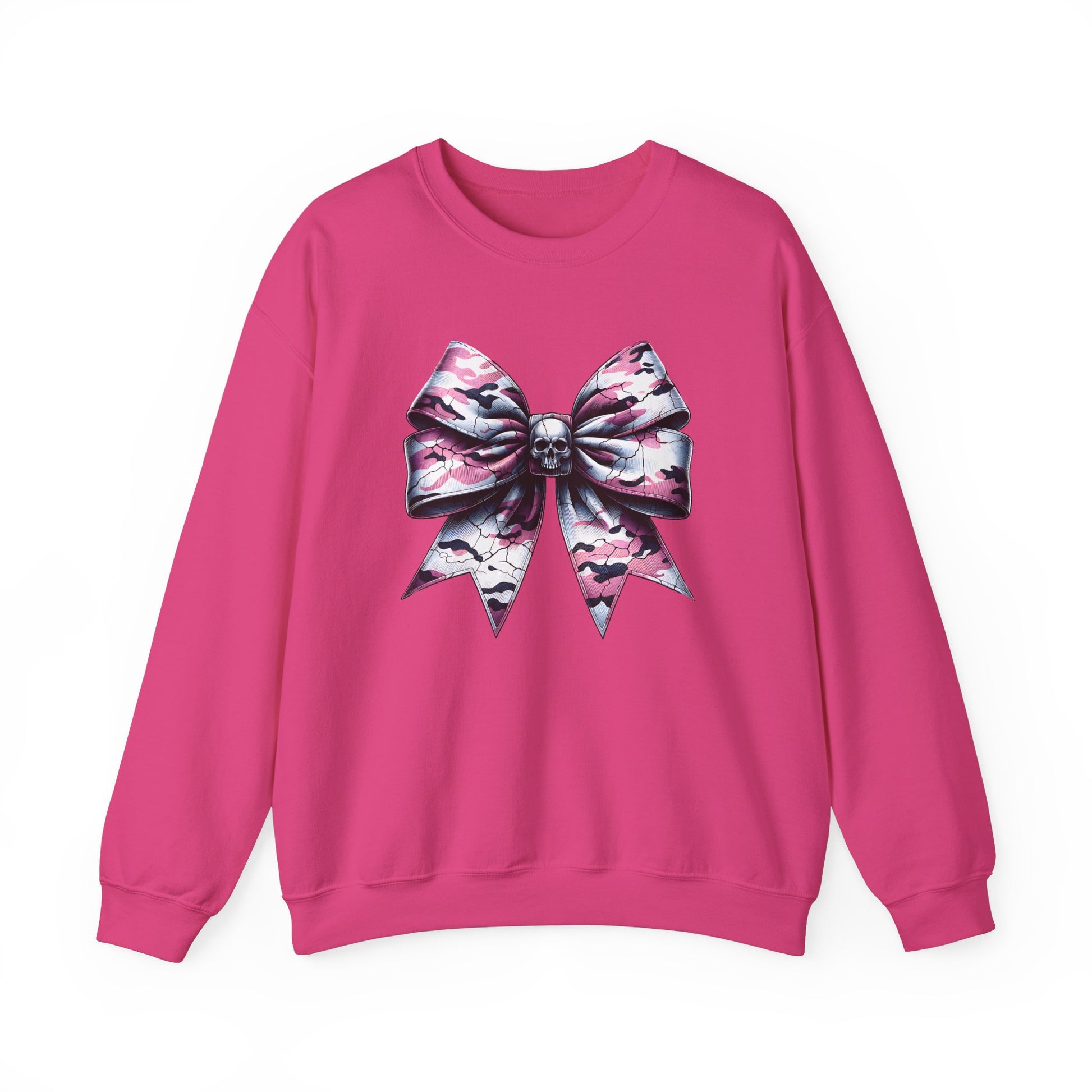This sweatshirt features a pink camo bow design with subtle skulls, perfect for those who love retro and unique Valentine's Day apparel. This sweatshirt provides a cozy and comfortable fit for the colder months, making it a great Valentine's Day gift.