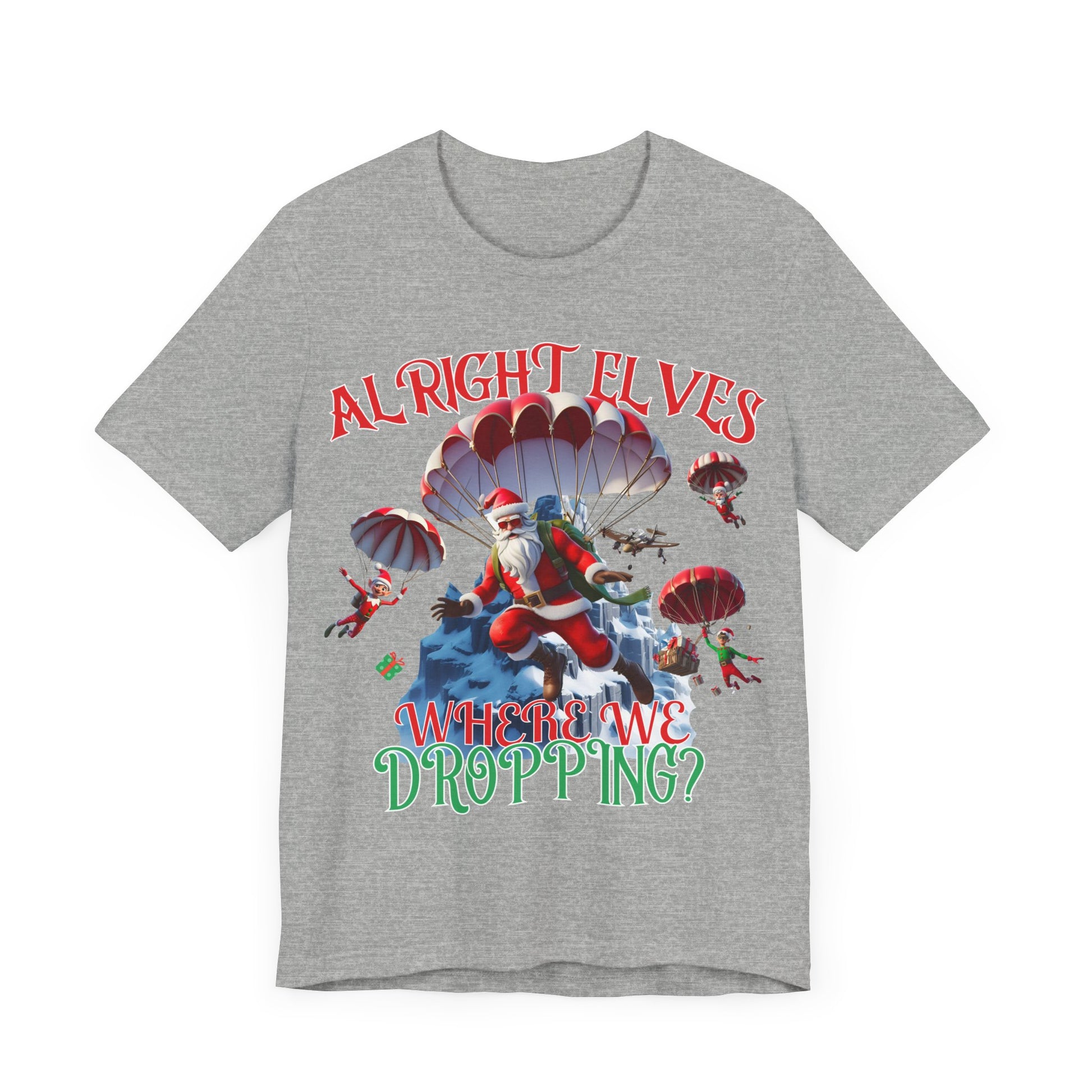 Embrace the holiday thrill with our whimsical parachuting scene! π Featuring a playful design of holiday helpers descending from the sky, this shirt is a festive blend of Christmas cheer and gamer fun. With the witty phrase "Where we dropping, elves?" boldly displayed, it's a perfect addition to your seasonal wardrobe. Crafted for comfort and style, this tee ensures a jolly season full of laughter and cheer. Spread the joy wherever you go with this delightful shirt! π