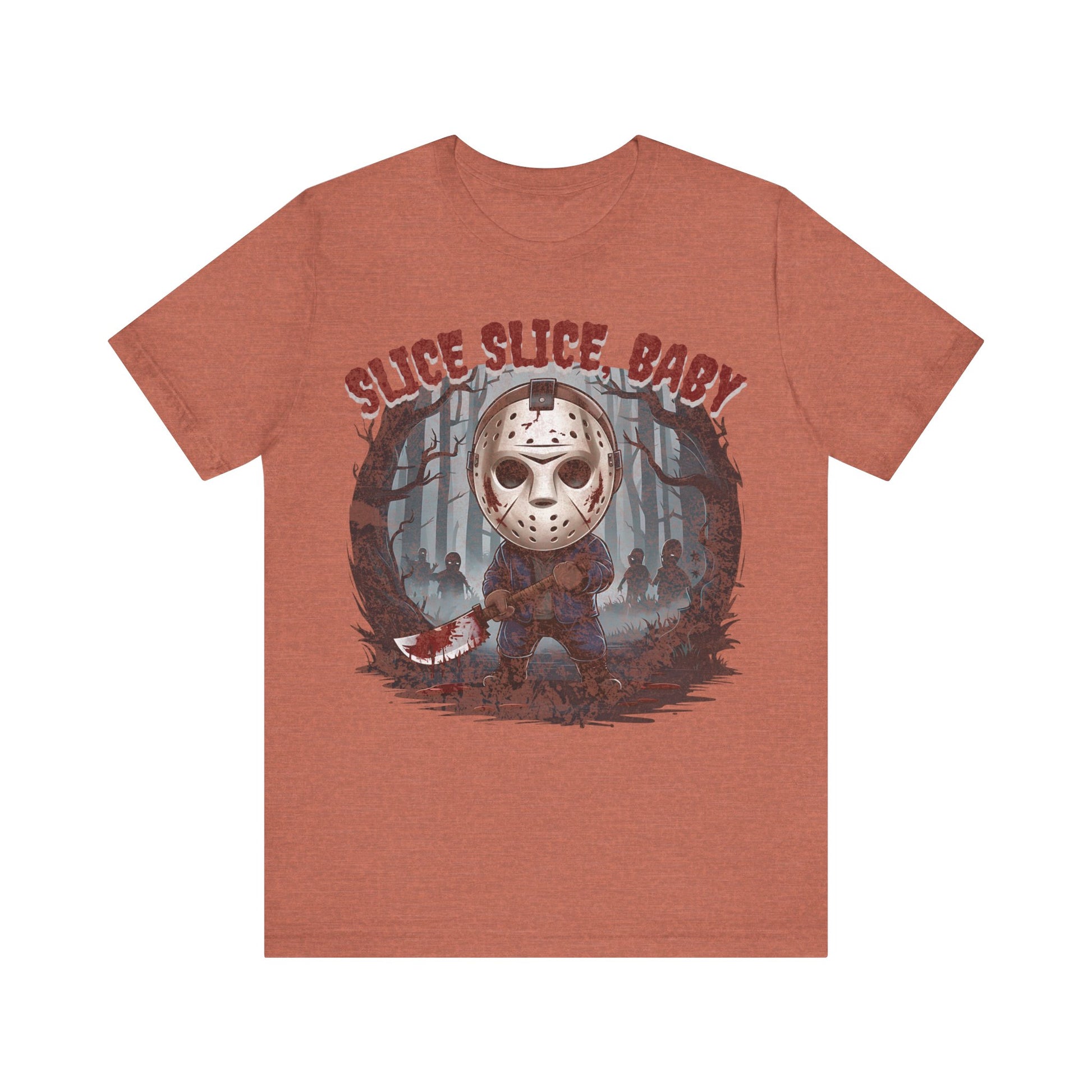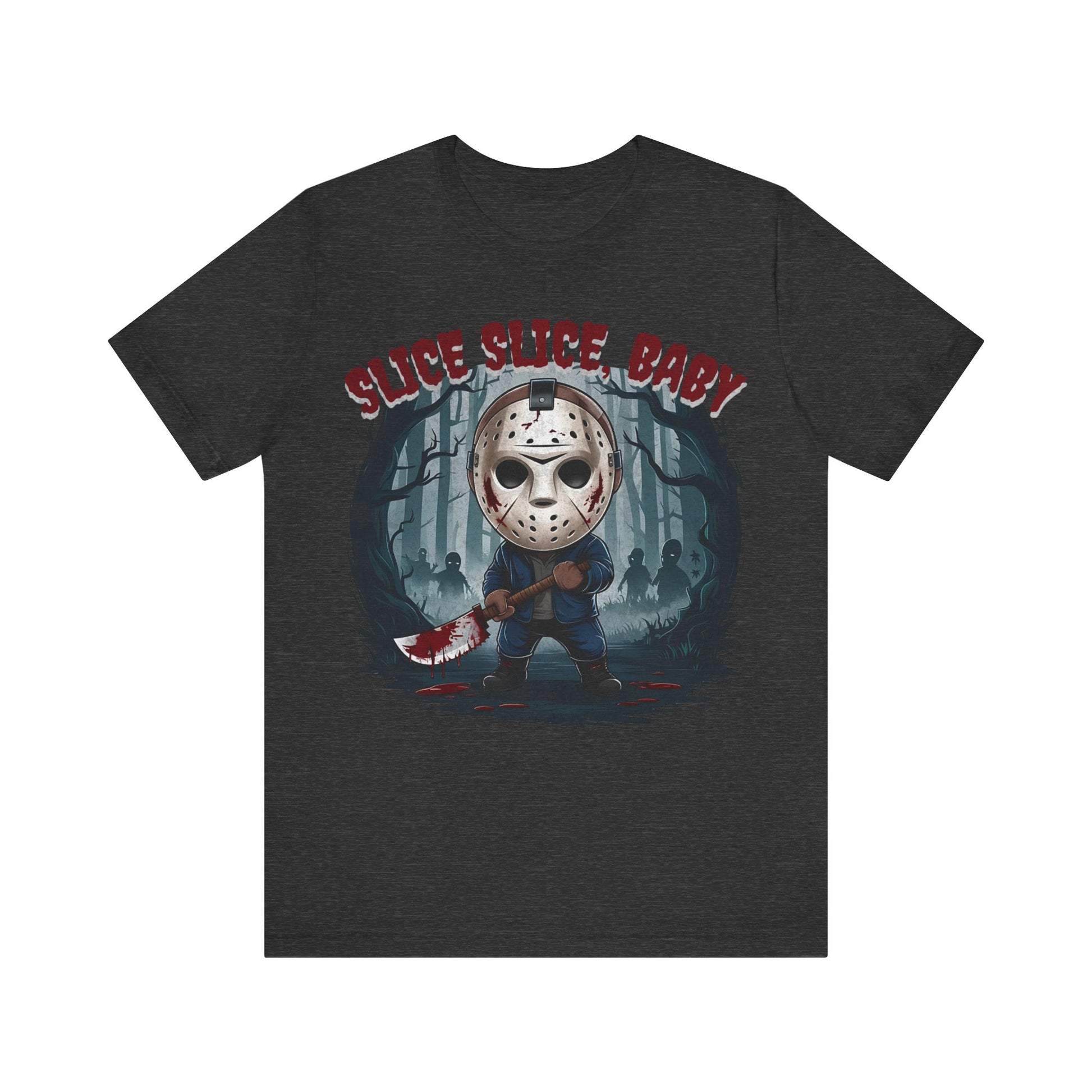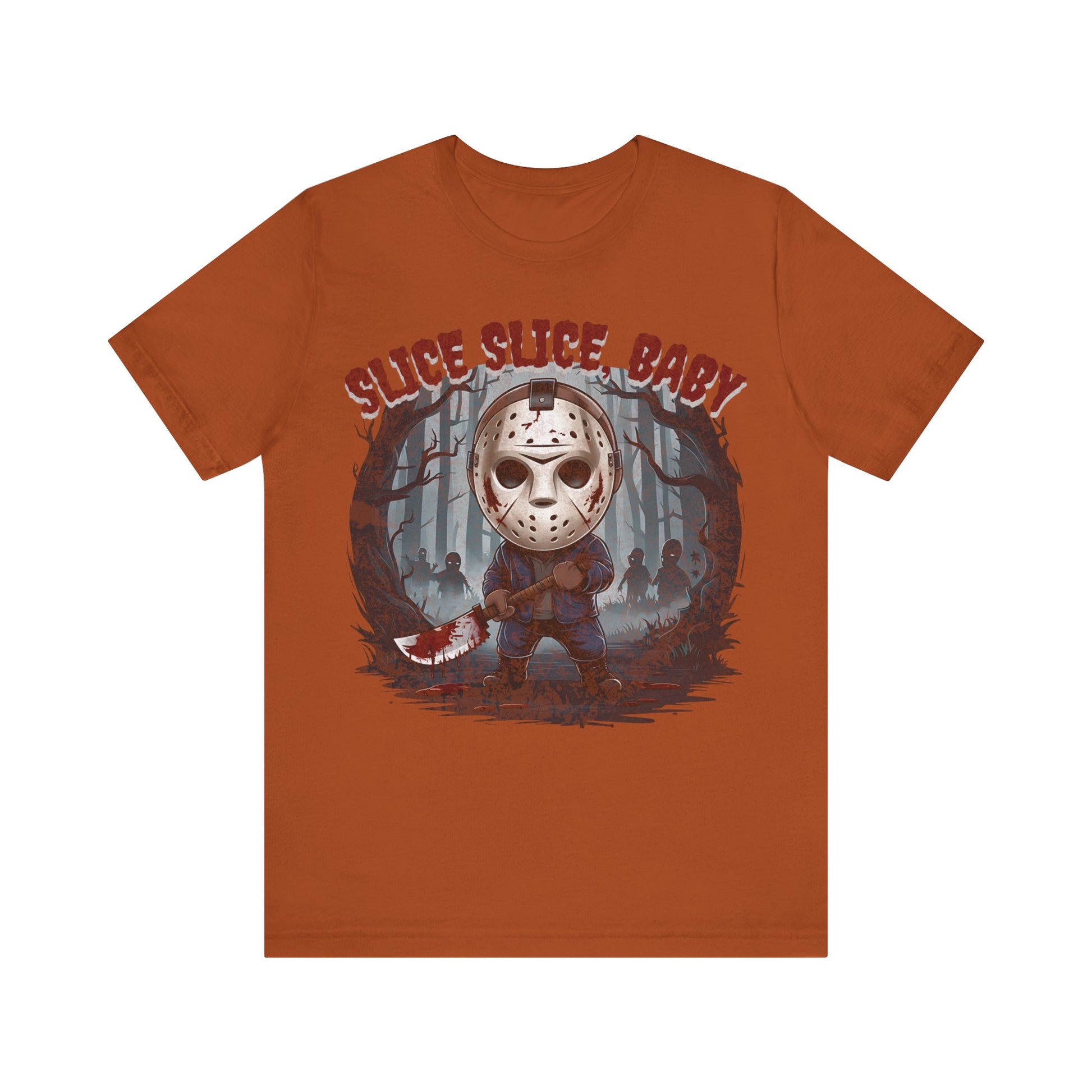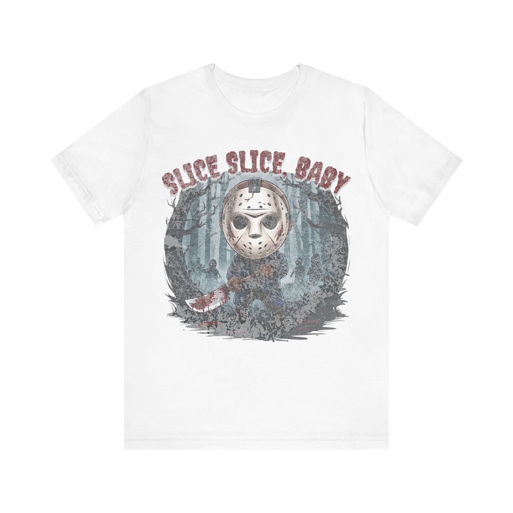 Perfect for fans of classic horror, the gritty design captures Jason’s eerie presence against a backdrop of shadowy woods and Halloween mist. Made from high-quality, soft cotton, this shirt is as comfortable as it is spooky. Ideal for your Halloween parties, horror movie marathons, or as a statement piece for any fan of the slasher genre. Available in various sizes to ensure a great fit. Dare to wear it and celebrate the frightful season with style!"
