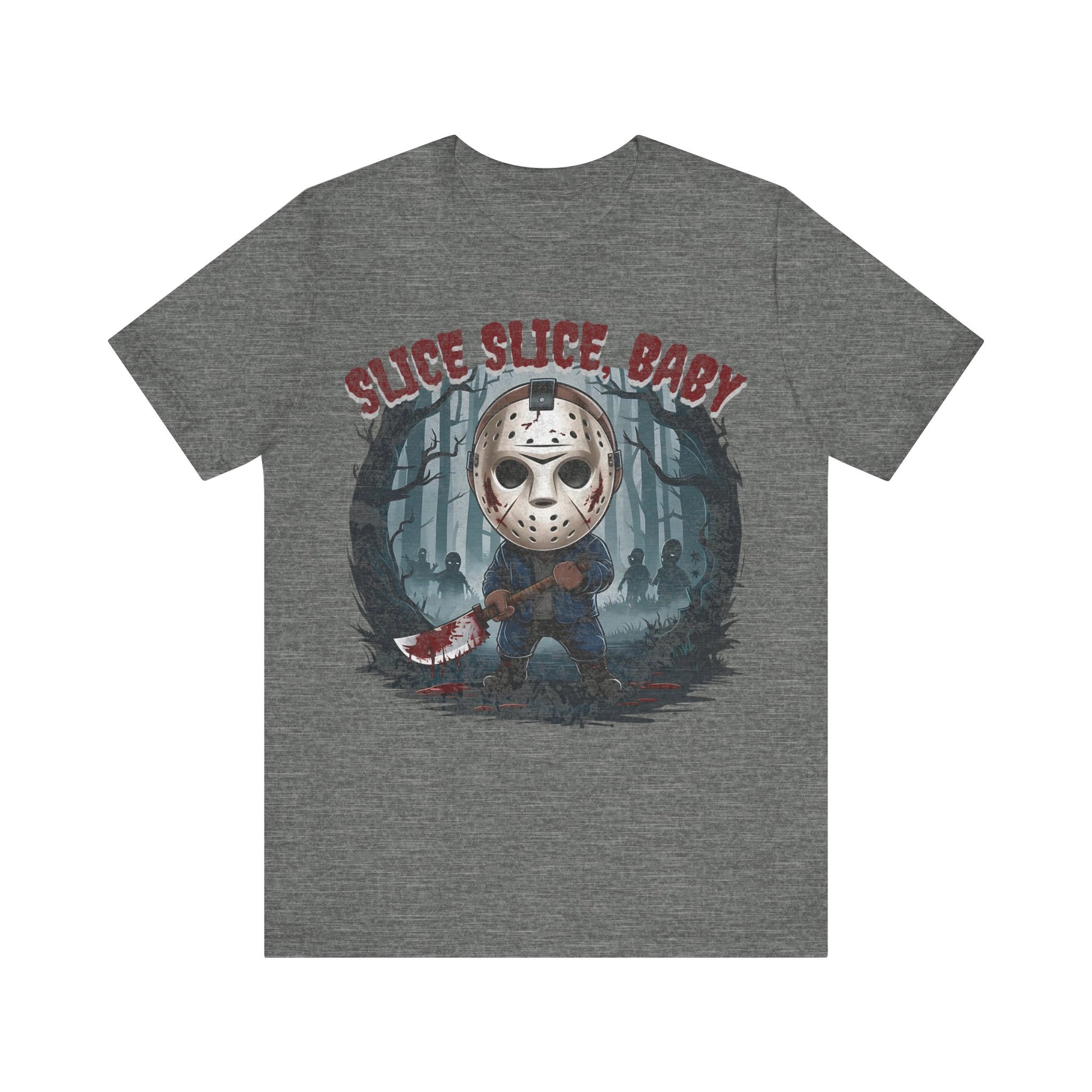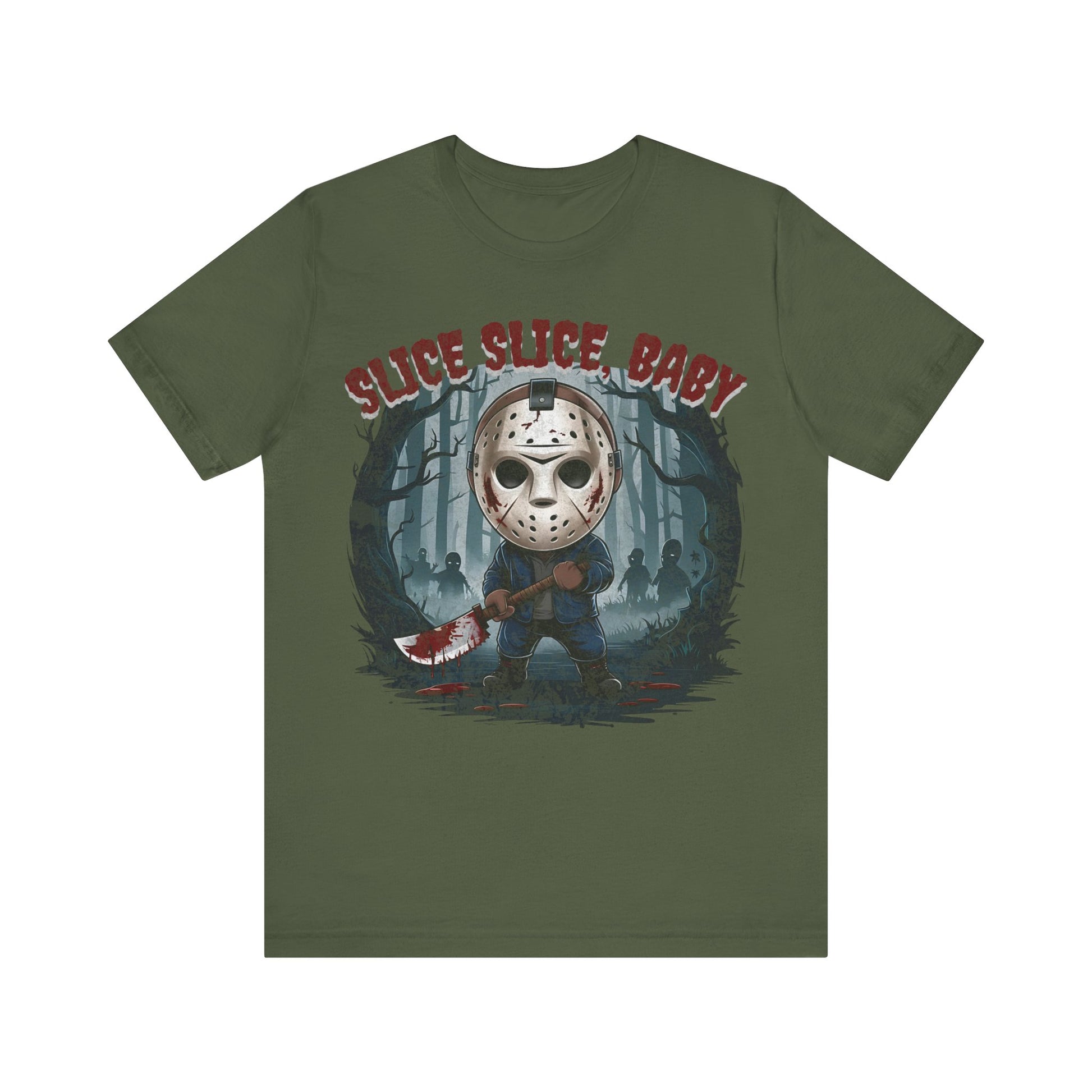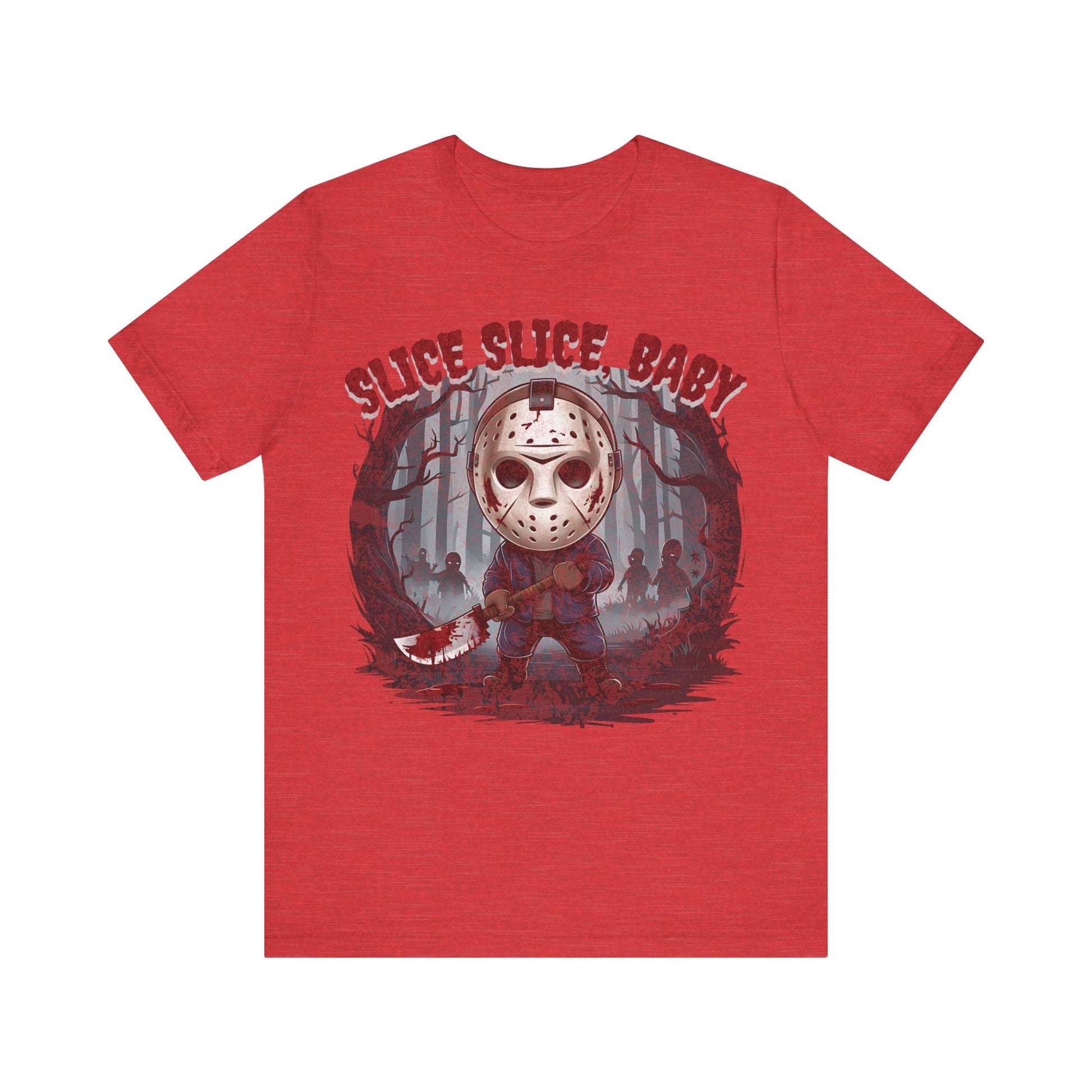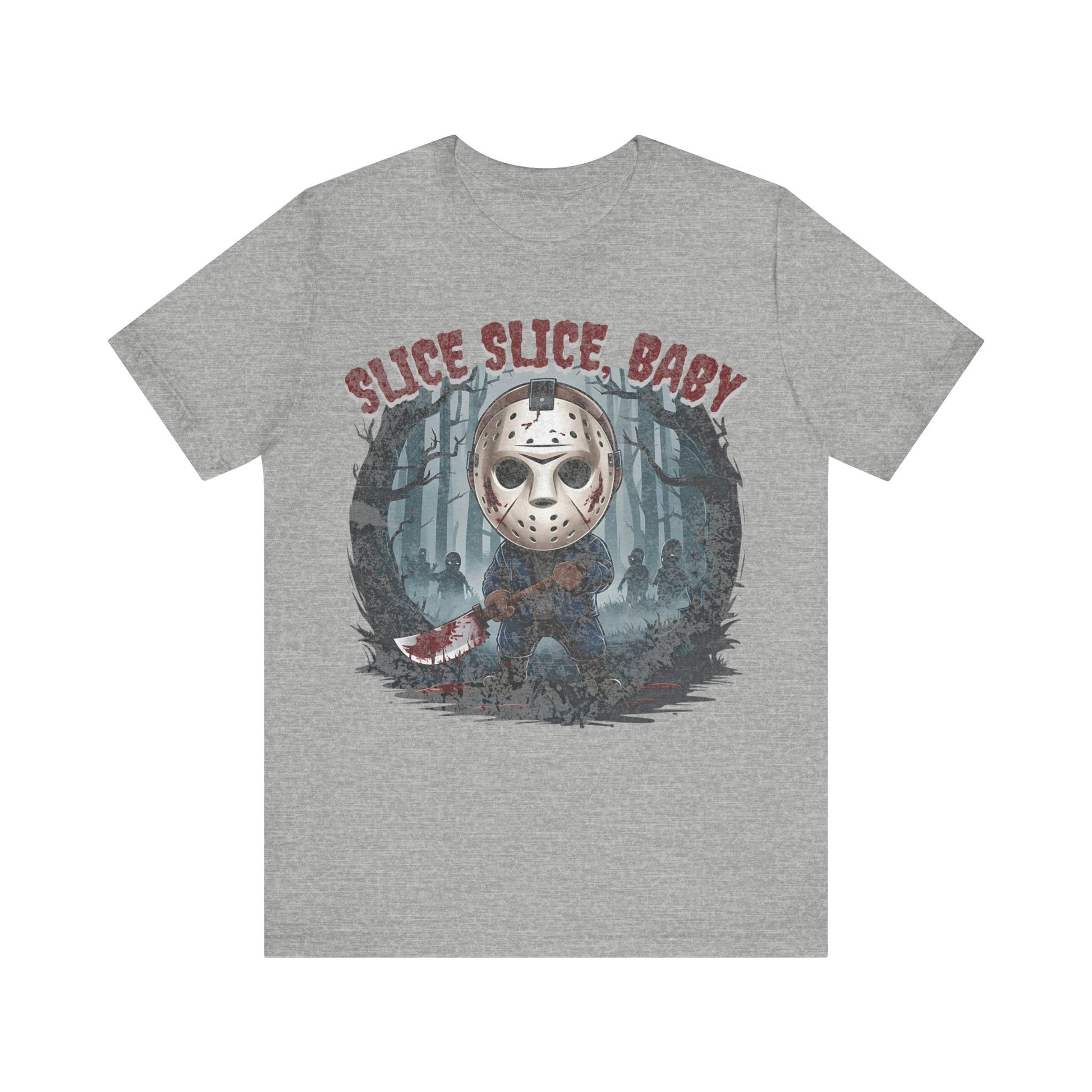 Perfect for fans of classic horror, the gritty design captures Jason’s eerie presence against a backdrop of shadowy woods and Halloween mist. Made from high-quality, soft cotton, this shirt is as comfortable as it is spooky. Ideal for your Halloween parties, horror movie marathons, or as a statement piece for any fan of the slasher genre. Available in various sizes to ensure a great fit. Dare to wear it and celebrate the frightful season with style!"