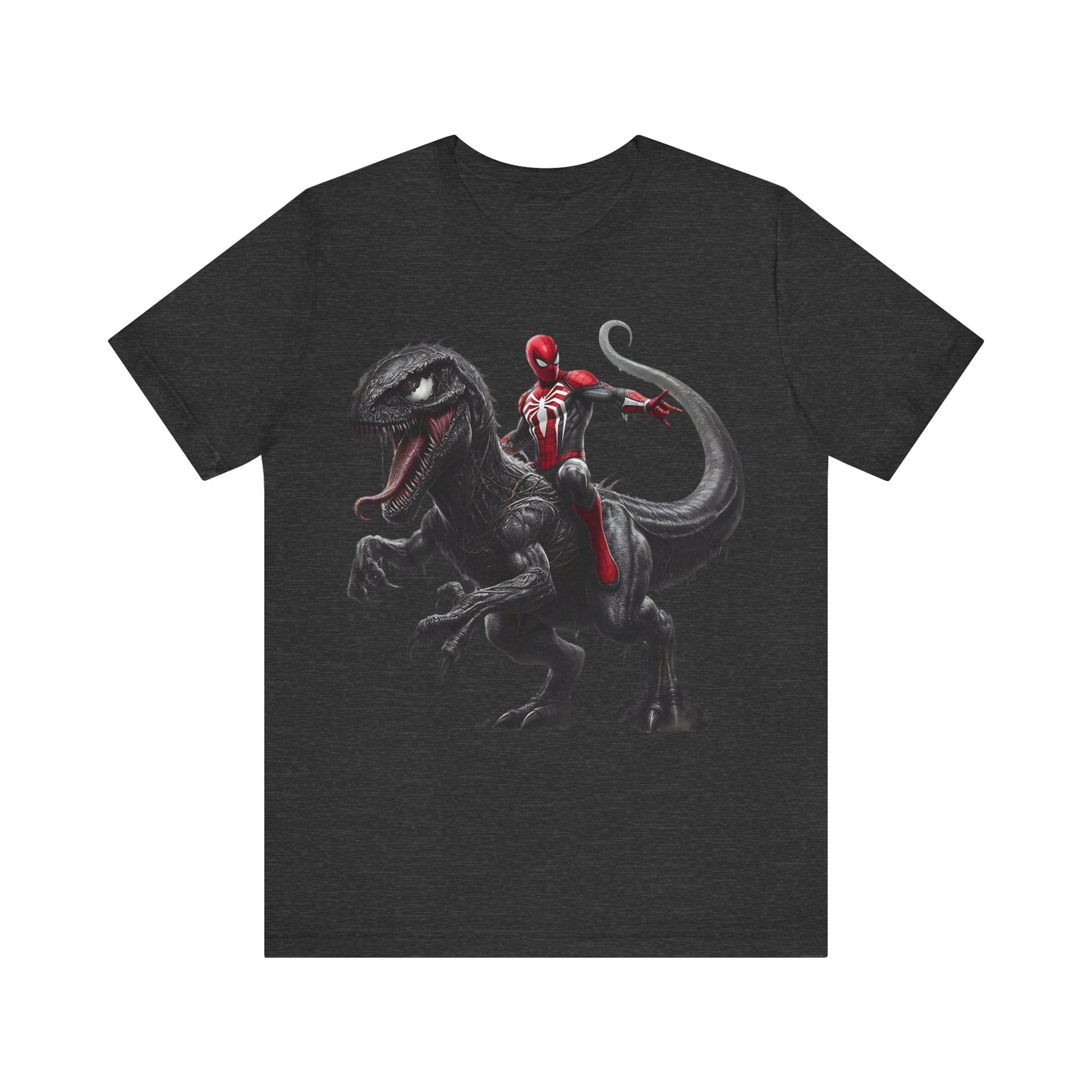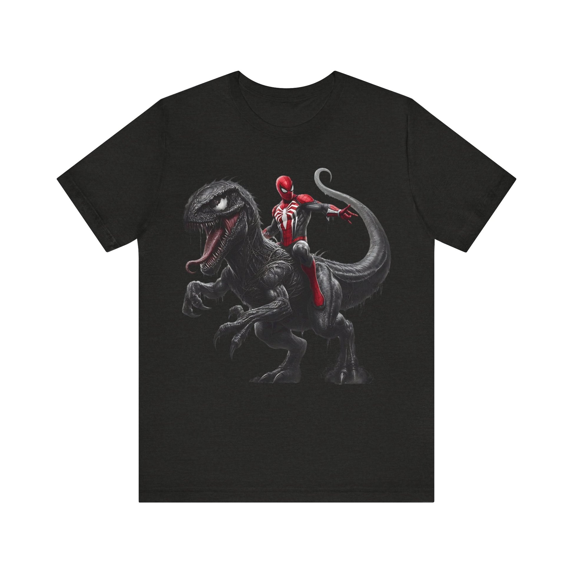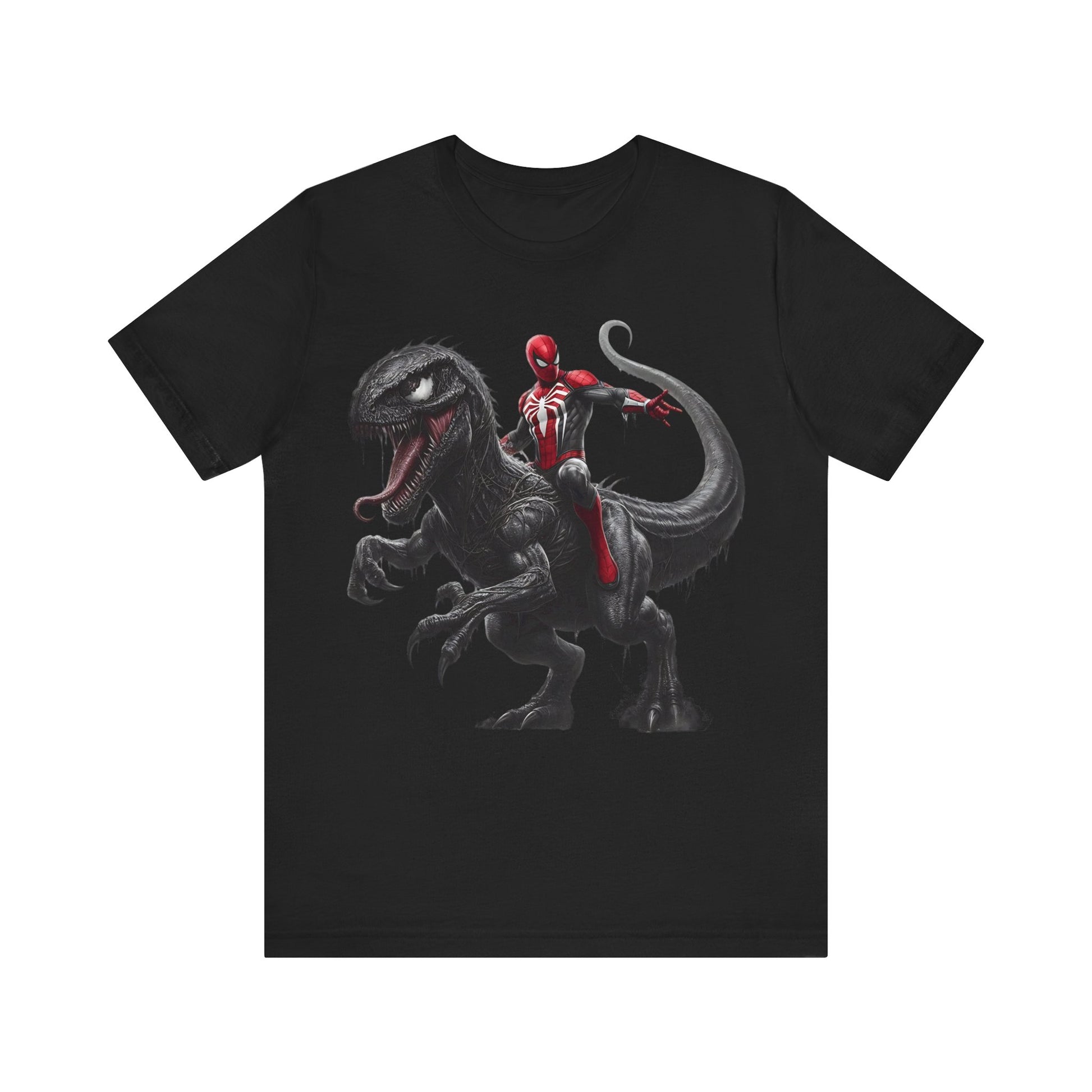 A fun and unique t-shirt featuring Spiderman riding a Venom dinosaur, perfect for comic book fans and superhero enthusiasts. This tee adds a playful touch to any outfit and is great for casual wear. Ideal for comic book conventions, Halloween, or everyday wear for fans of the characters.