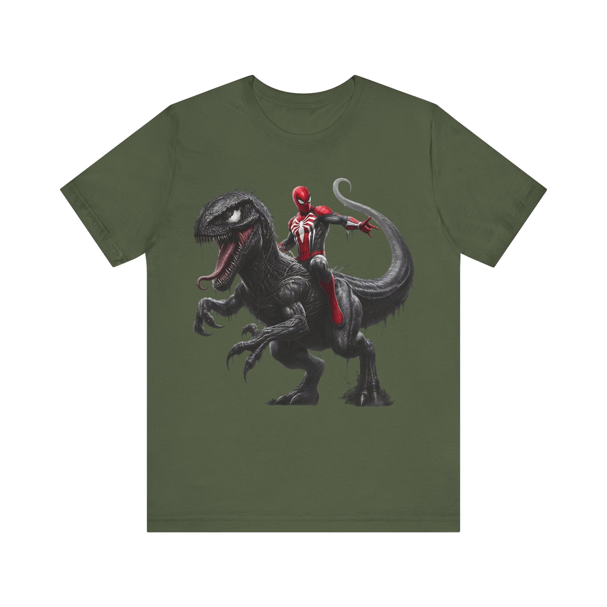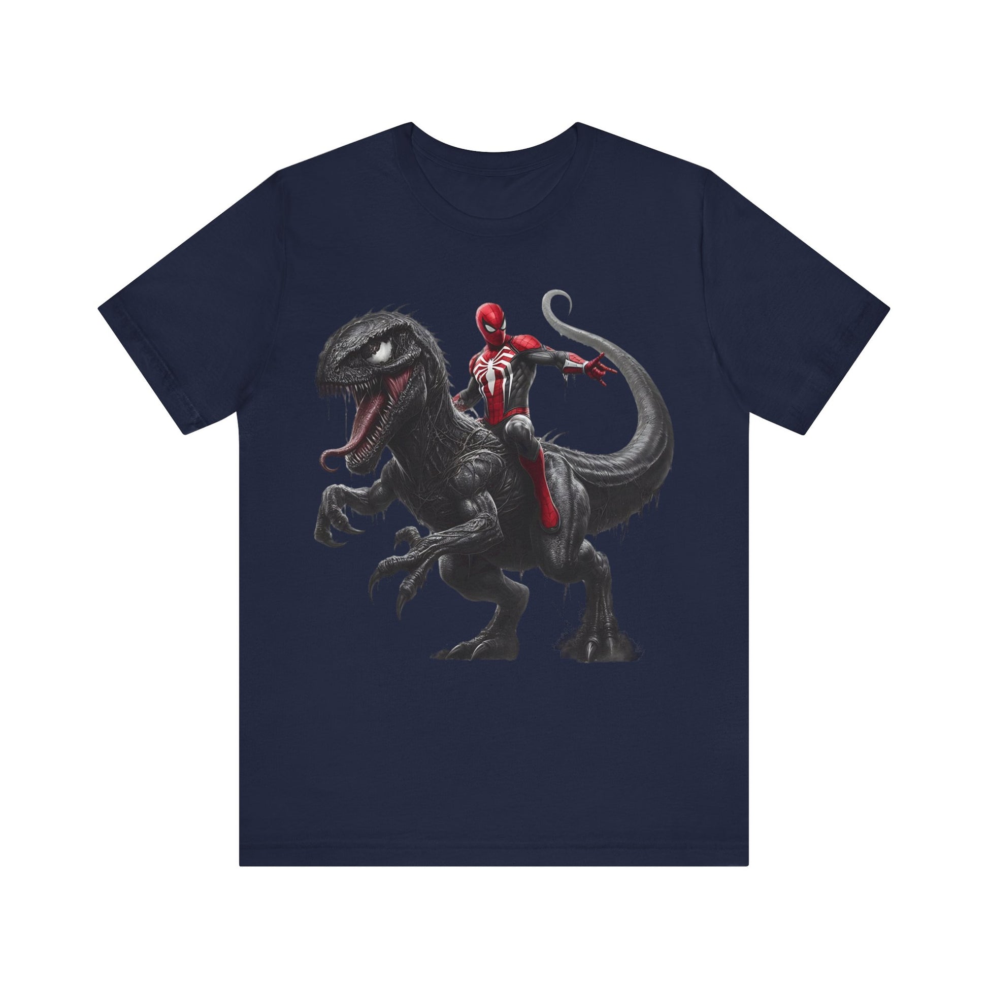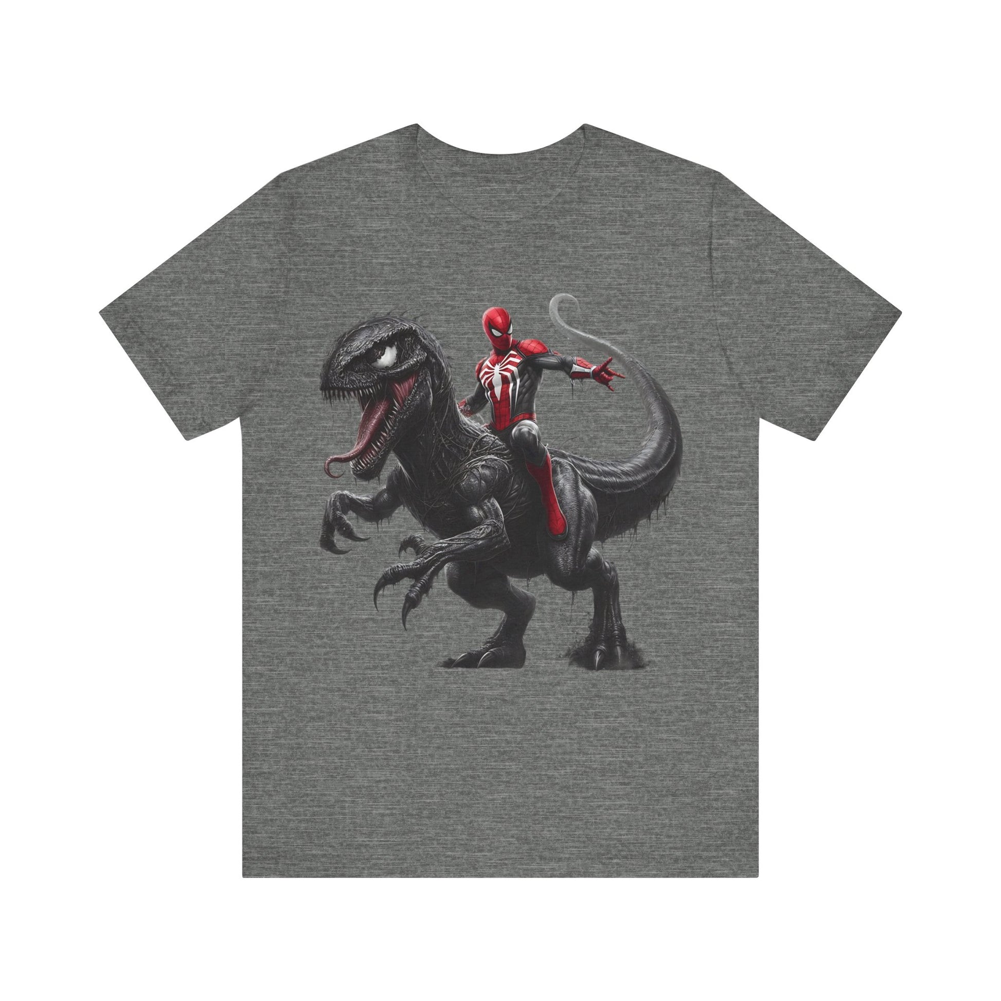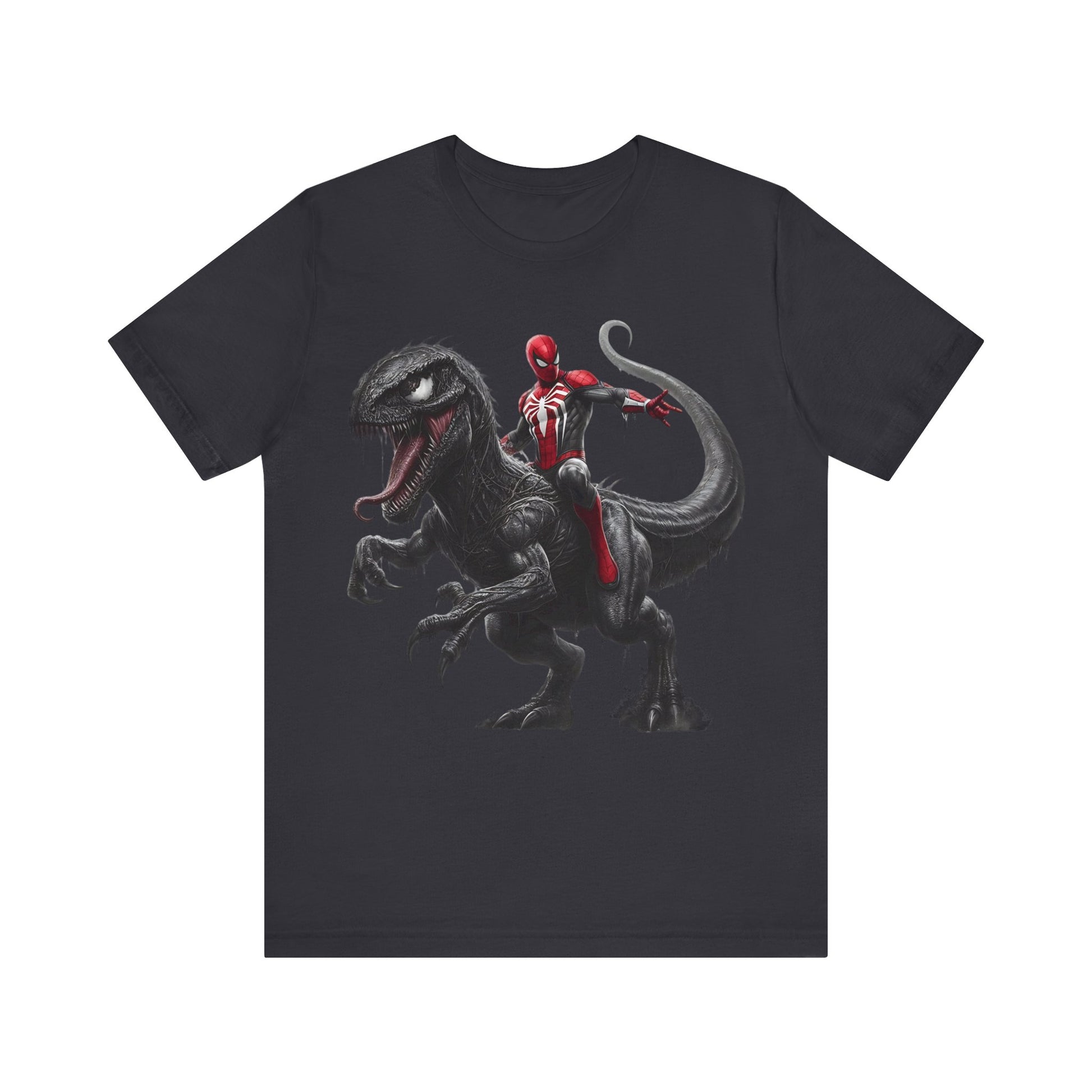A fun and unique t-shirt featuring Spiderman riding a Venom dinosaur, perfect for comic book fans and superhero enthusiasts. This tee adds a playful touch to any outfit and is great for casual wear. Ideal for comic book conventions, Halloween, or everyday wear for fans of the characters.