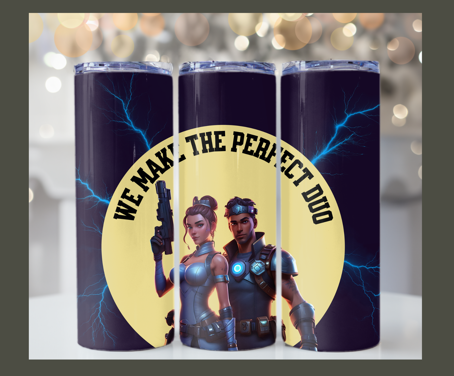 This tumbler is the perfect tribute to the unstoppable partnership you share. With the words 'We Make the Perfect Duo' elegantly displayed, it’s a romantic nod to the countless victories you’ve conquered together—both in-game and in life. Whether you're sipping your favorite drink during a gaming marathon or just reminiscing about your adventures, this tumbler is the ultimate way to keep your bond strong and your beverages cool.