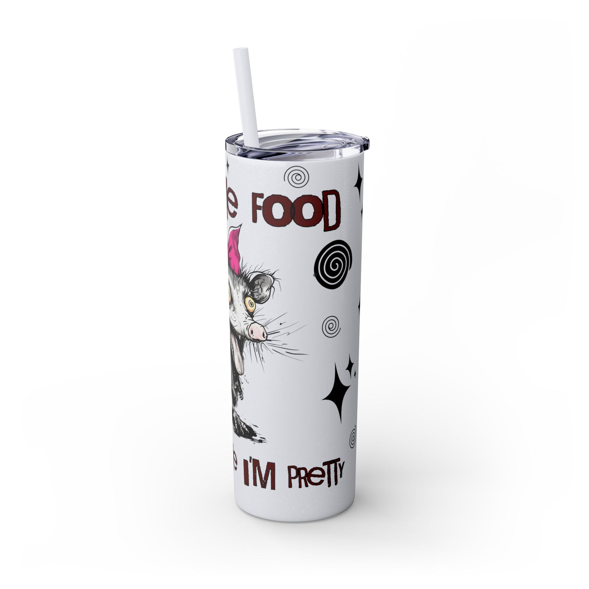 A quirky and humorous tumbler featuring a possum with the text 'give me food and tell me I'm pretty'. Perfect for those who enjoy unique and funny designs, this tumbler adds a touch of whimsy to your daily routine. Ideal for animal lovers and those with a sense of humor, it makes a great gift for birthdays, holidays, or just because.