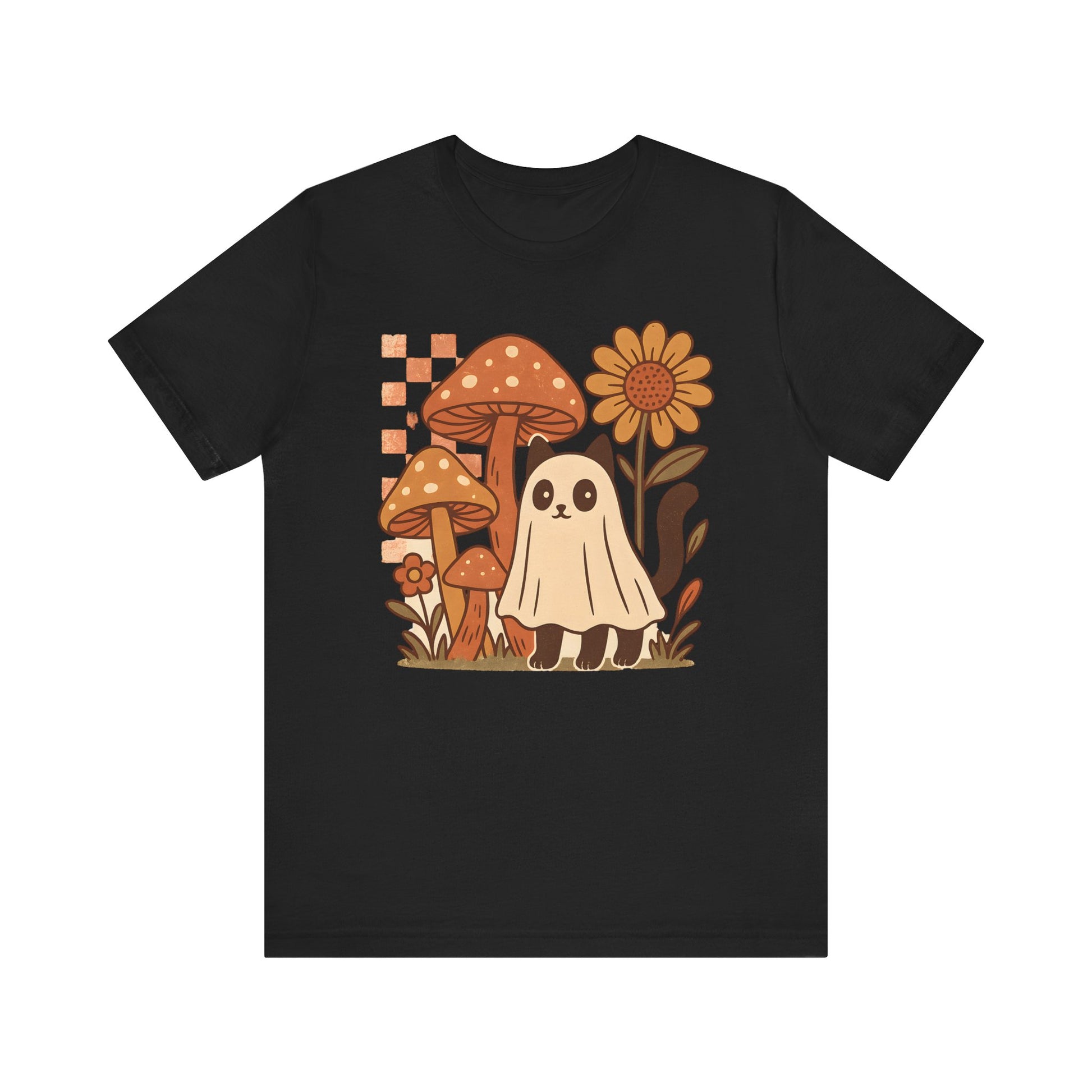 Whimsical Mushroom Tee, Cute Ghost cat, Short Sleeve T-Shirt, Fall Fashion, Halloween Gift, Nature Lover's Apparel