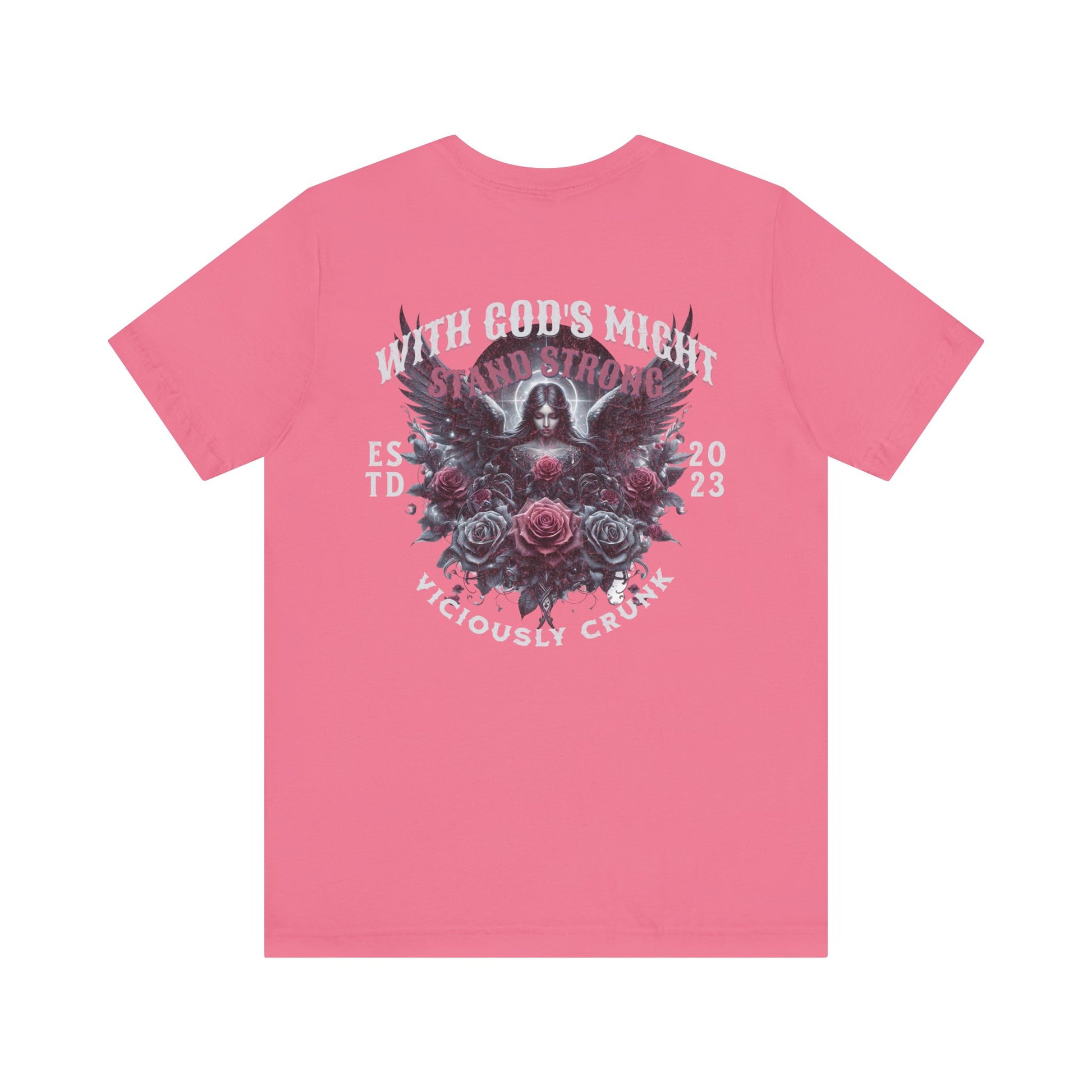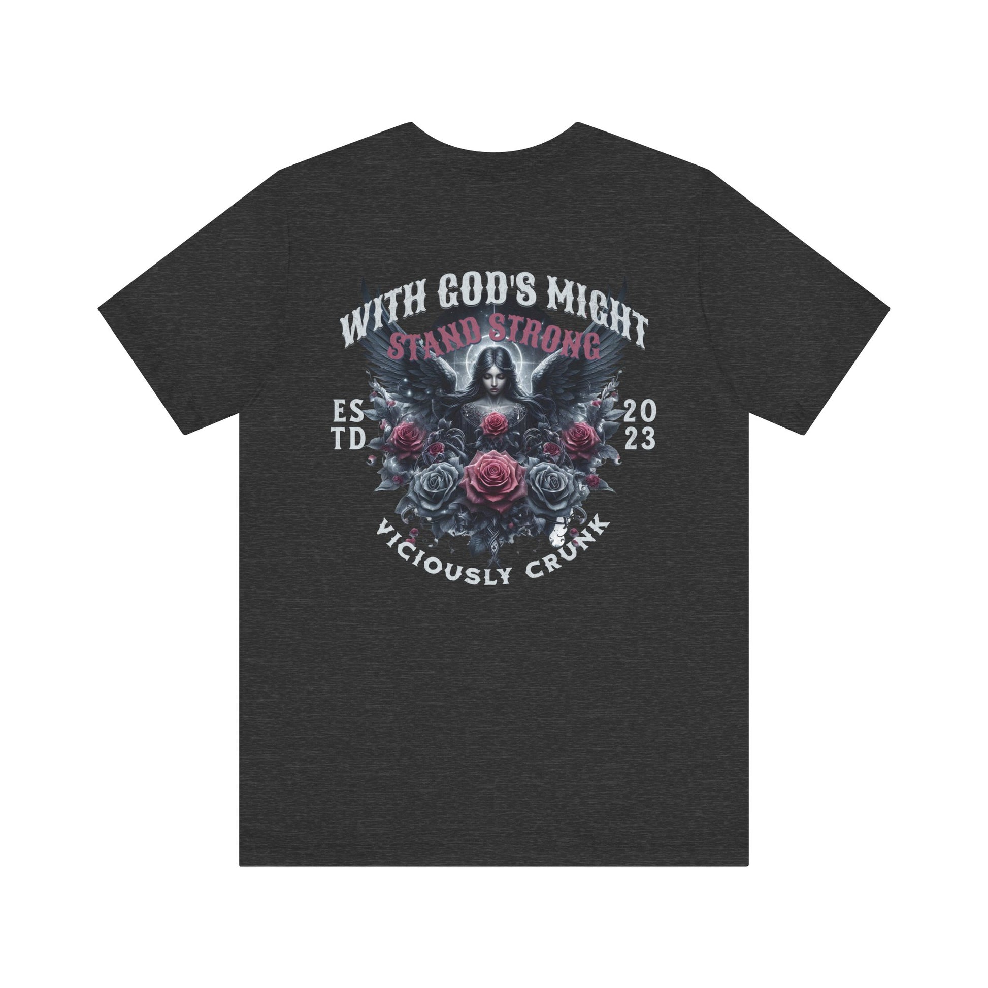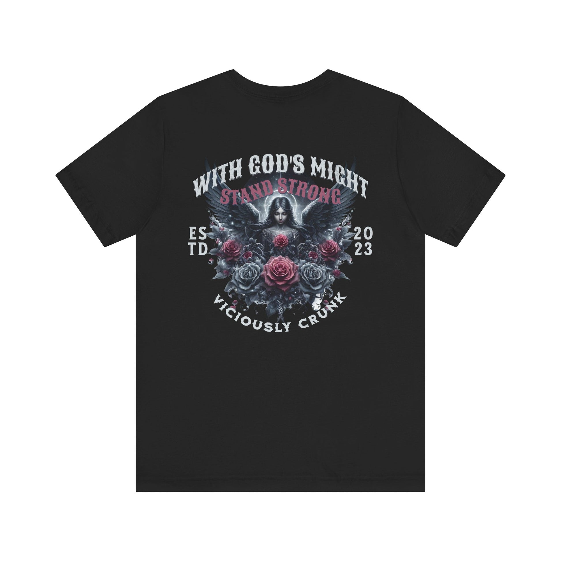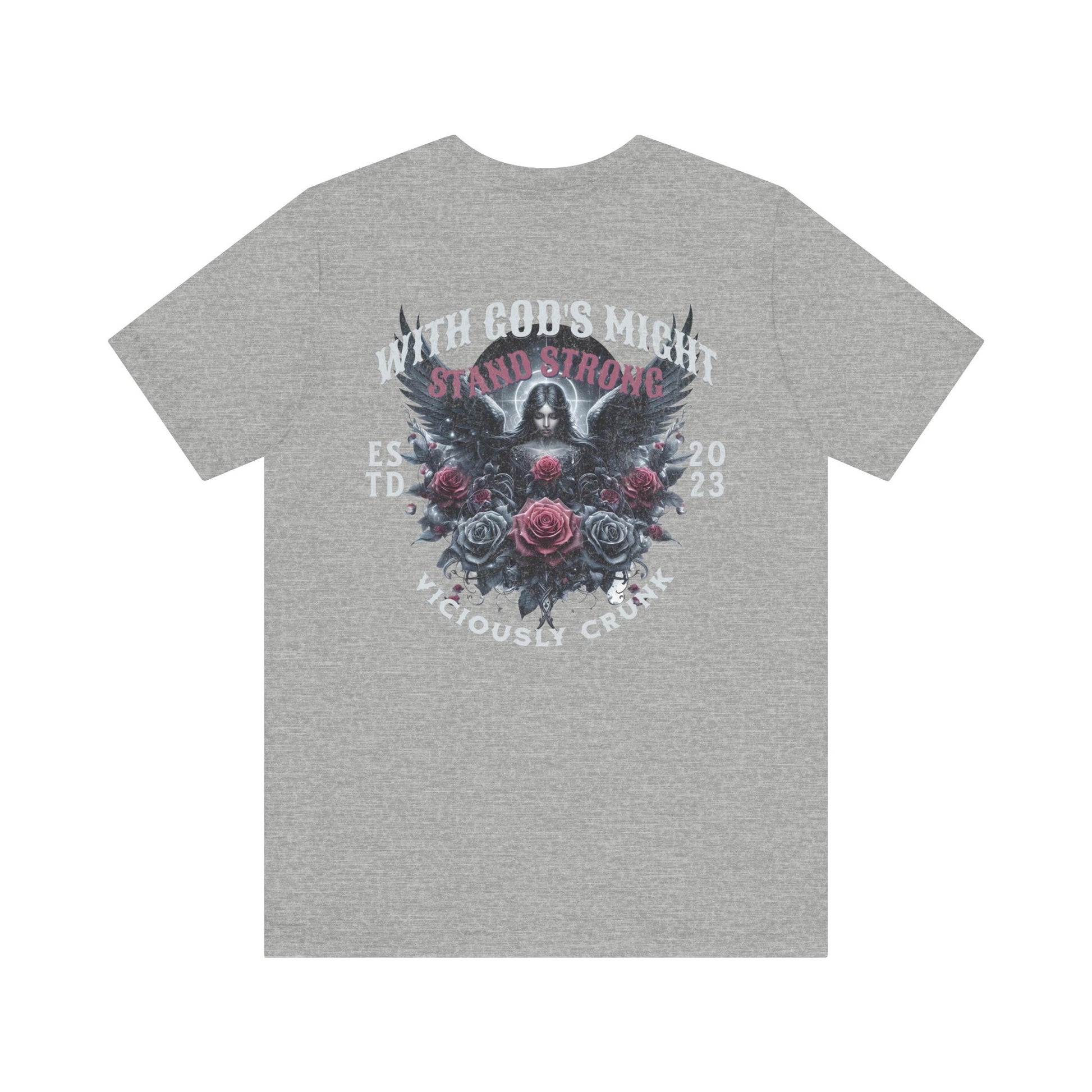 A unisex jersey short sleeve tee with the empowering message 'with gods might stand strong'. This shirt exudes strength and resilience, making it perfect for those who seek inspiration and confidence in their daily lives. Ideal for casual wear or as a statement piece for special occasions and celebrations.